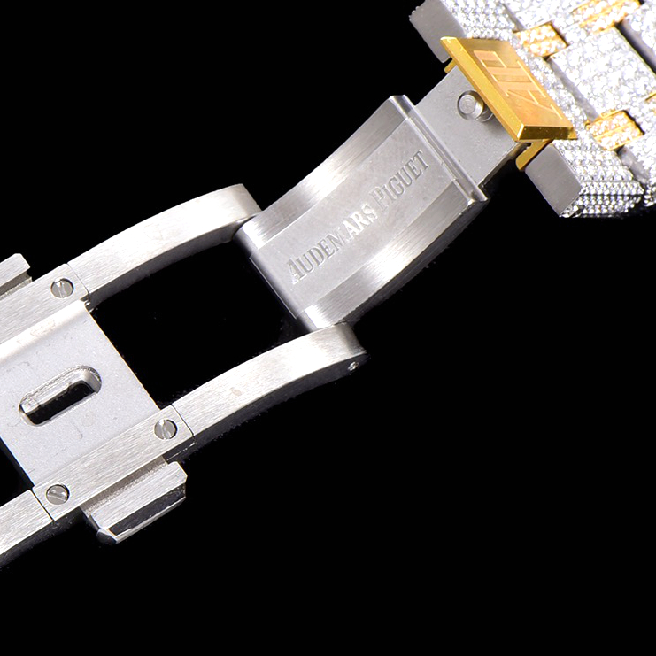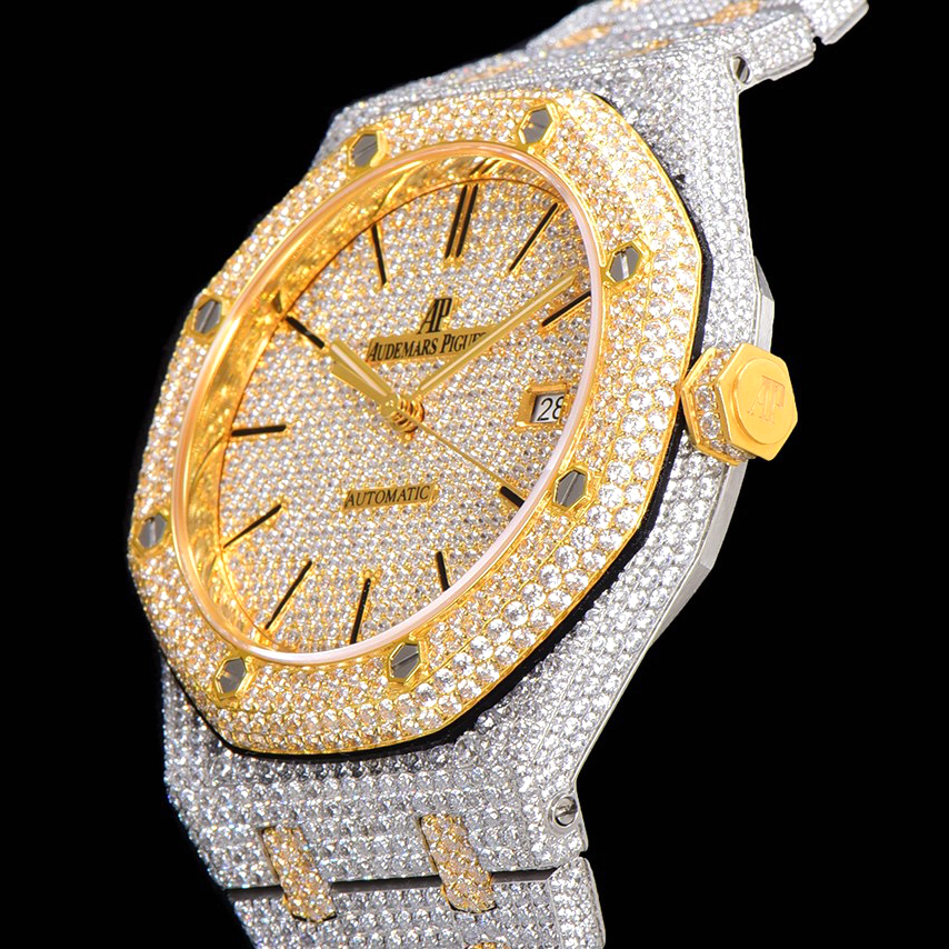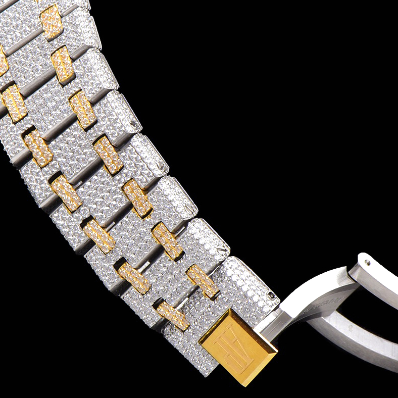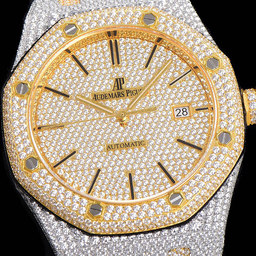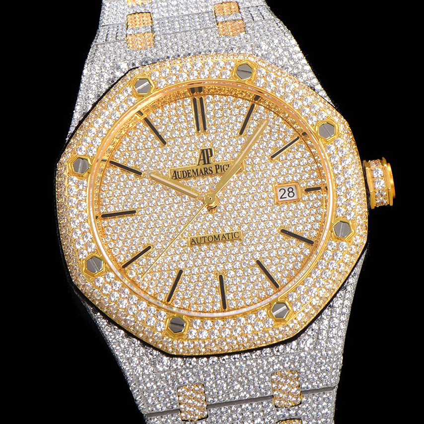 We use Rhinestone or Zircon for our iced out watches, and all our diamond watches feature high-quality movement with a super clone standard. If you prefer real moissanite, the watch will cost $3000-4000 and will pass testing with cert.