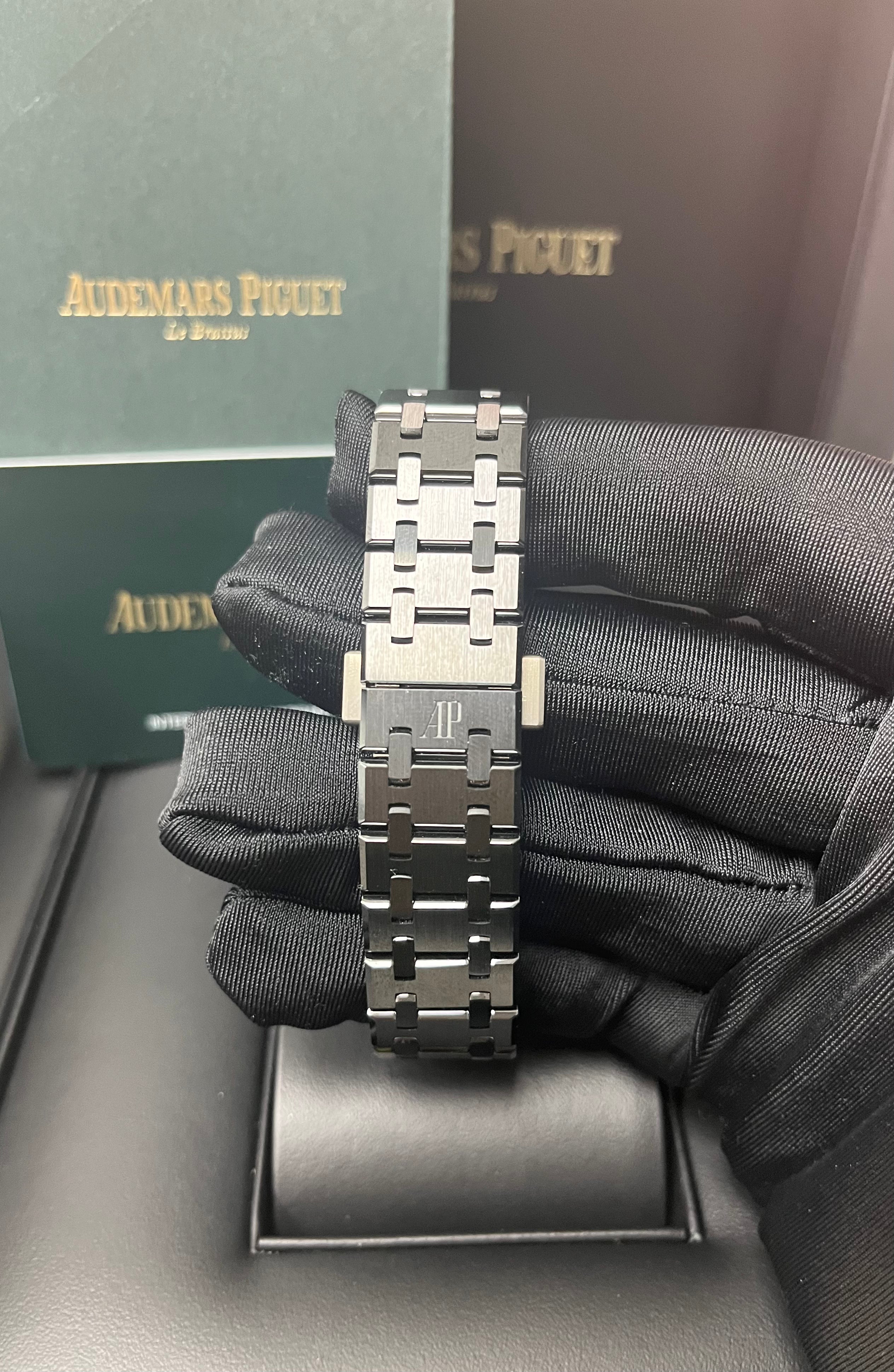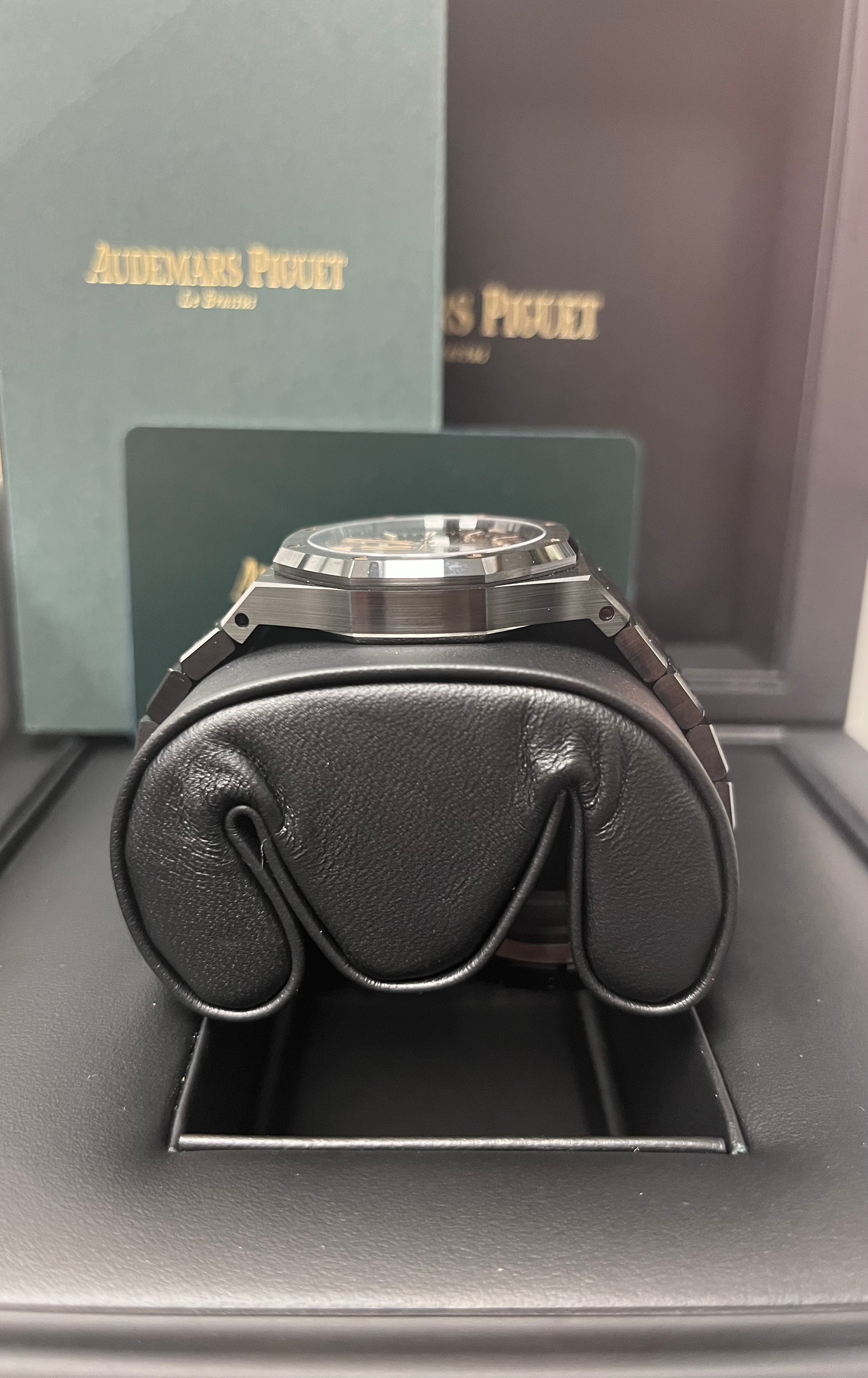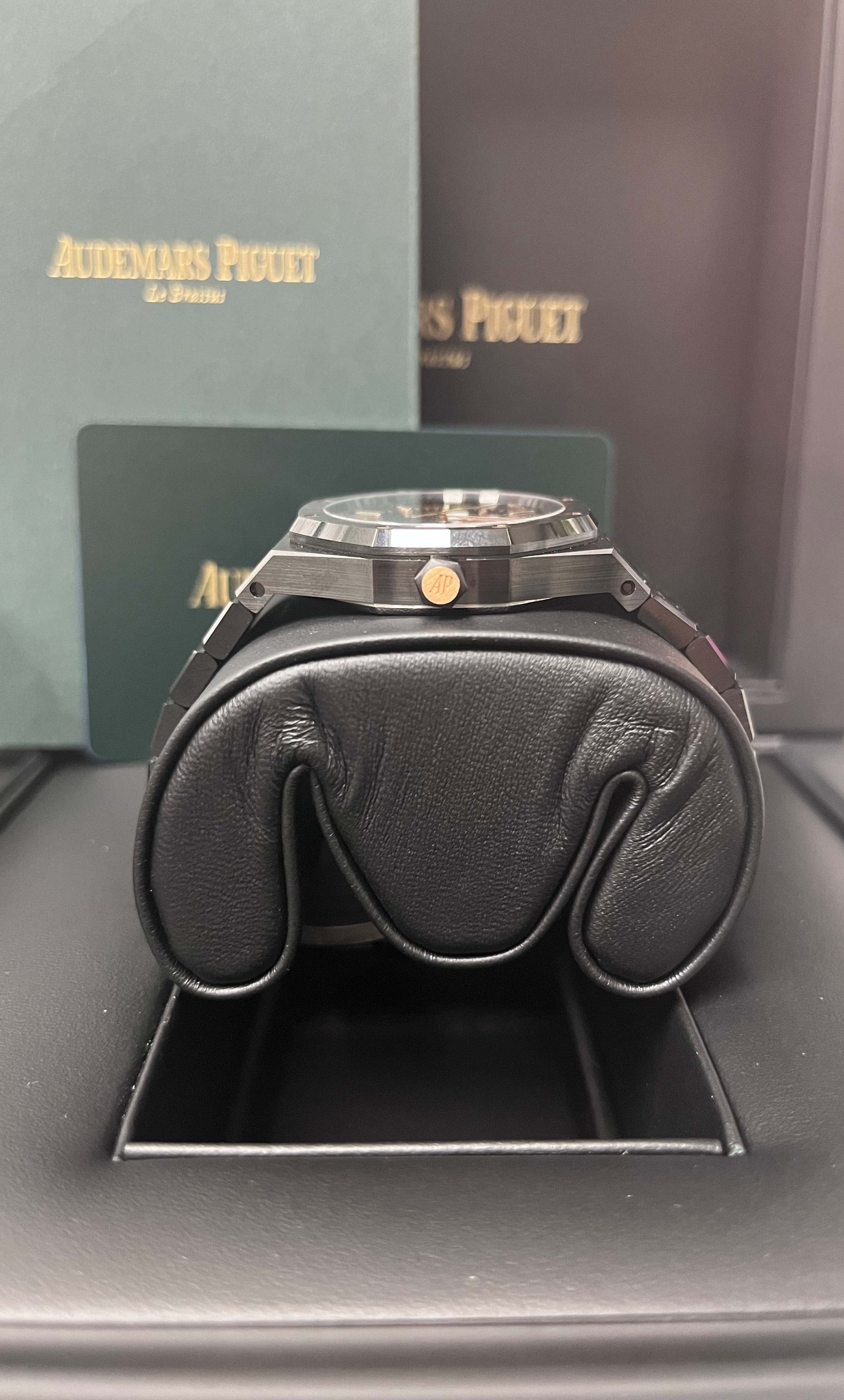 This 34 mm Royal Oak Selfwinding limited edition in black ceramic is the fruit of the Manufacture's latest collaboration with Carolina Bucci. For the occasion. the jewellery designer has created a dial endowed with a unique multi-coloured mirror effect paying tribute to the iconic Tapisserie design. Black ceramic case. glareproofed sapphire crystal and titanium sapphire caseback. Rainbow-coloured sapphire dial with polished mirror effect showcasing the Tapisserie geometry. pink gold Royal Oak hour-markers and hands. Black ceramic bracelet with AP folding clasp.