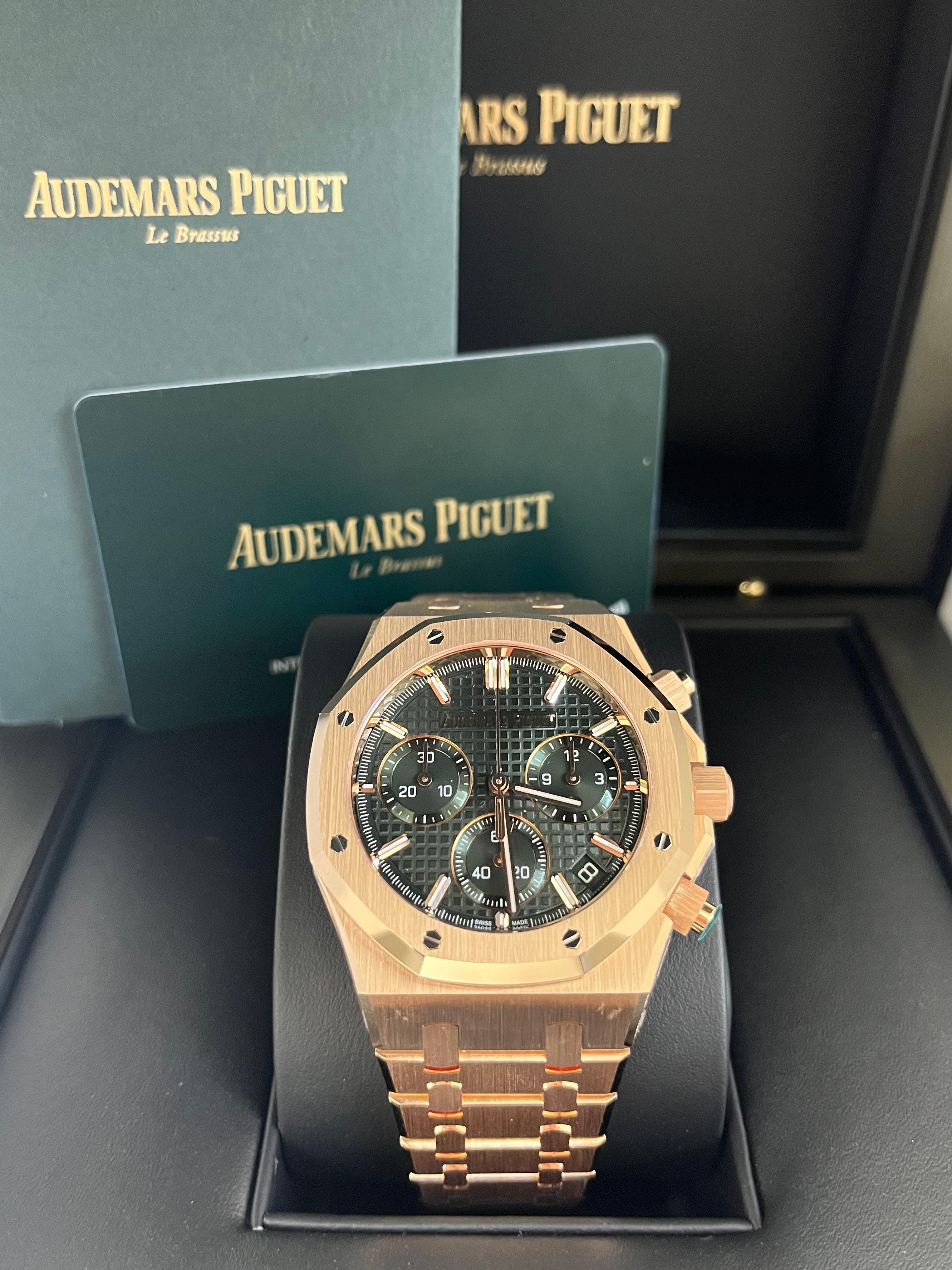 This 41 mm Selfwinding Chronograph marries 18-carat pink gold with a khaki "Grande Tapisserie" dial. It is endowed with the Royal Oak design evolution debuted in 2022. 18-carat pink gold case. glareproofed sapphire crystal and caseback. screw-locked crown.Khaki green dial with “Grande Tapisserie�?pattern. khaki green counters. pink gold applied hour-markers and Royal Oak hands with luminescent coating. |