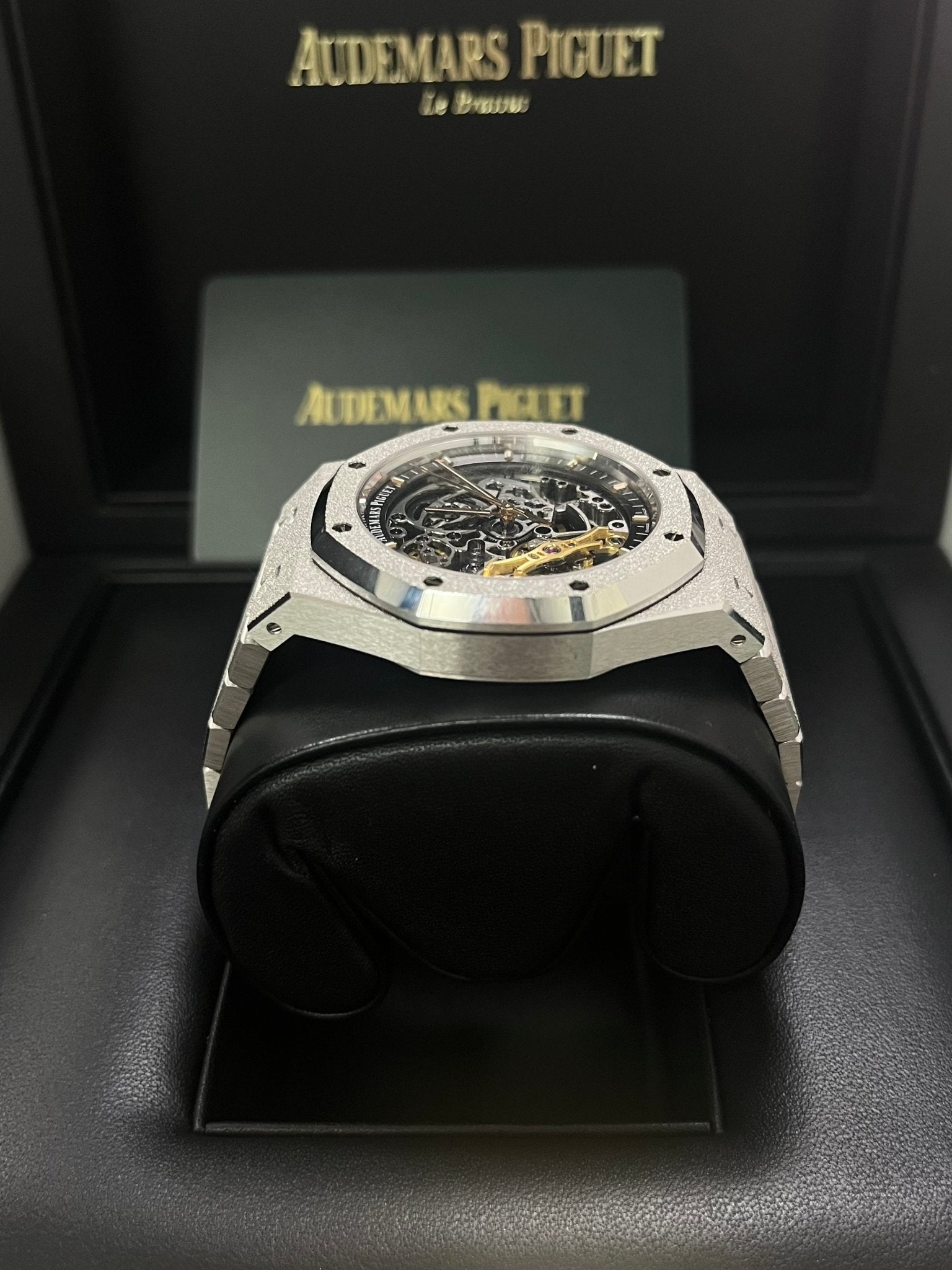 The 18-carat white gold case glittering with Frosted Gold enhances the artistry of the openworked dial. The double balance wheel. visible on both sides of the watch. improves accuracy. Hammered 18-carat white gold case. glareproofed sapphire crystal and caseback. screw-locked crown. Openworked slate grey dial. pink gold applied hour-markers and Royal Oak hands with luminescent coating. Hammered 18-carat white gold bracelet with AP folding clasp.