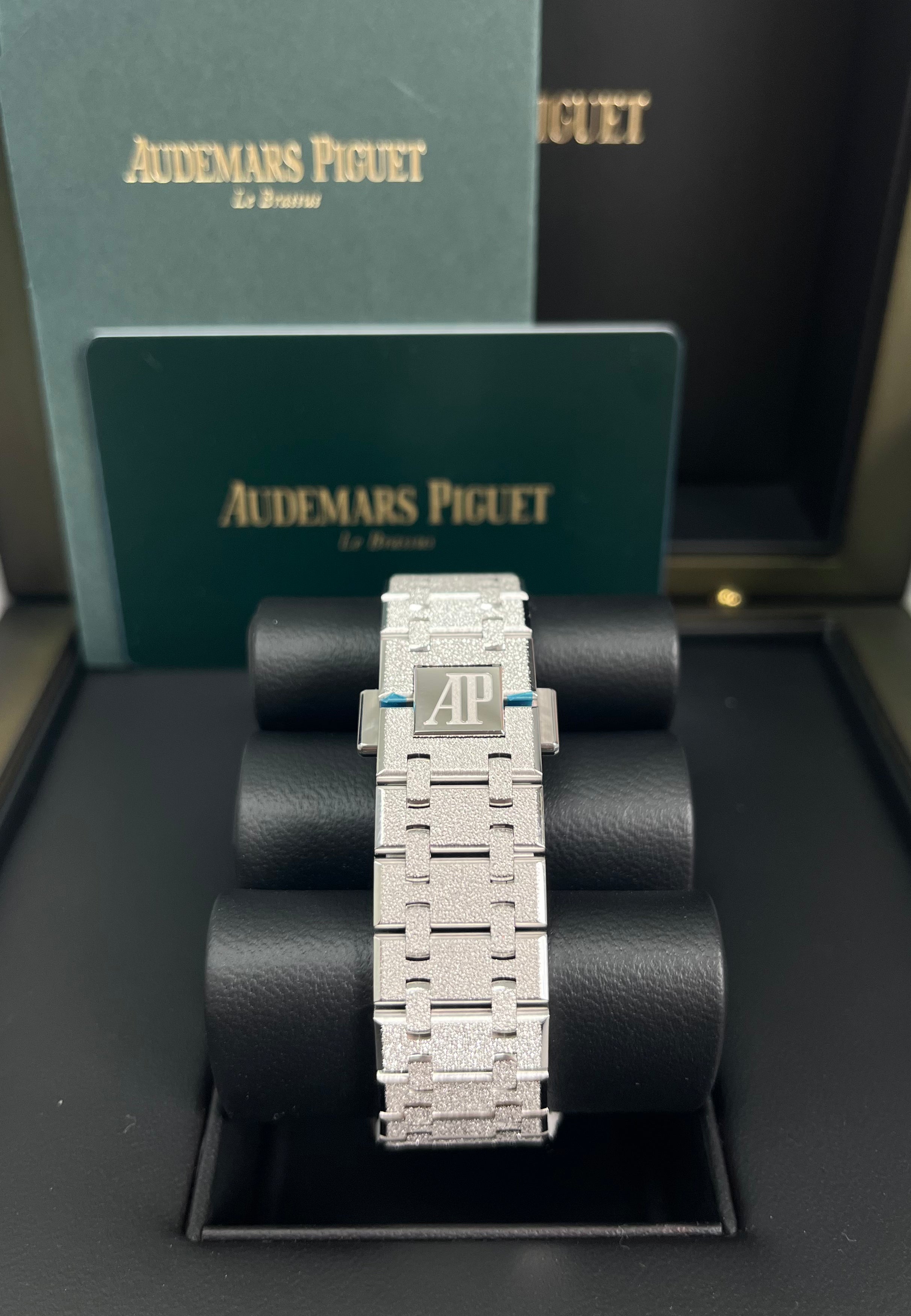 Aesthetics. precision and balance come together in the patented geometry of the Royal Oak Double Balance Wheel Openworked. The complex mechanism is visible from both sides of this 37mm white gold watch featuring the scintillating Frosted Gold finishing. Hammered 18-carat white gold case. glareproofed sapphire crystal and caseback. screw-locked crown. Openworked rhodium-toned dial. pink gold applied hour-markers and Royal Oak hands with luminescent coating. Hammered 18-carat white gold bracelet with AP folding clasp.