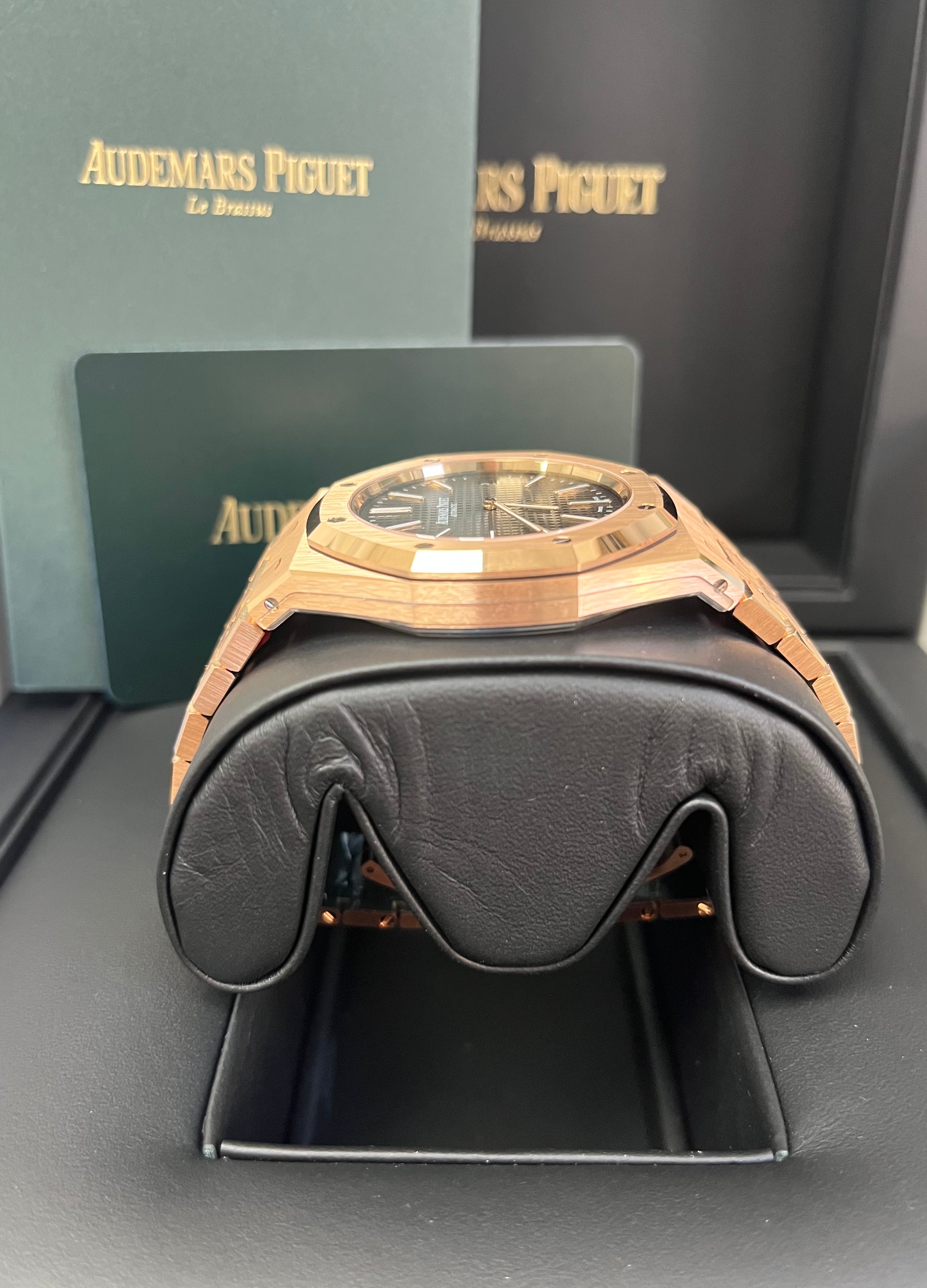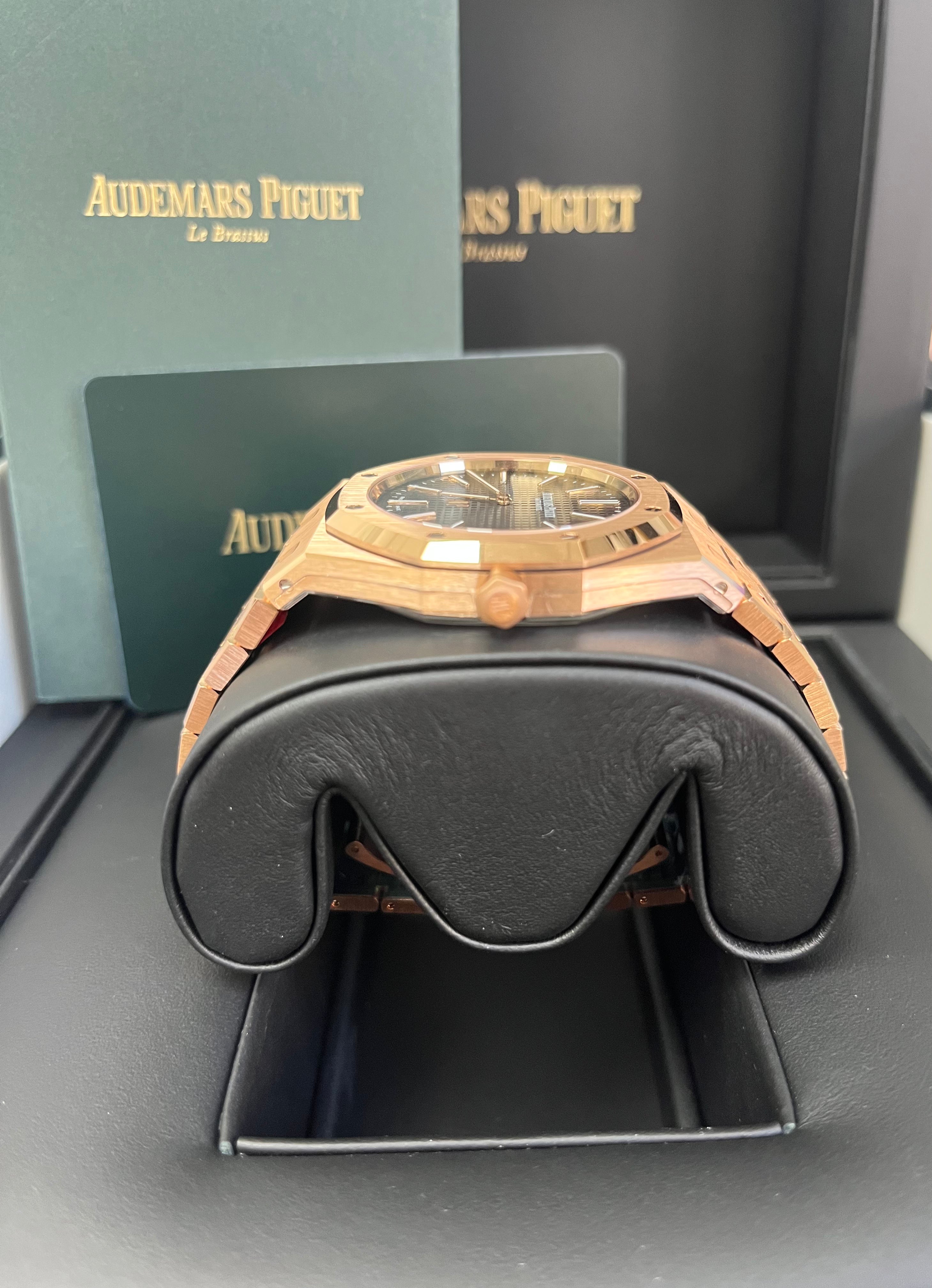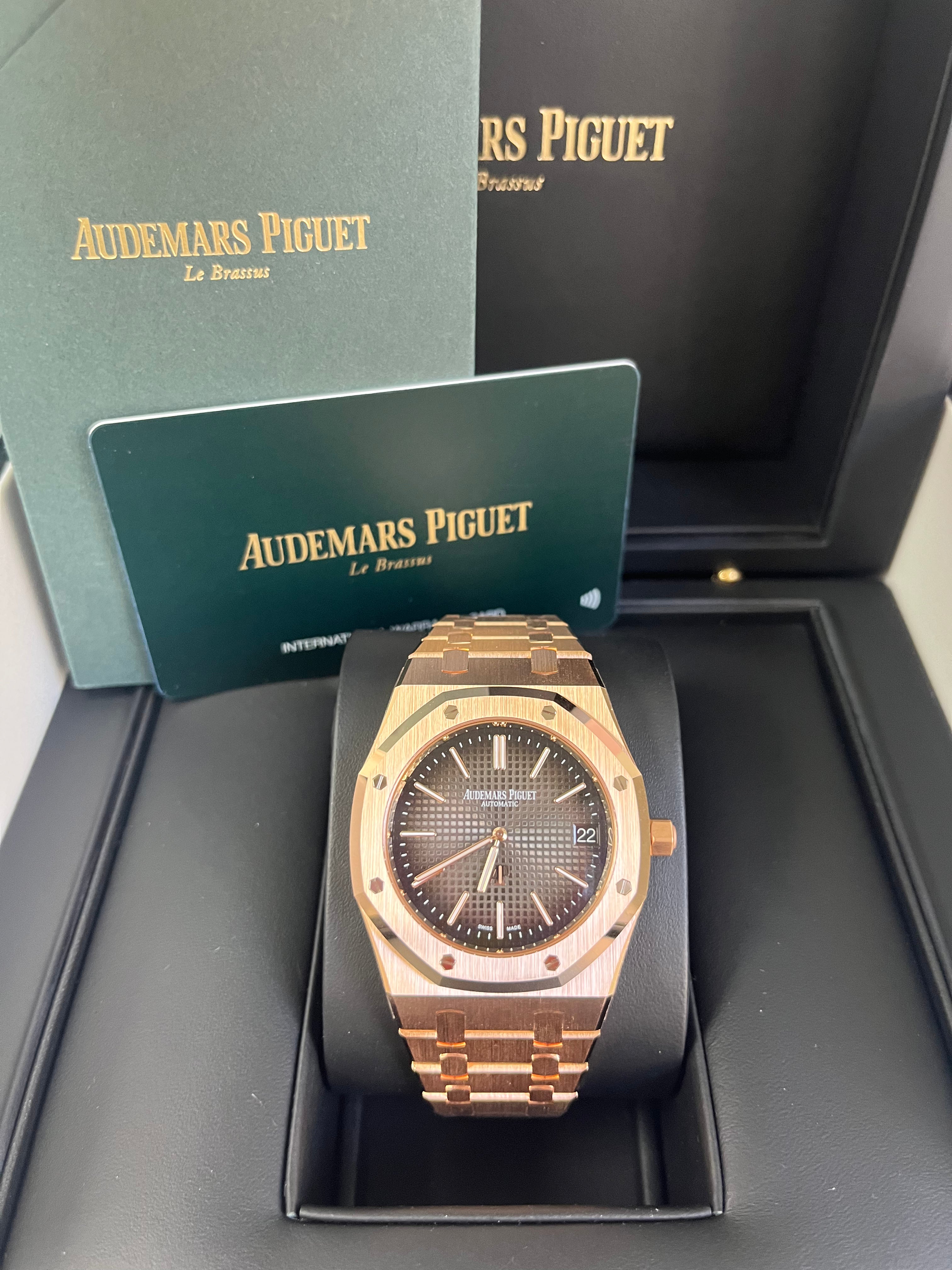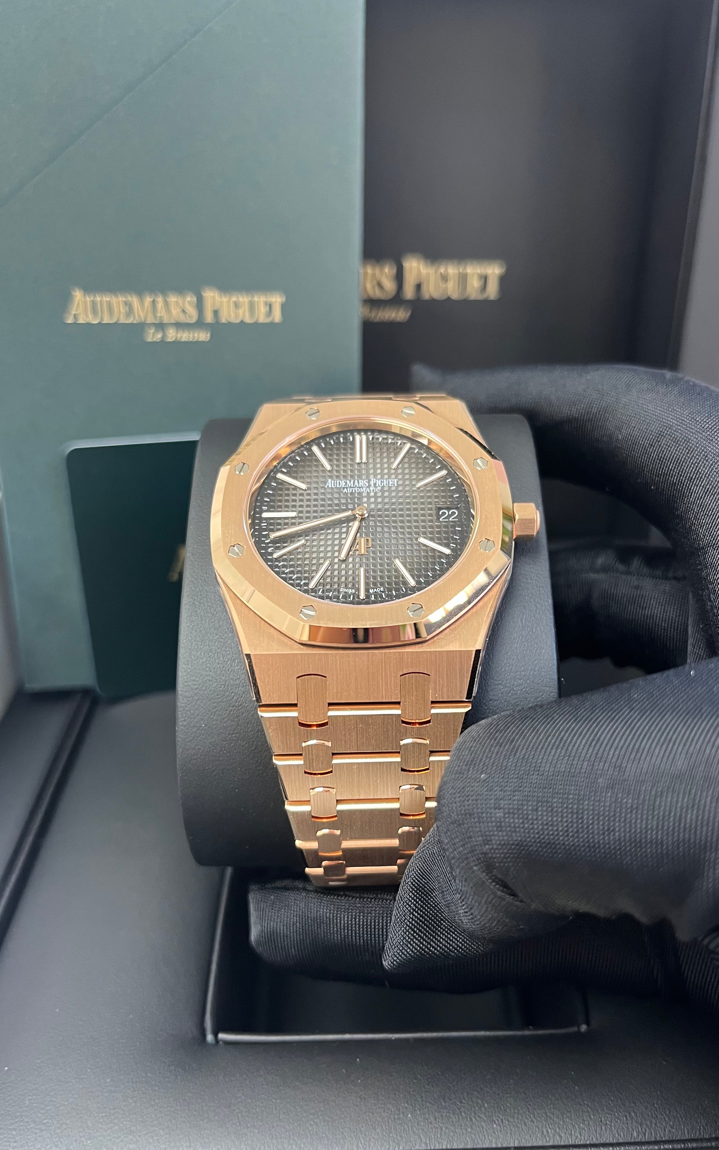 This “Jumbo�?model marries the Royal Oak's original aesthetic codes with a pink gold body and smoked slate grey “Petite Tapisserie�?dial. It houses the latest selfwinding movement. Calibre 7121. 18-carat pink gold case. glareproofed sapphire crystal and caseback. Smoked grey dial with “Petite Tapisserie�?pattern. pink gold applied hour-markers and Royal Oak hands with luminescent coating. 18-carat pink gold bracelet with AP folding clasp.