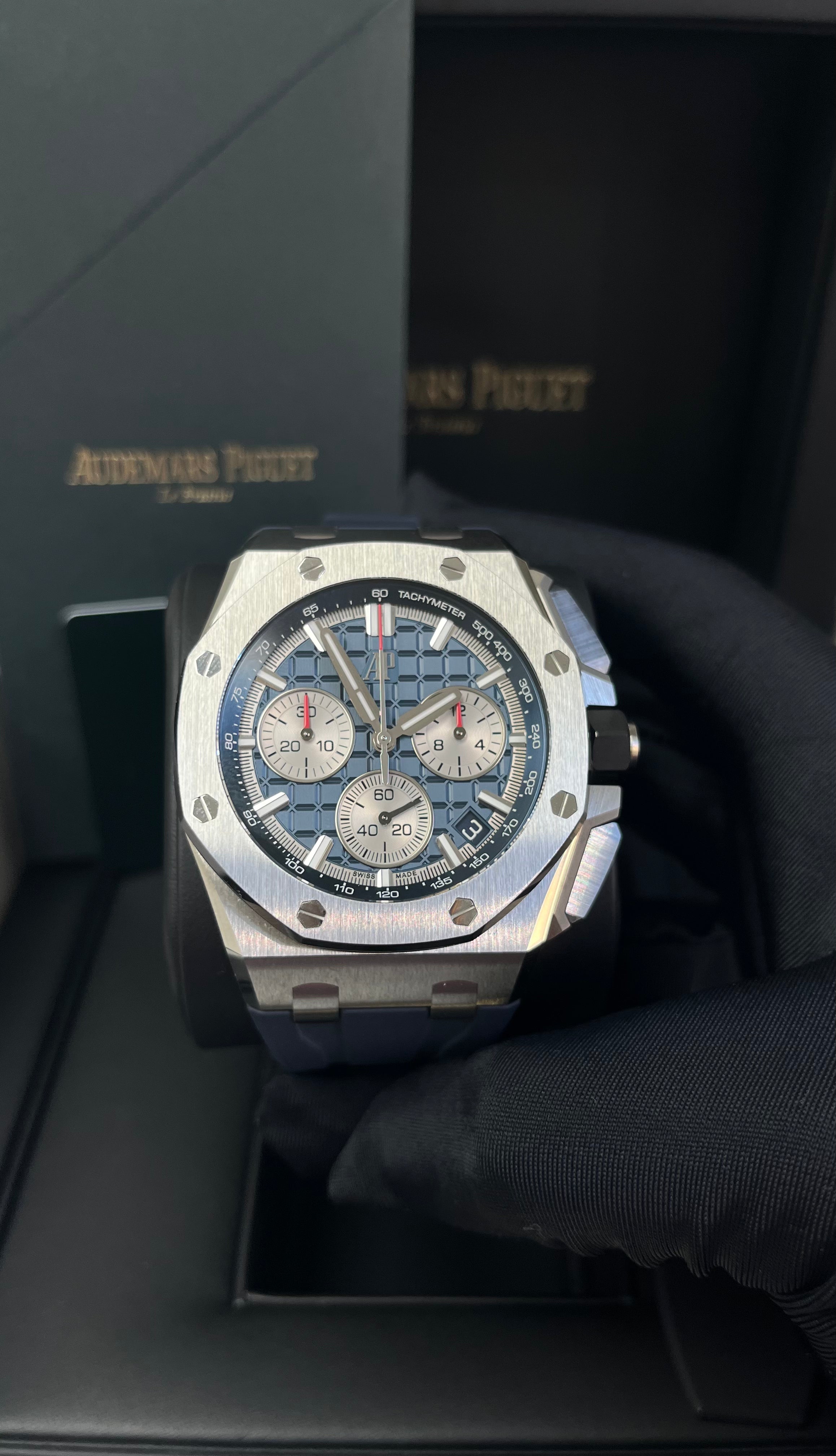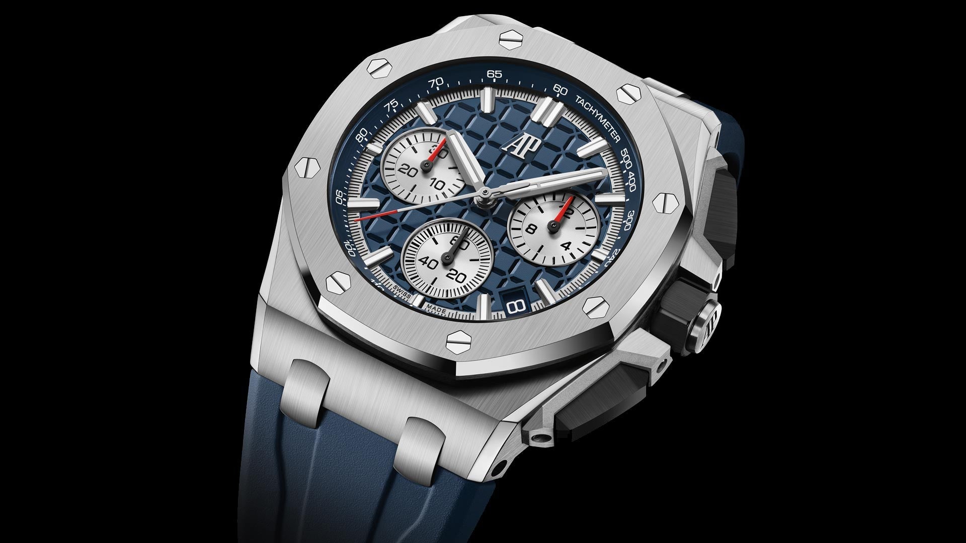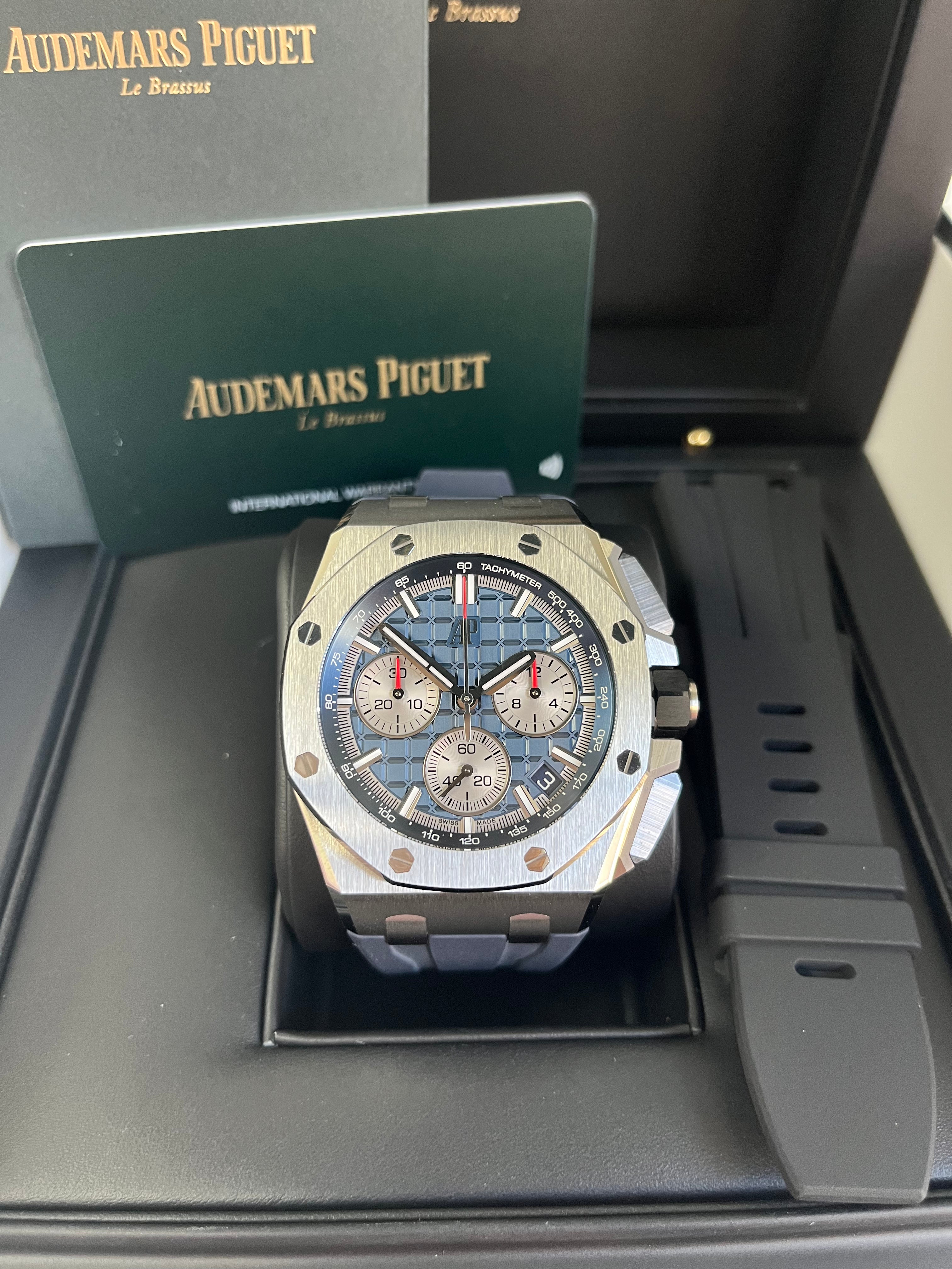 This all-titanium Royal Oak Offshore in 43 mm sports a blue "Méga Tapisserie" dial with high-end finishing as well as the Manufacture's interchangeable strap system and latest integrated flyback chronograph. Titanium case and bezel. glareproofed sapphire crystal and caseback. black ceramic pushpieces and screw-locked crown. sandblasted titanium pushpiece guards. Blue dial with “Méga Tapisserie�?pattern. rhodium-toned counters and external zone. white gold applied hour-markers and Royal Oak hands with luminescent coating. blue inner bezel. Blue rubber strap with titanium AP pin buckle and interchangeable strap system. Additional black rubber strap.