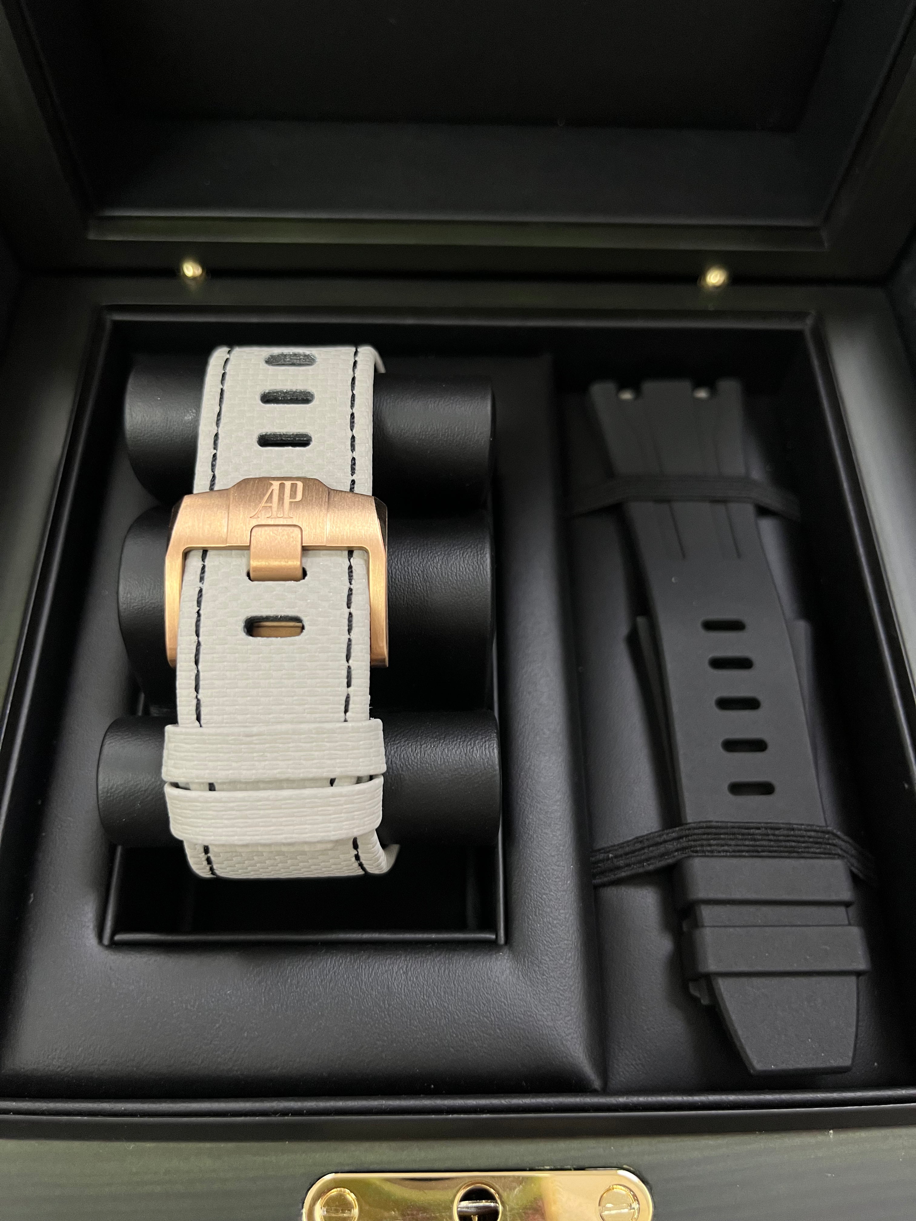 Grey calfskin strap with 18-carat pink gold pin buckle and interchangeable strap system. Additional black rubber strap.