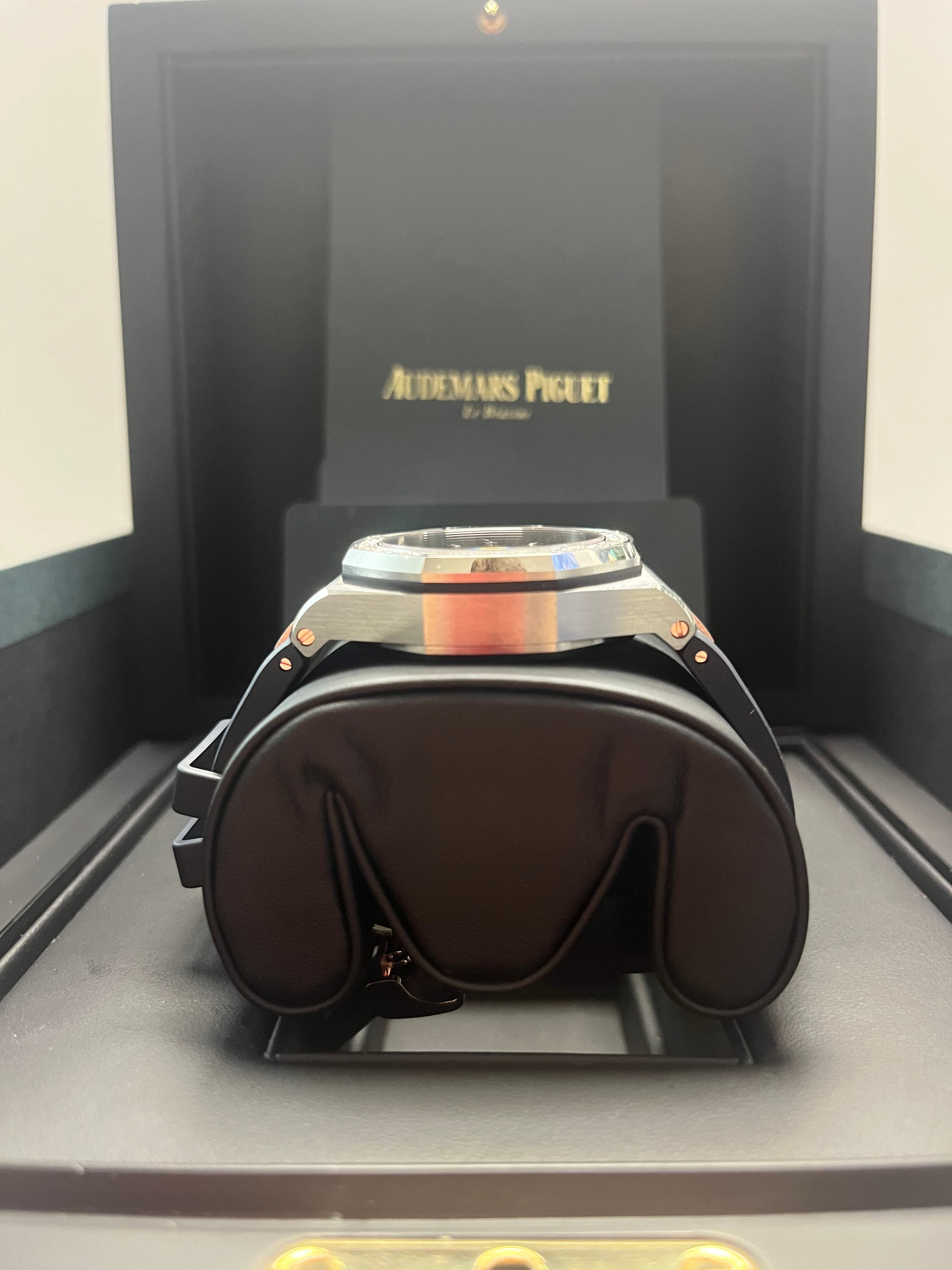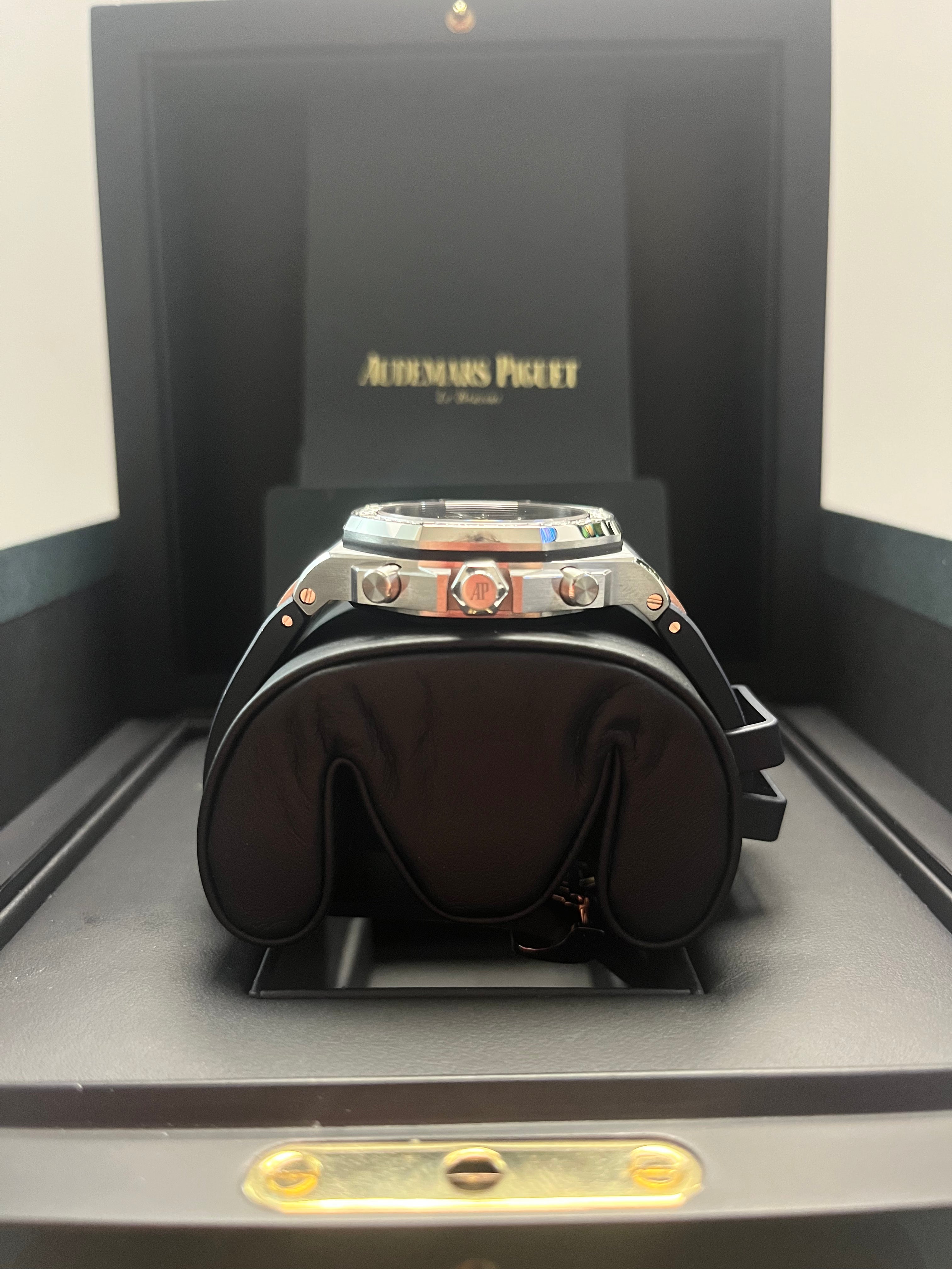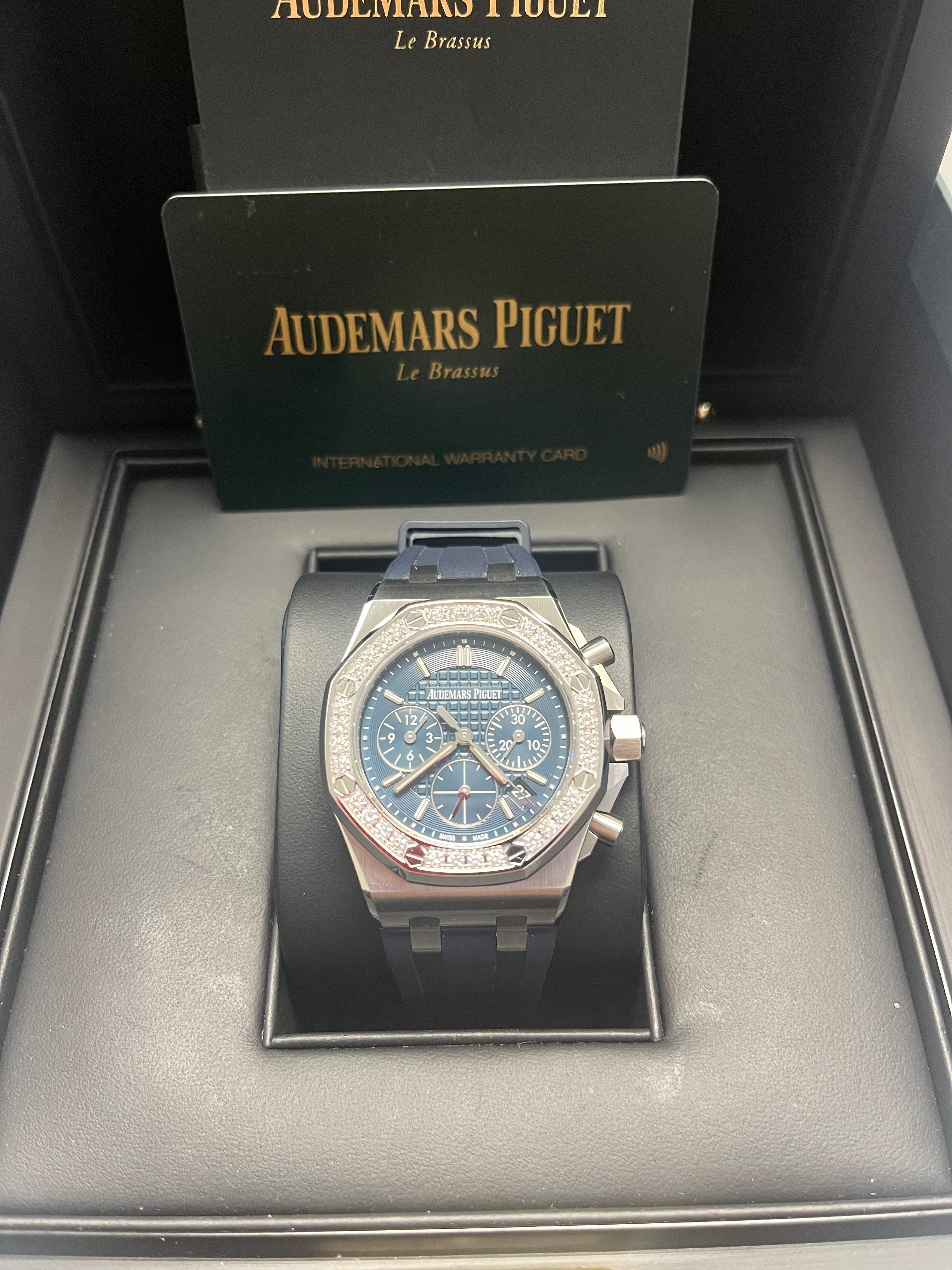 Stainless steel case with a blue rubber strap. Fixed (8 screw) stainless steel bezel set with 32 diamonds. Blue (tapisserie) dial with luminous silver-tone hands and index hour markers. Minute markers around the outer rim. Dial Type: Analog. Luminescent hands and markers. Date display between the 4 and 5 o'clock positions. Chronograph - three sub-dials displaying: 60 second. 30 minute and 12 hour. Audemars Piguet calibre 2385 automatic movement. containing 37 Jewels. composed of 304 parts. bitting at 21600 vph. and has a power reserve of approximately 40 hours. Scratch resistant sapphire crystal. Screw down crown. Solid case back. Octagon case shape. Case size: 37 mm. Case thickness: 11.8 mm. Fold over (audemars piguet) clasp. Water resistant at 50 meters / 165 feet. Functions: chronograph. column wheel. date. hour. minute. small second. Additional Info: bezel set with 32 brilliant-cut diamonds ; ~1.02 carats. Royal Oak Offshore Series. Luxury watch style. Watch label: Swiss Made. Audemars Piguet Automatic Diamond Blue Dial Ladies Watch 26231ST.ZZ.D027CA.01.