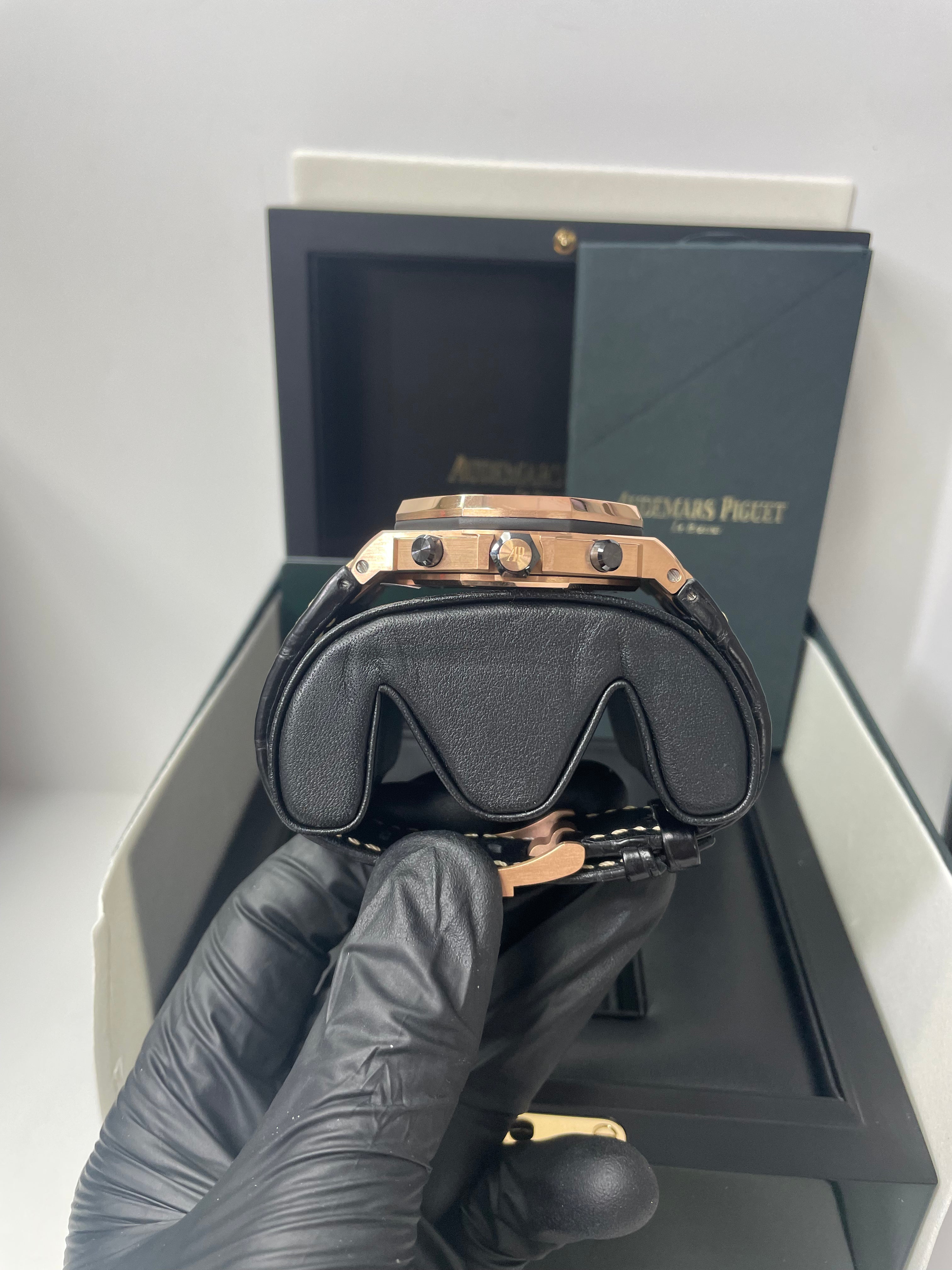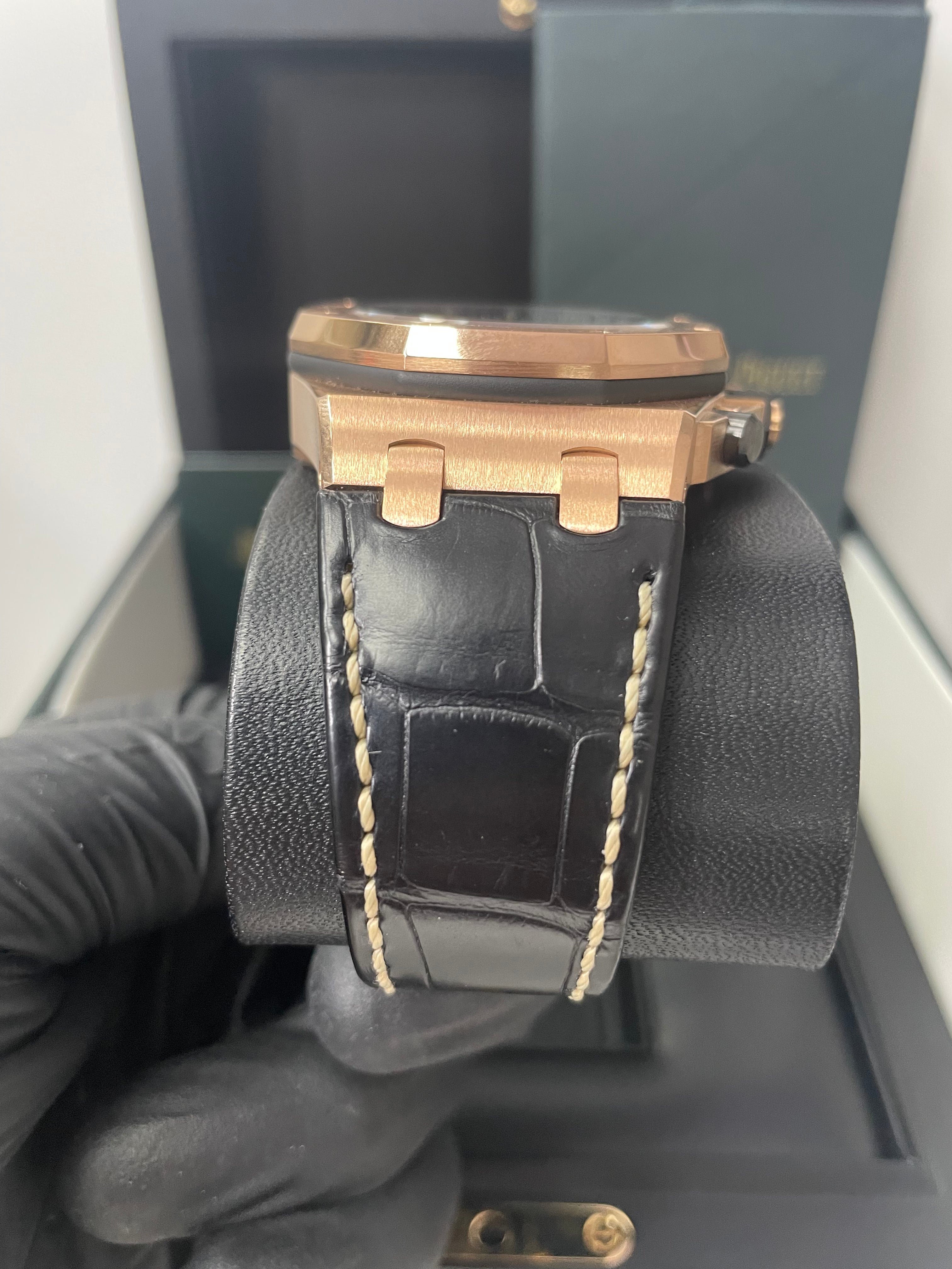 42mm 18K pink gold case. 14.19mm thick. sapphire back. screw-locked crown and push-pieces. 18K pink gold bezel. sapphire crystal with glare-proof. pink gold-toned dial with “méga tapisserie�?pattern. black counters. black Arabic numerals with luminescent coating. pink gold royal oak hands with luminescent coating. black inner bezel. caliber 3126 / 3840 automatic movement with chronograph. hours. minutes. small seconds. date. approximately 50 hours of power reserve. black alligator strap with hand-stitched “large square scale�?18K pink gold pin buckle. Water-resistant to 100 meters.