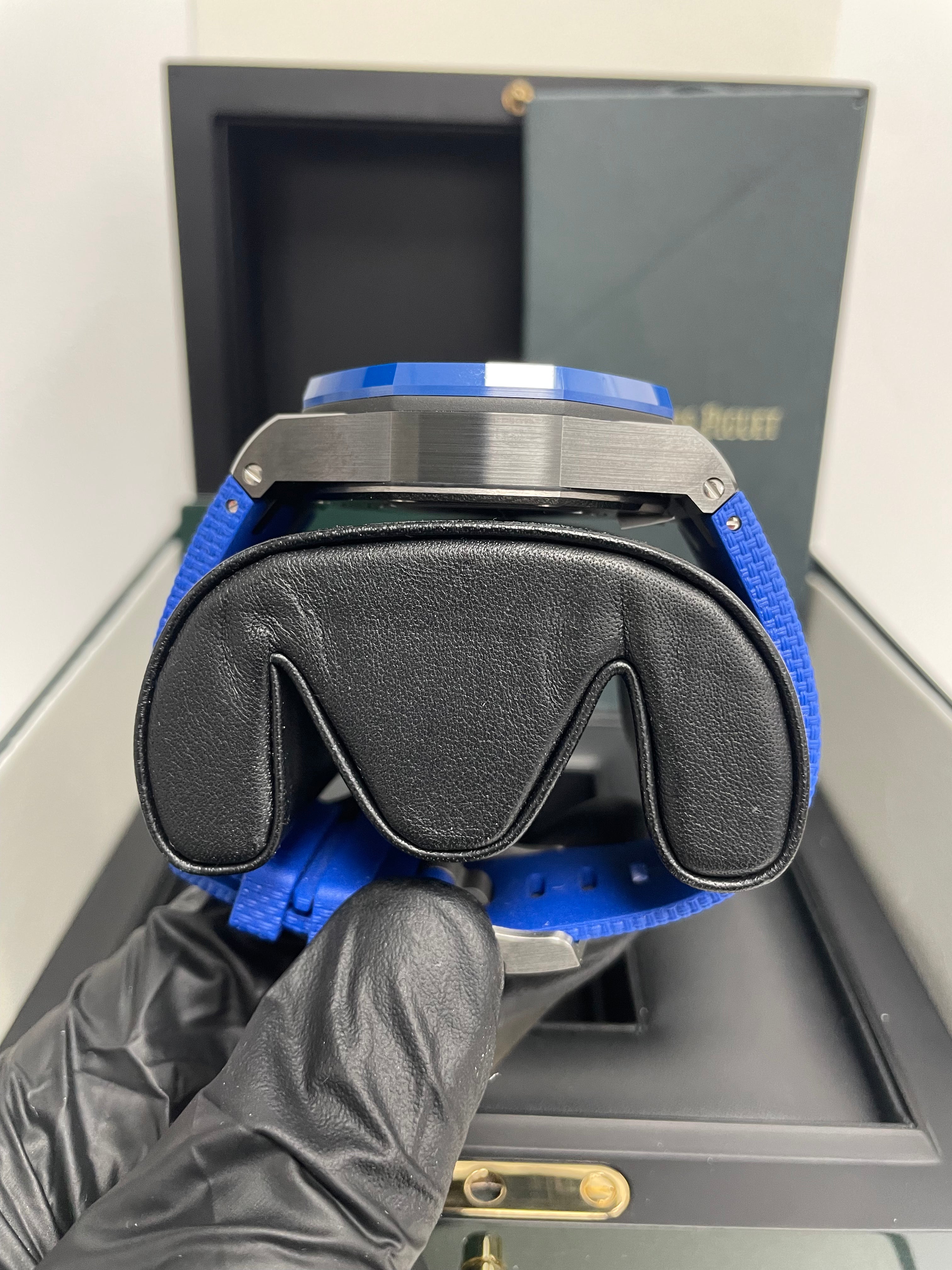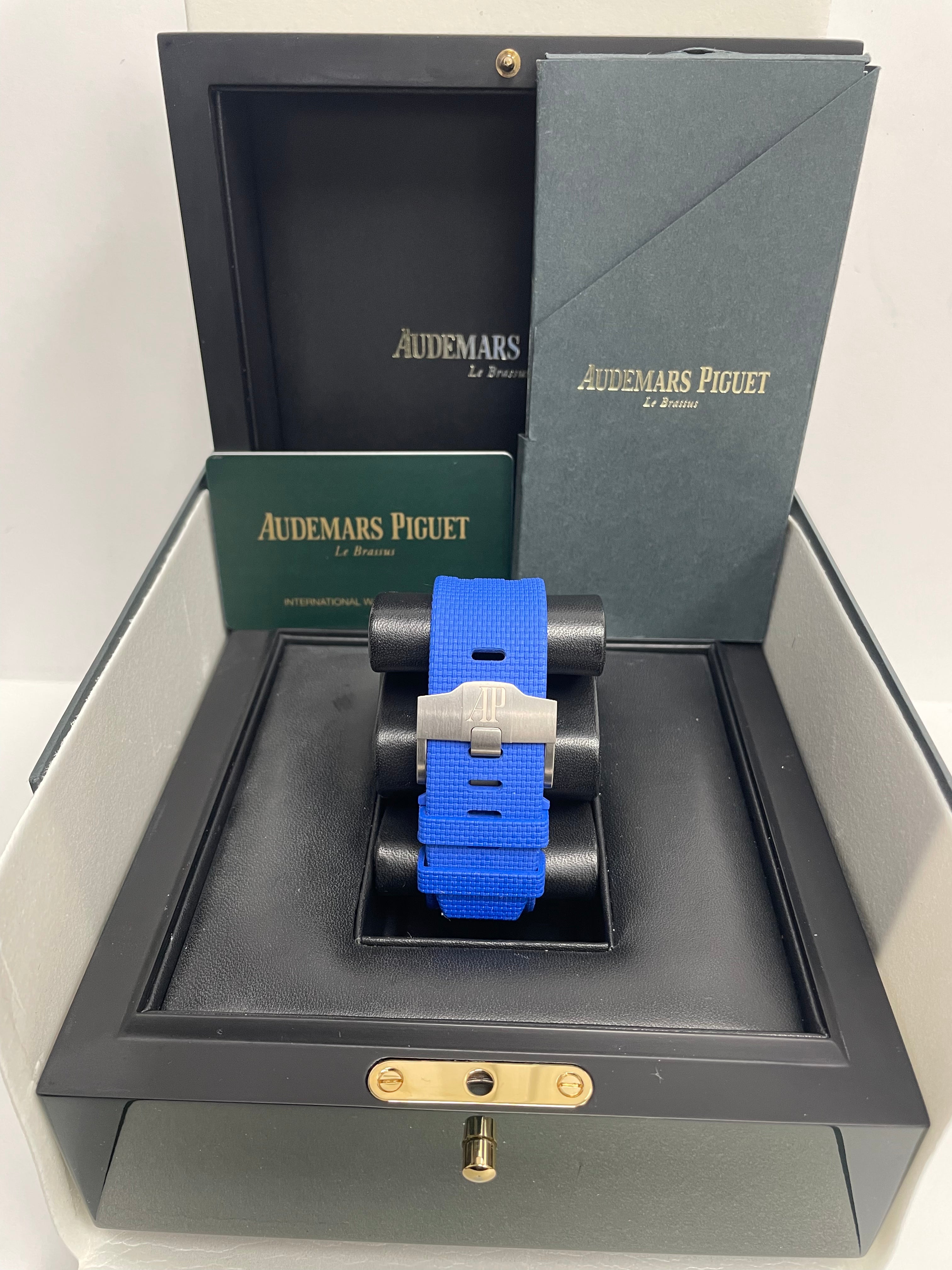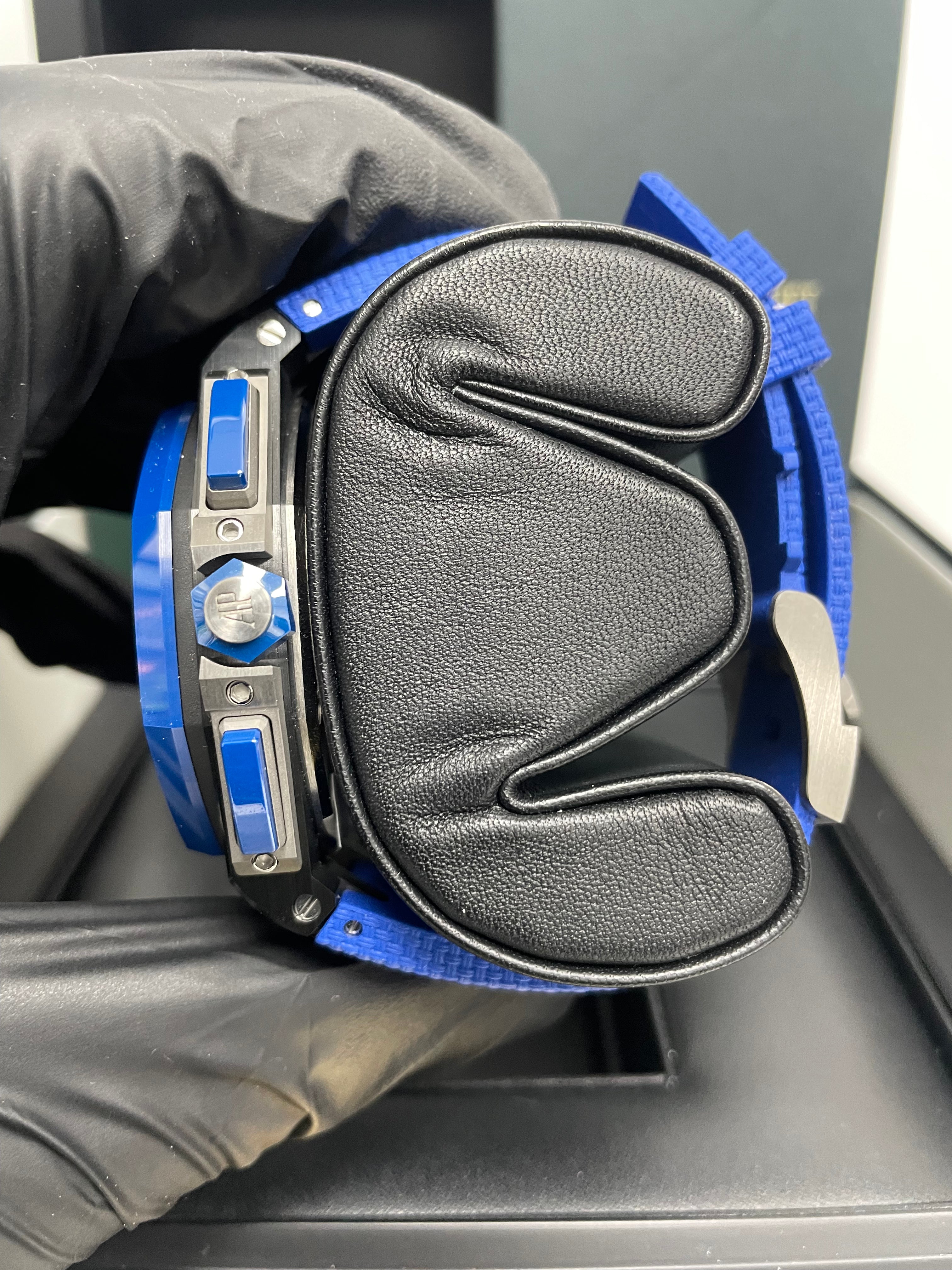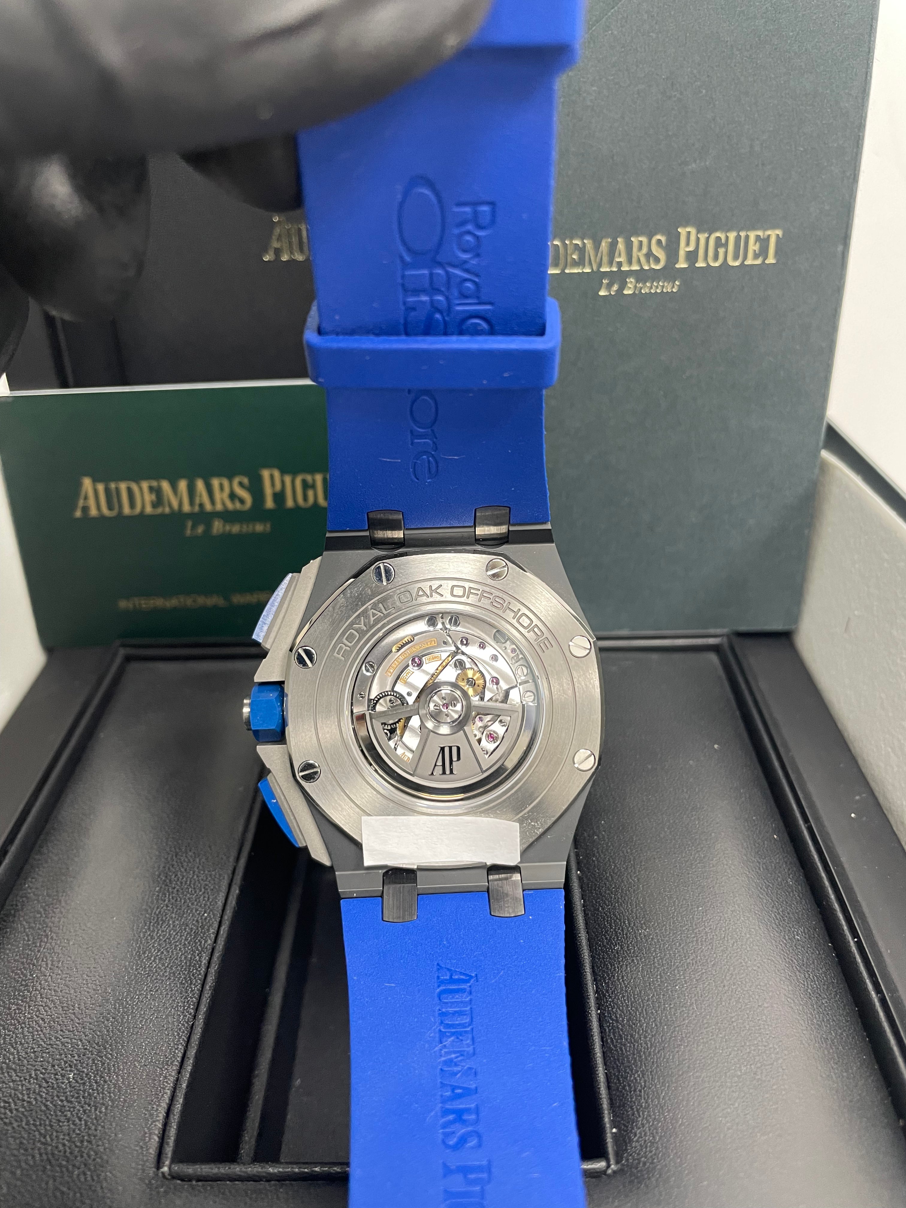 44mm Black ceramic case. glare-proof sapphire crystal. and case back. blue ceramic bezel. push-pieces and screw-locked crown. titanium push-piece guards. 14.4 case thickness. Smoked blue dial with “Mega Tapisserie�?pattern. rhodium-toned counters. black inner bezel. white gold Arabic numerals. and Royal Oak hands with luminescent coating. Blue rubber strap with “textile�?decoration. titanium pin buckle. 50 hours power reserve. 59 number of jewels. Calibre 3126 / 3840 Manufacture and water-resistant up to 100 meters.