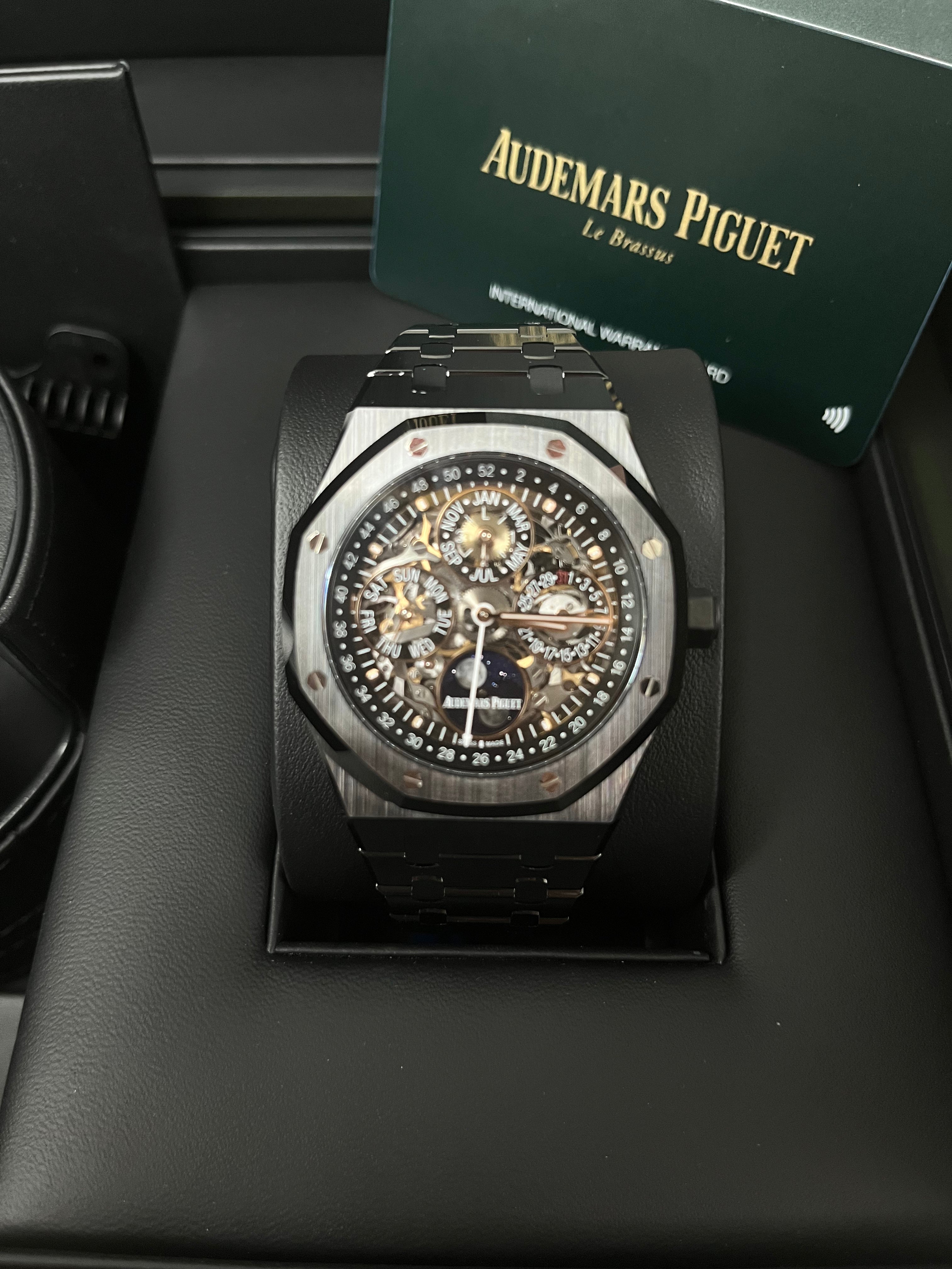 A feat of technical mastery. the Royal Oak Perpetual Calendar Openworked dresses the artistic openworked sapphire dial and the movement's visible pink gold components in black ceramics. Black ceramic case. glareproofed sapphire crystal and black ceramic caseback. screw-locked crown. Sapphire dial. smoked external zone of the counters. pink gold applied hour-markers and Royal Oak hands with luminescent coating. black inner bezel. Black ceramic bracelet with titanium AP folding clasp.