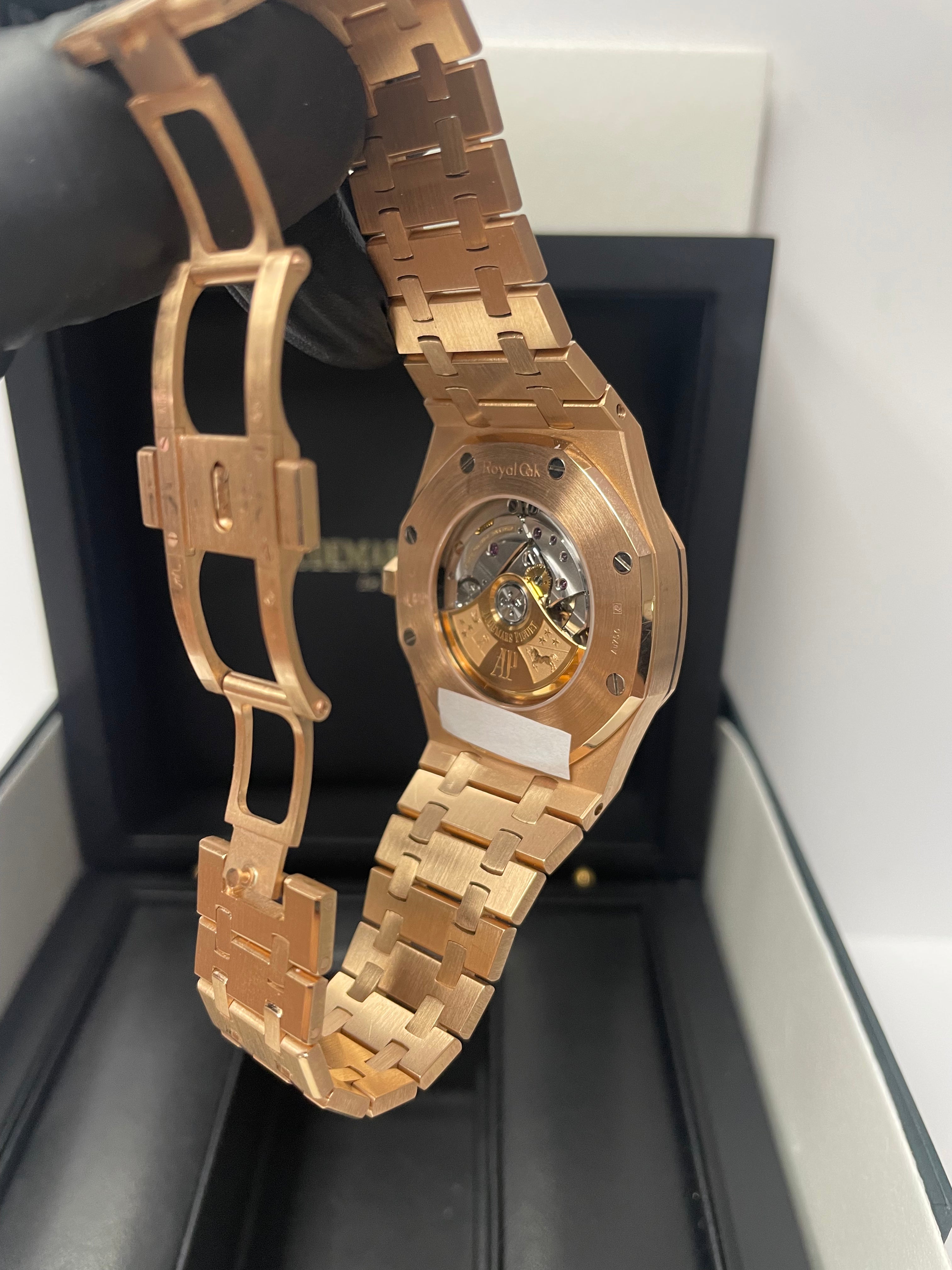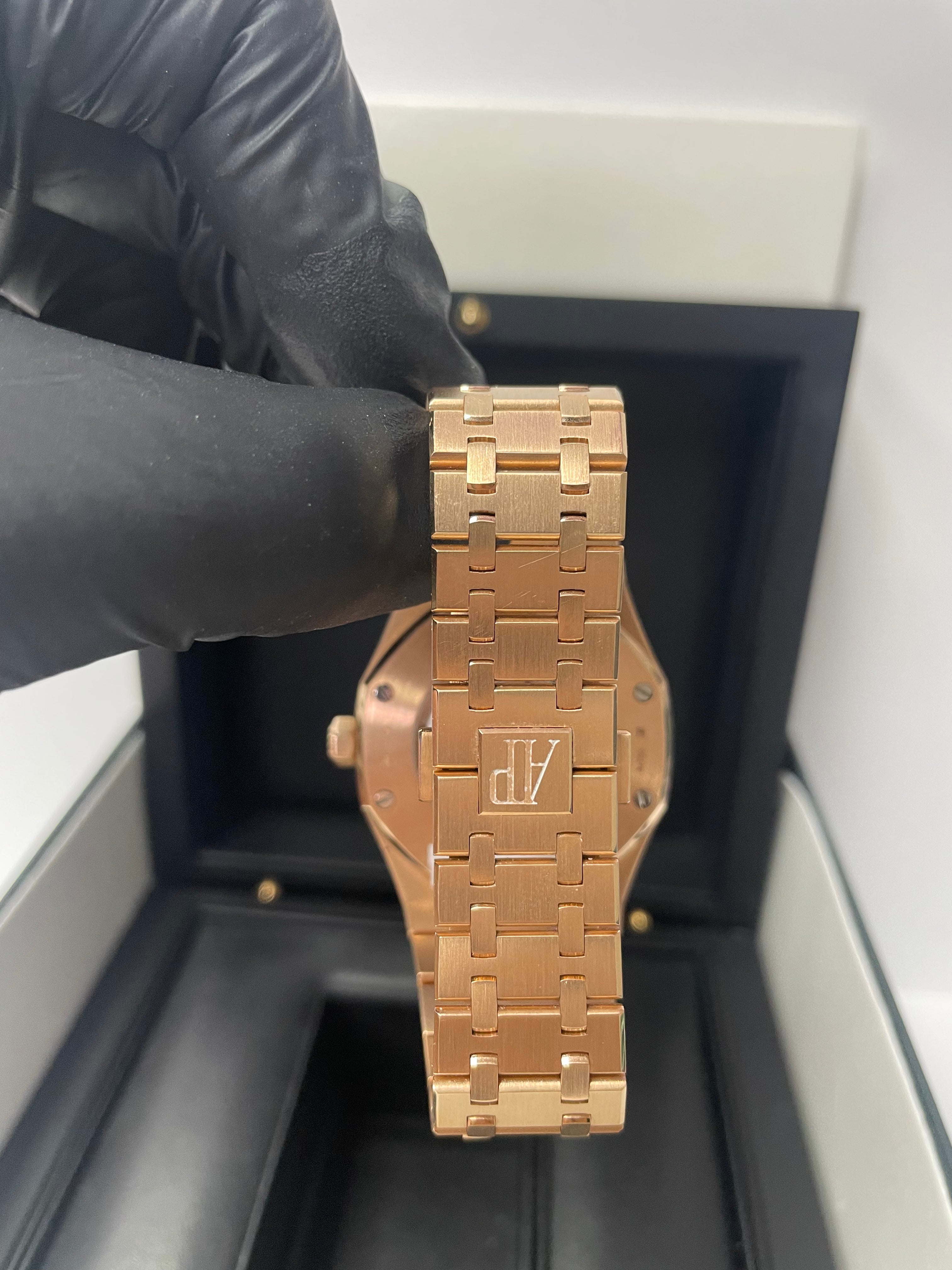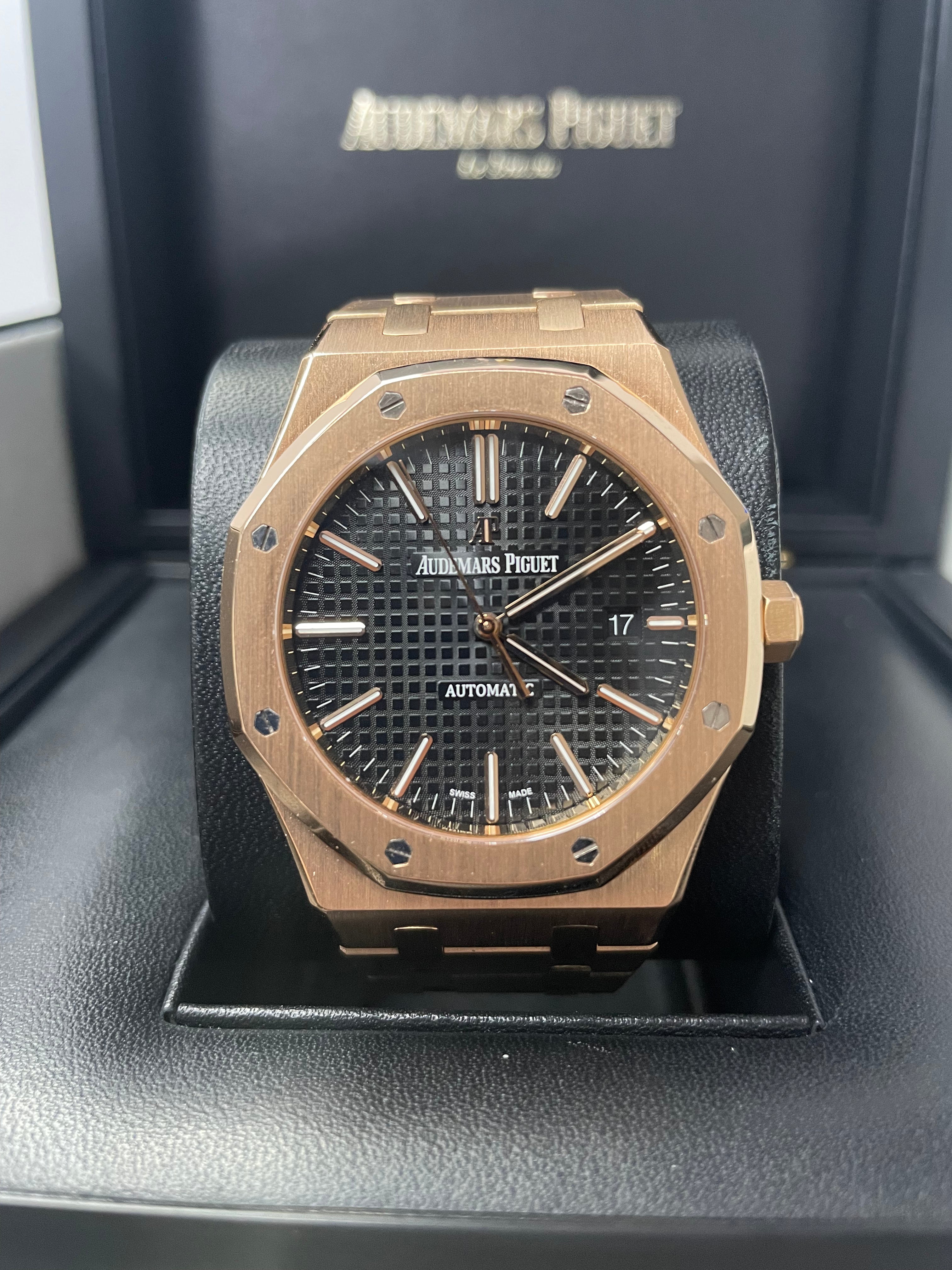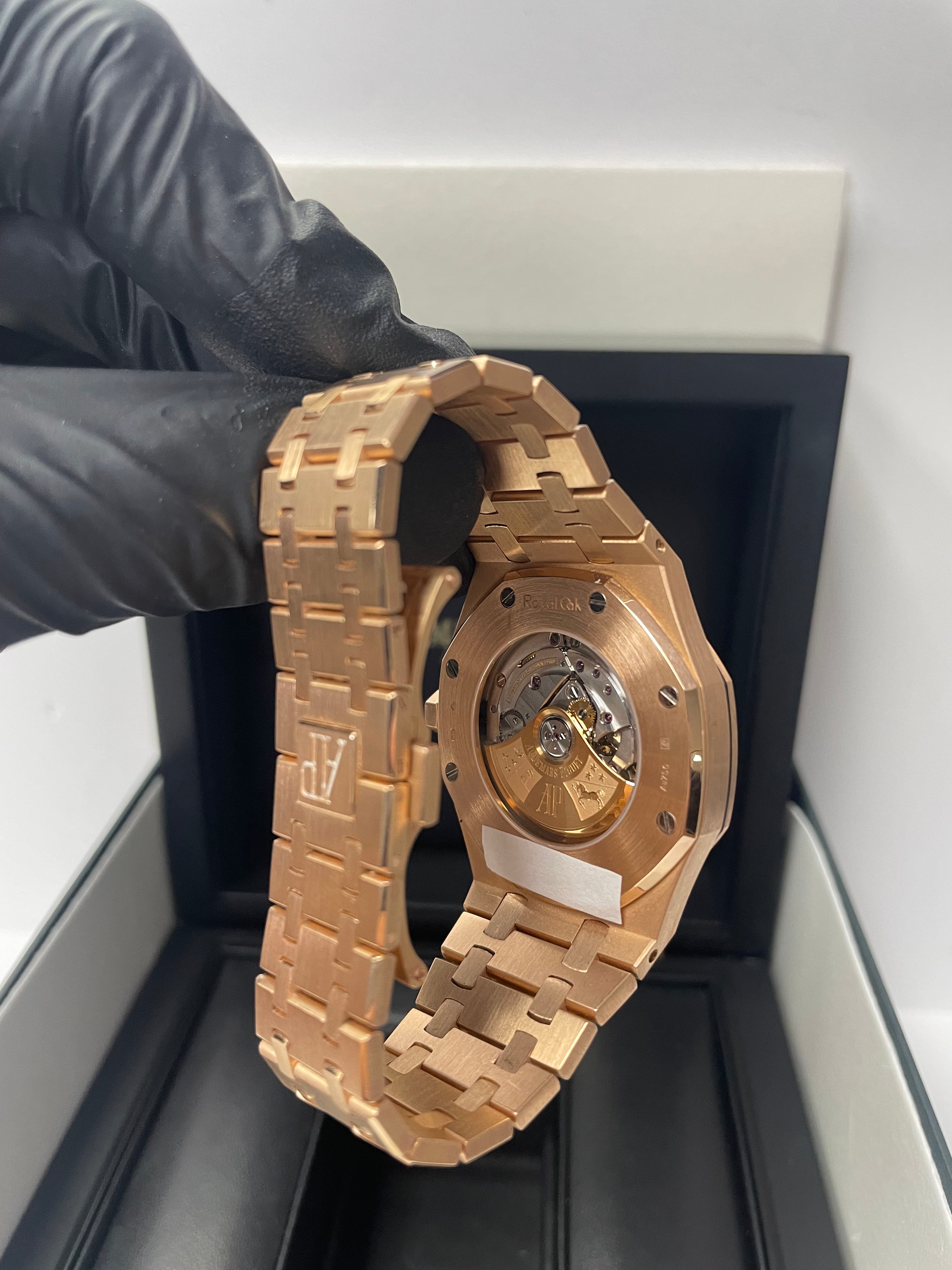 Selfwinding watch with date display. 41 MM 18-carat pink gold case. black dial. 18-carat pink gold applied hour markers. Royal Oak hands with luminescent coating. 18-carat pink gold bracelet. Water resistant to 50 meters.