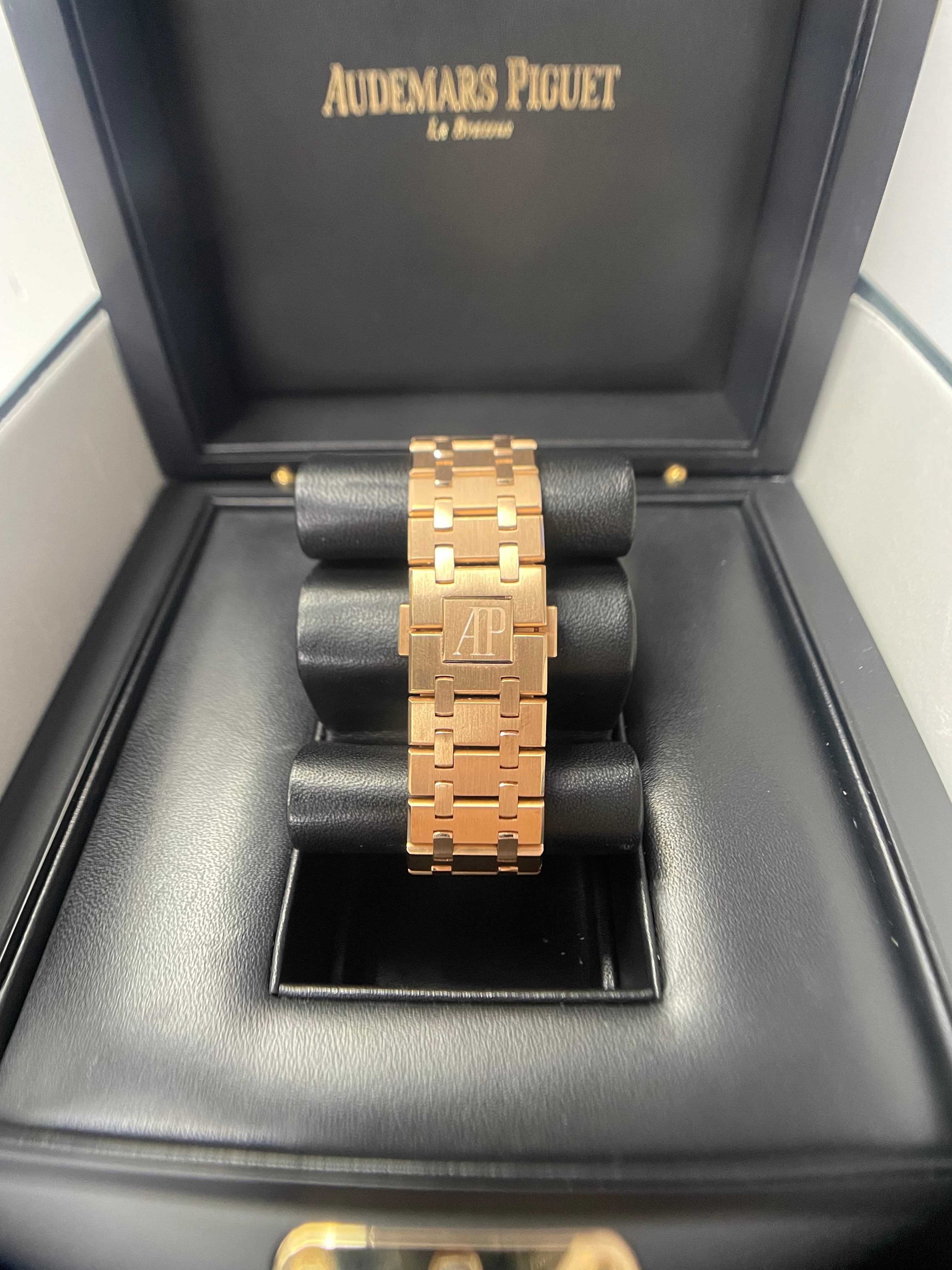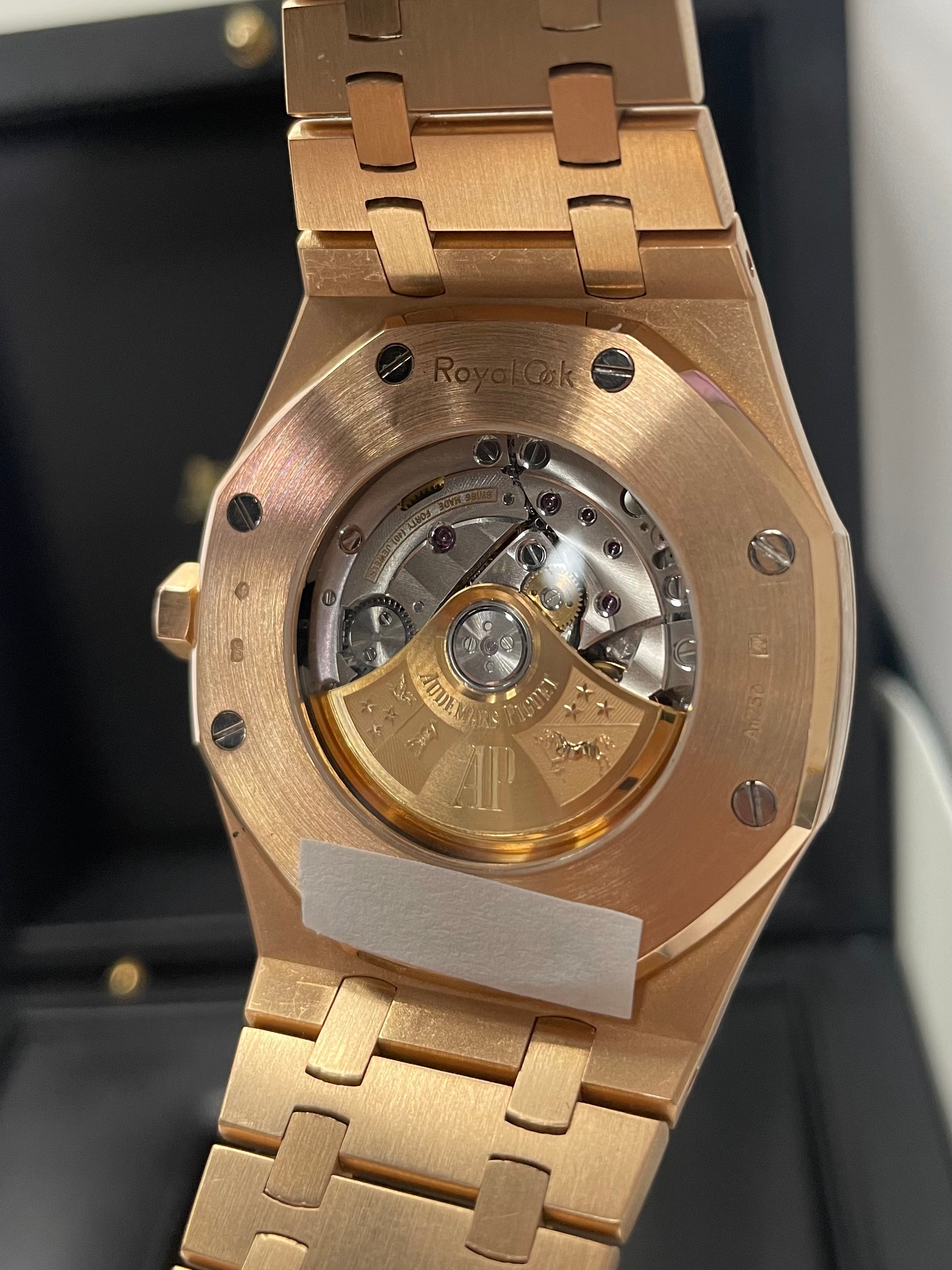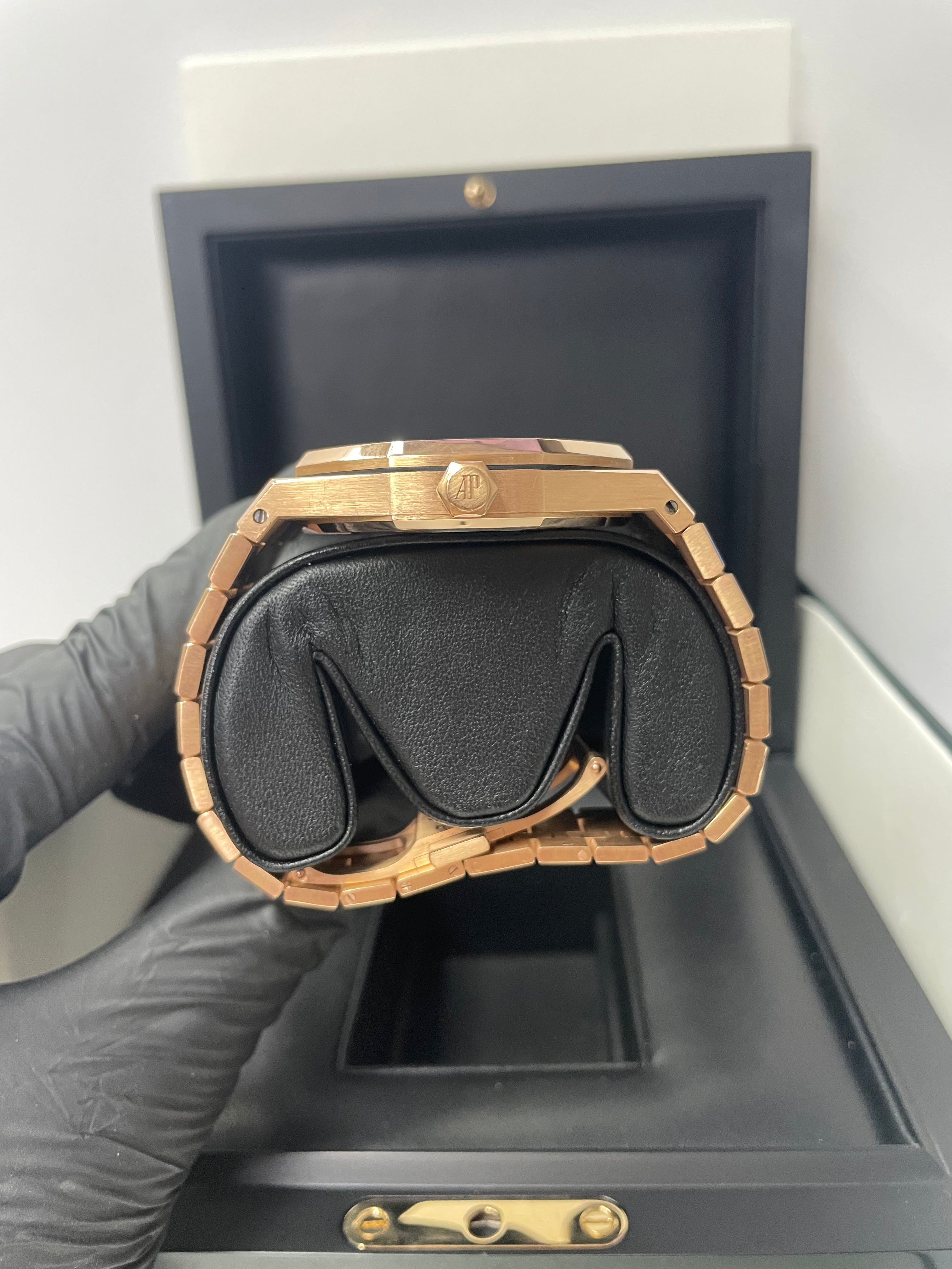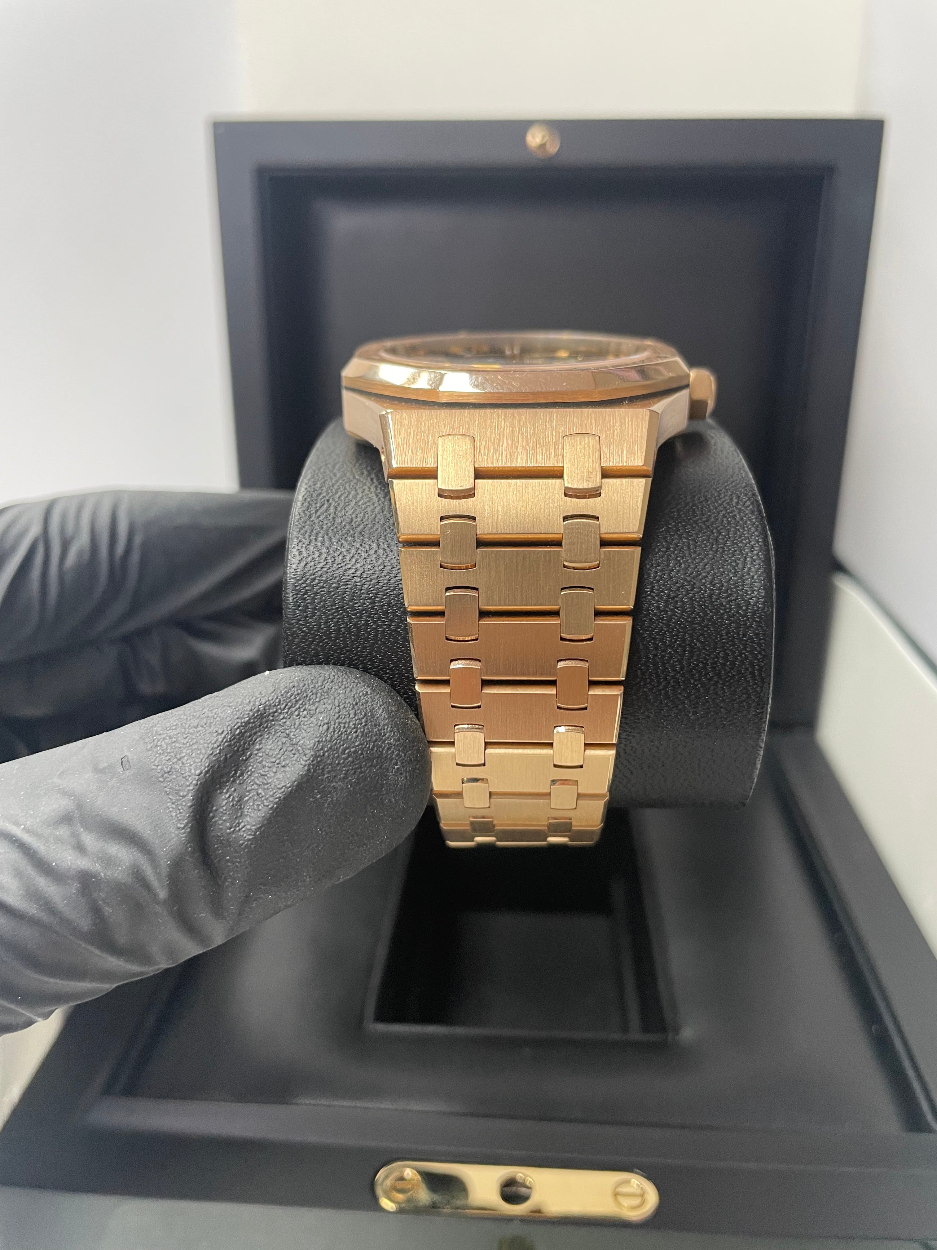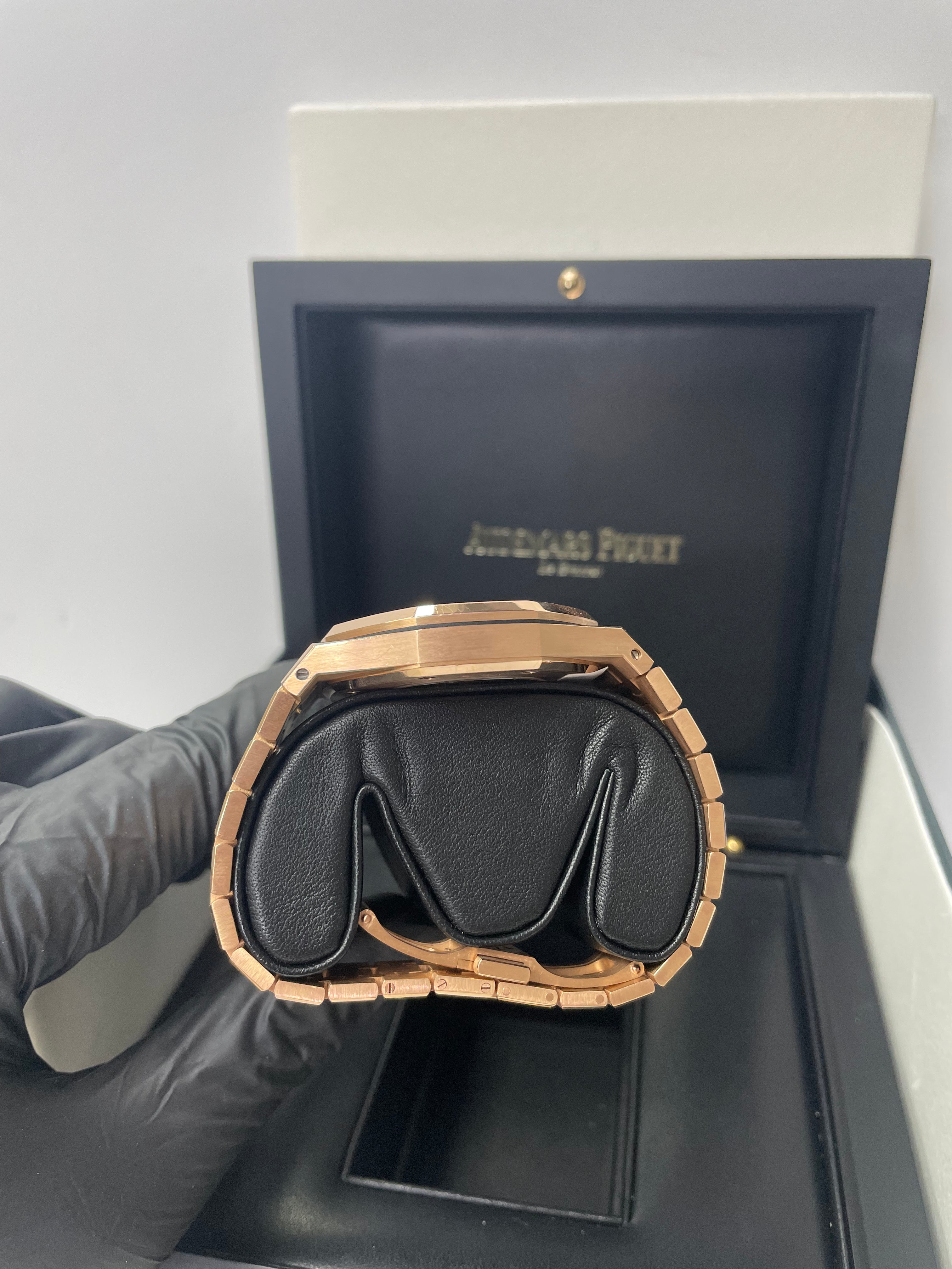 Selfwinding watch with date display. 41 MM 18-carat pink gold case. black dial. 18-carat pink gold applied hour markers. Royal Oak hands with luminescent coating. 18-carat pink gold bracelet. Water resistant to 50 meters.