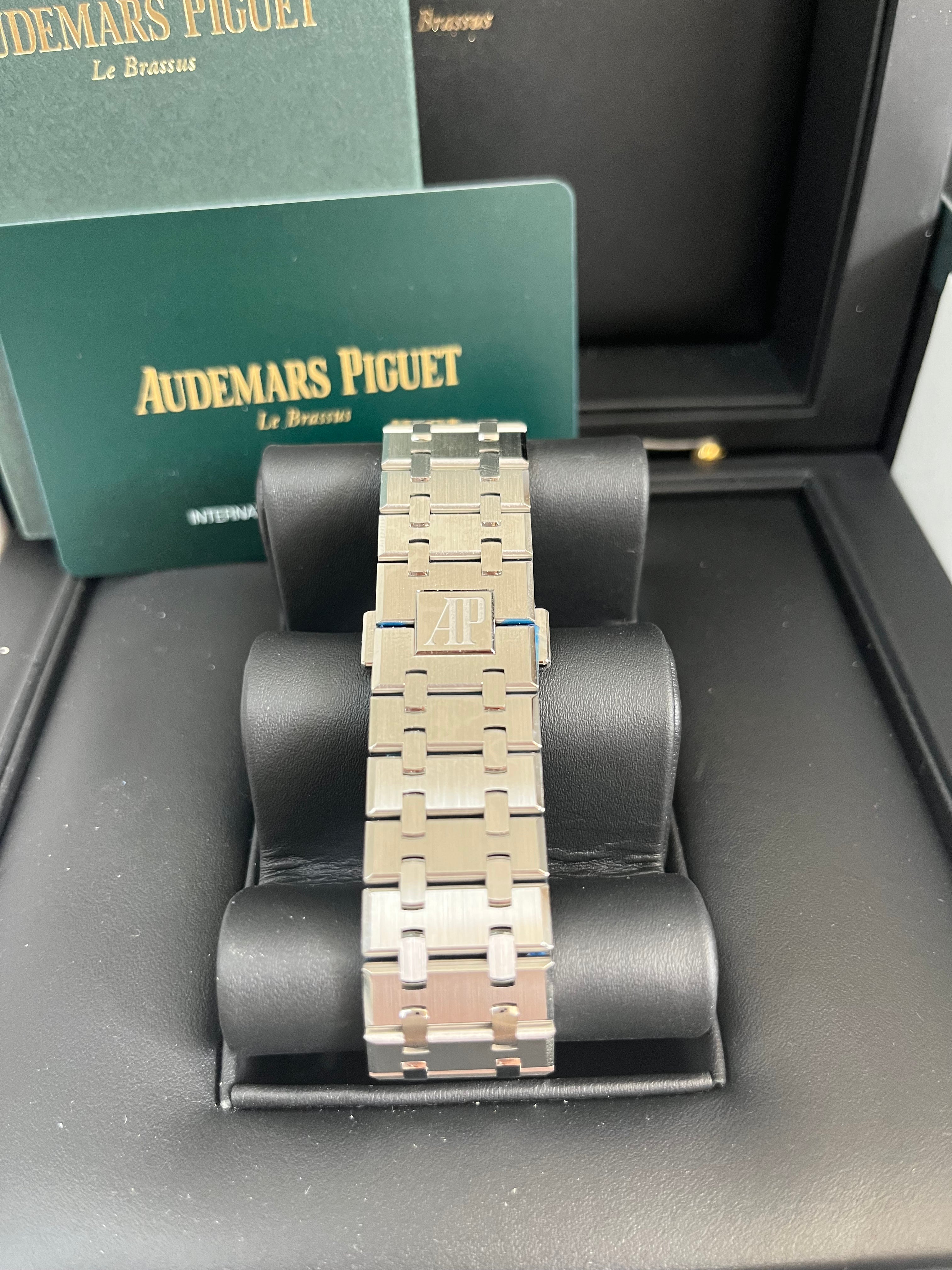 This monochromatic 41 mm Royal Oak Selfwinding. which unites stainless steel with a grey Grande Tapisserie dial. encompasses the collection's refined and ergonomic design evolution. Stainless steel case. glareproofed sapphire crystal and caseback. screw-locked crown. Grey dial with “Grande Tapisserie�?pattern. white gold applied hour-markers and Royal Oak hands with luminescent coating. Stainless steel bracelet with AP folding clasp. |