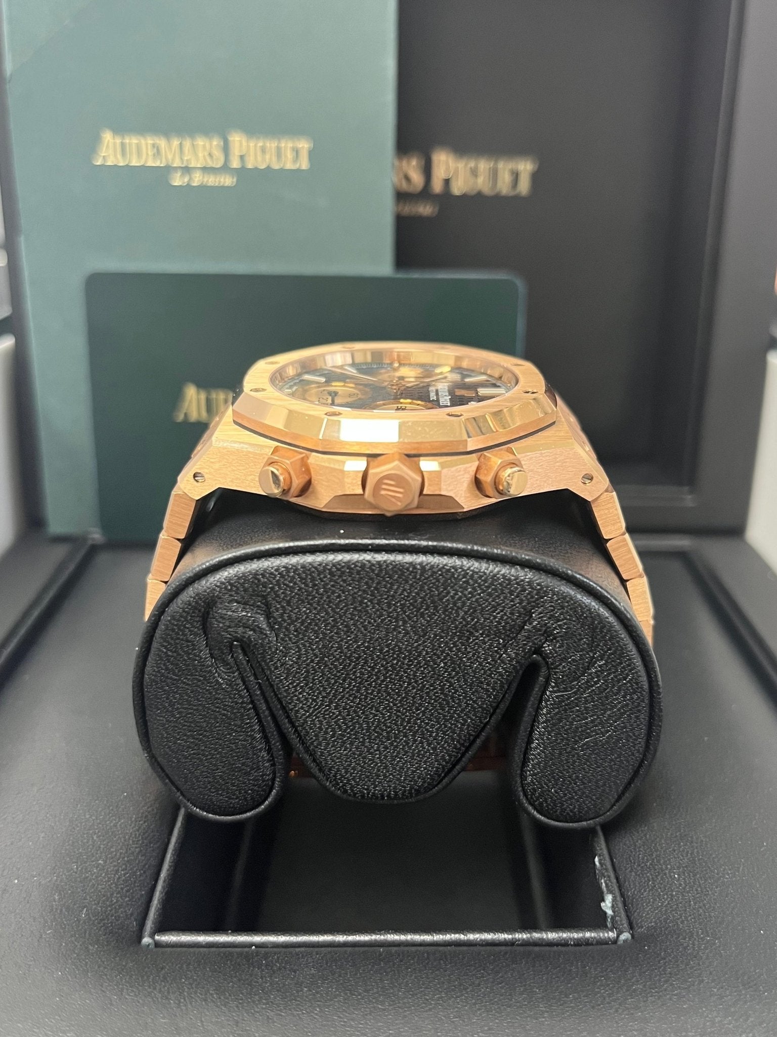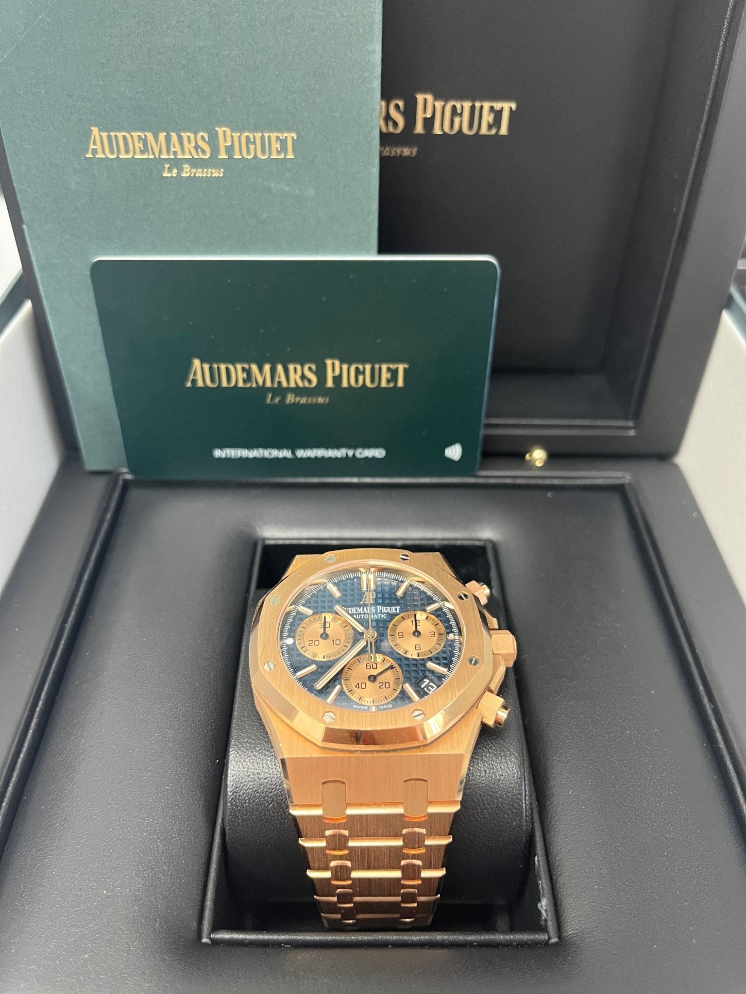 The Manufacture's latest flyback chronograph. Calibre 4401. powers this 18-carat pink gold Royal Oak Selfwinding Chronograph enhanced with a blue “Grande Tapisserie�?dial. 18-carat pink gold case. glareproofed sapphire crystal and caseback. screw-locked crown. Blue dial with “Grande Tapisserie�?pattern. pink gold-toned counters. pink gold applied hour-markers and Royal Oak hands with luminescent coating. 18-carat pink gold bracelet with AP folding clasp.
