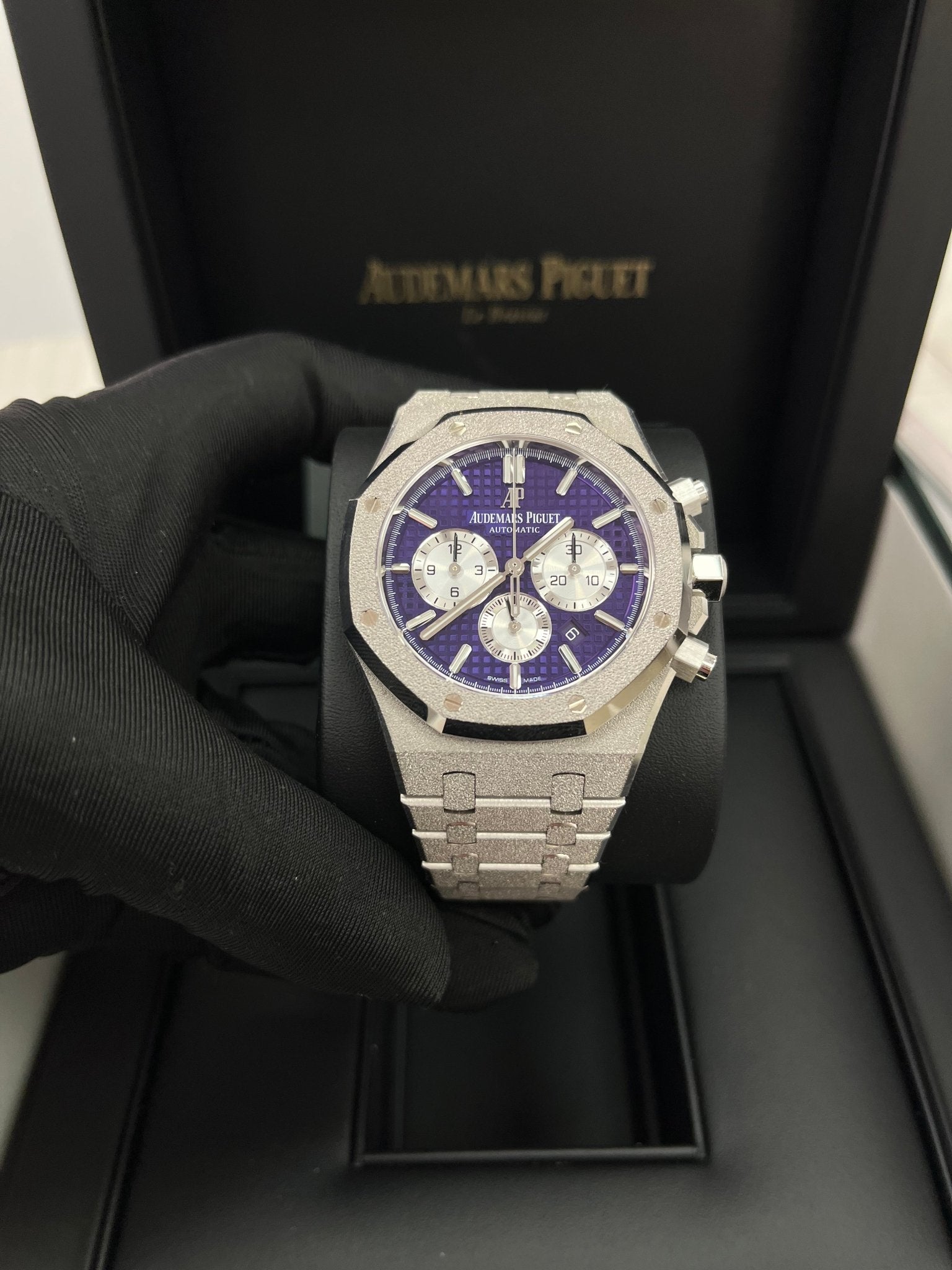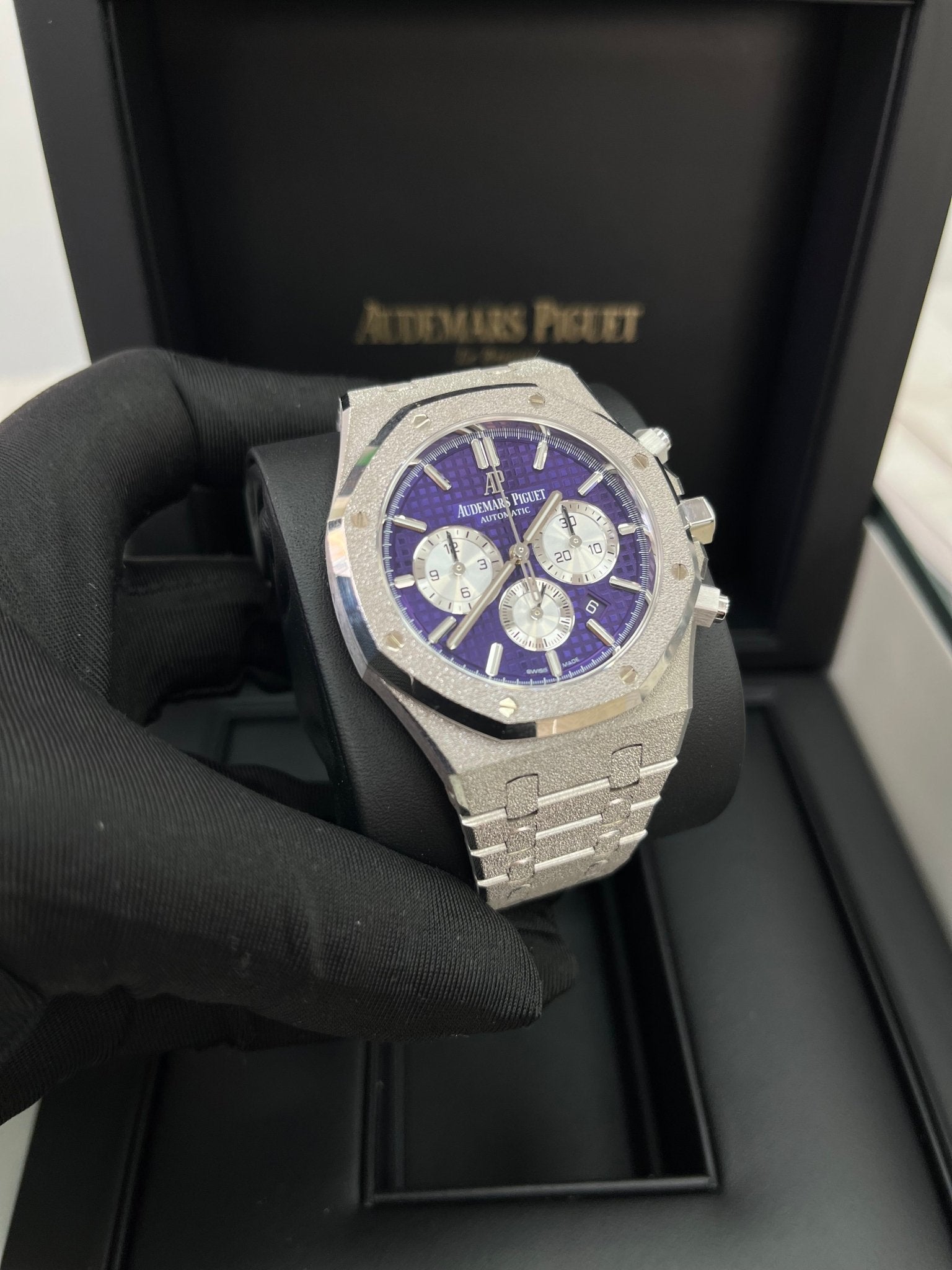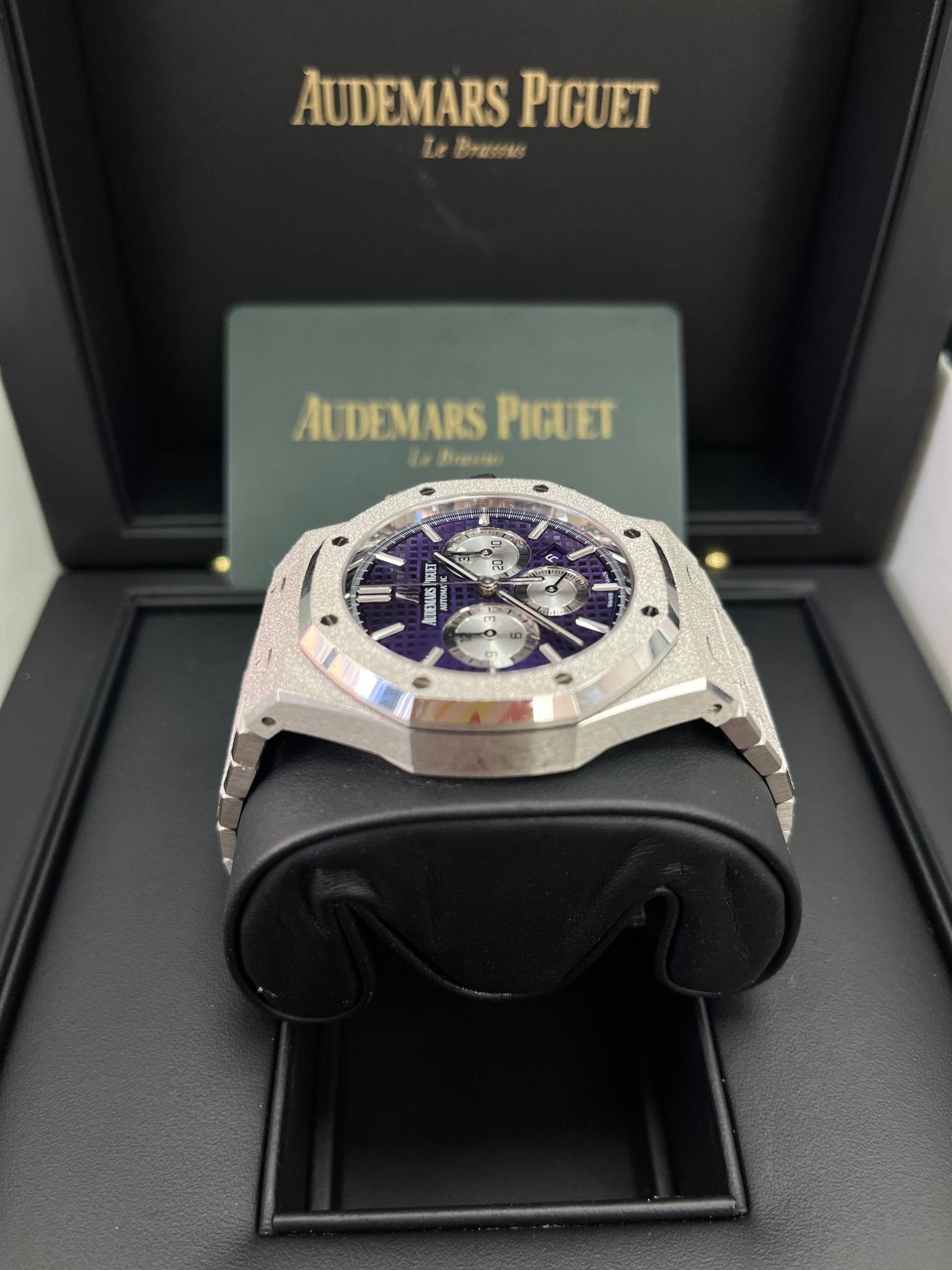 The frosted 18-carat white gold case and bracelet of this limited edition of 200 pieces. finished with polished chamfers. enhance the deep purple of the “Grande Tapisserie�?dial. Hammered 18-carat white gold case. glareproofed sapphire crystal. screw-locked crown. Plum purple dial with “Grande Tapisserie�?pattern. rhodium-toned counters. white gold applied hour-markers and Royal Oak hands with luminescent coating. Hammered 18-carat white gold bracelet with AP folding clasp.