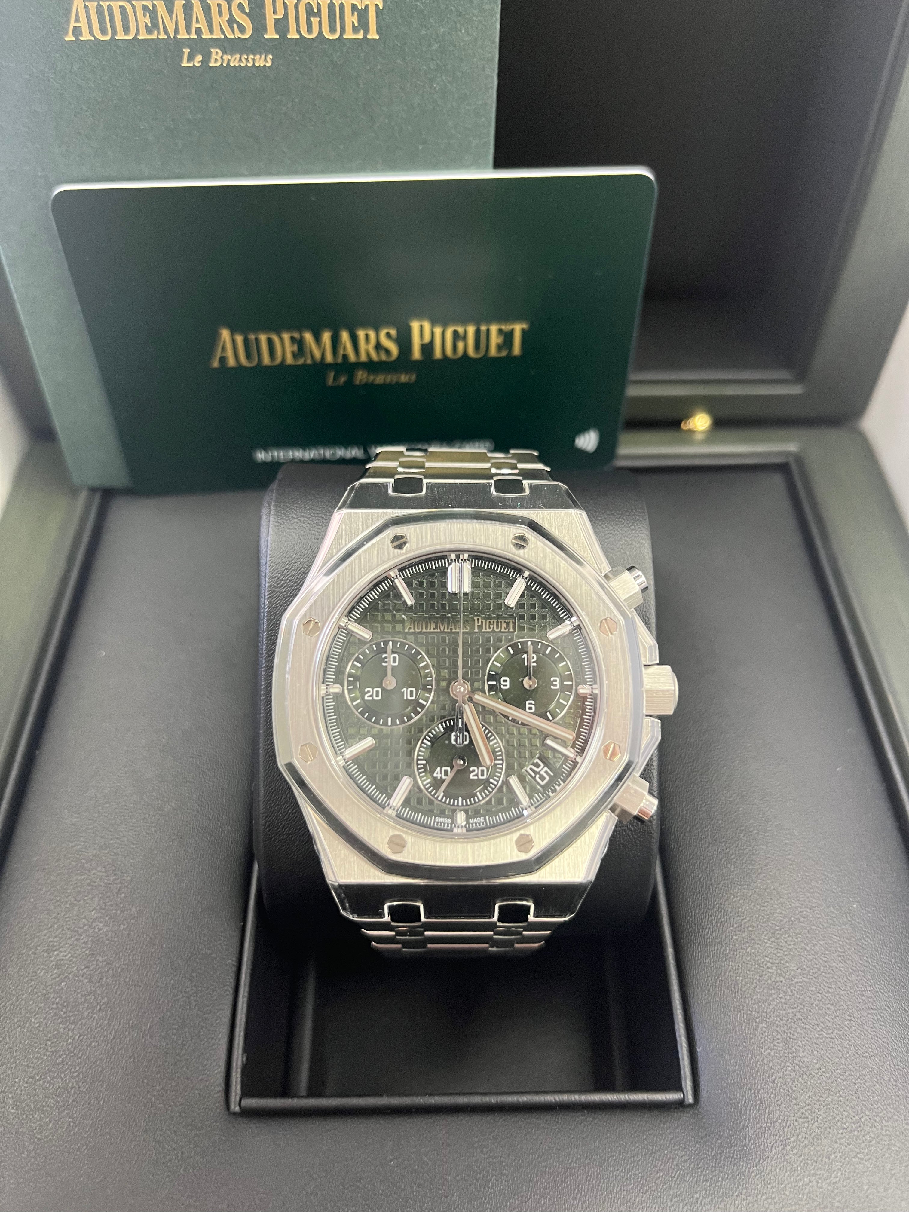 Khaki green dial with “Grande Tapisserie�?pattern. khaki green counters. white gold applied hour-markers and Royal Oak hands with luminescent coating.
