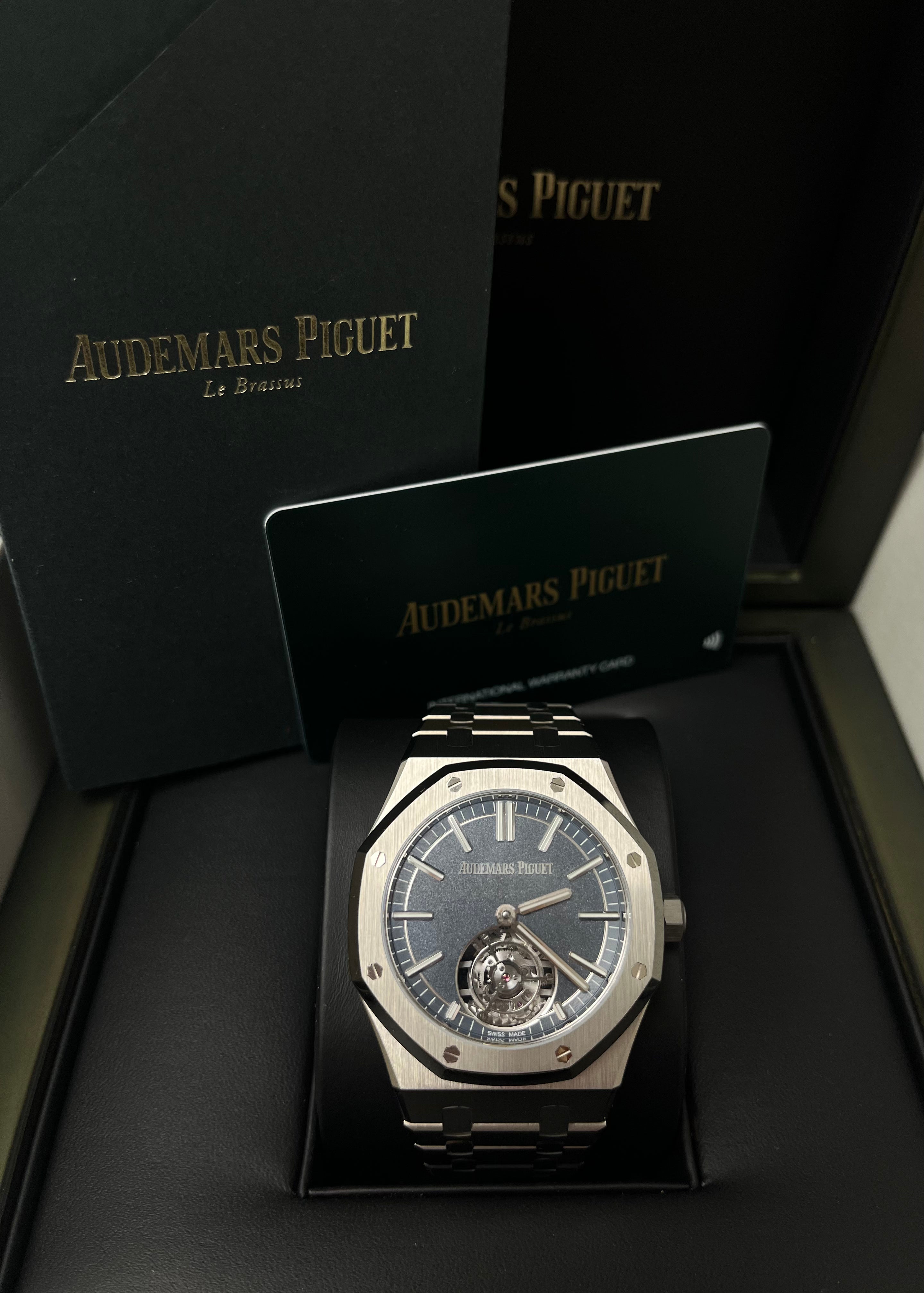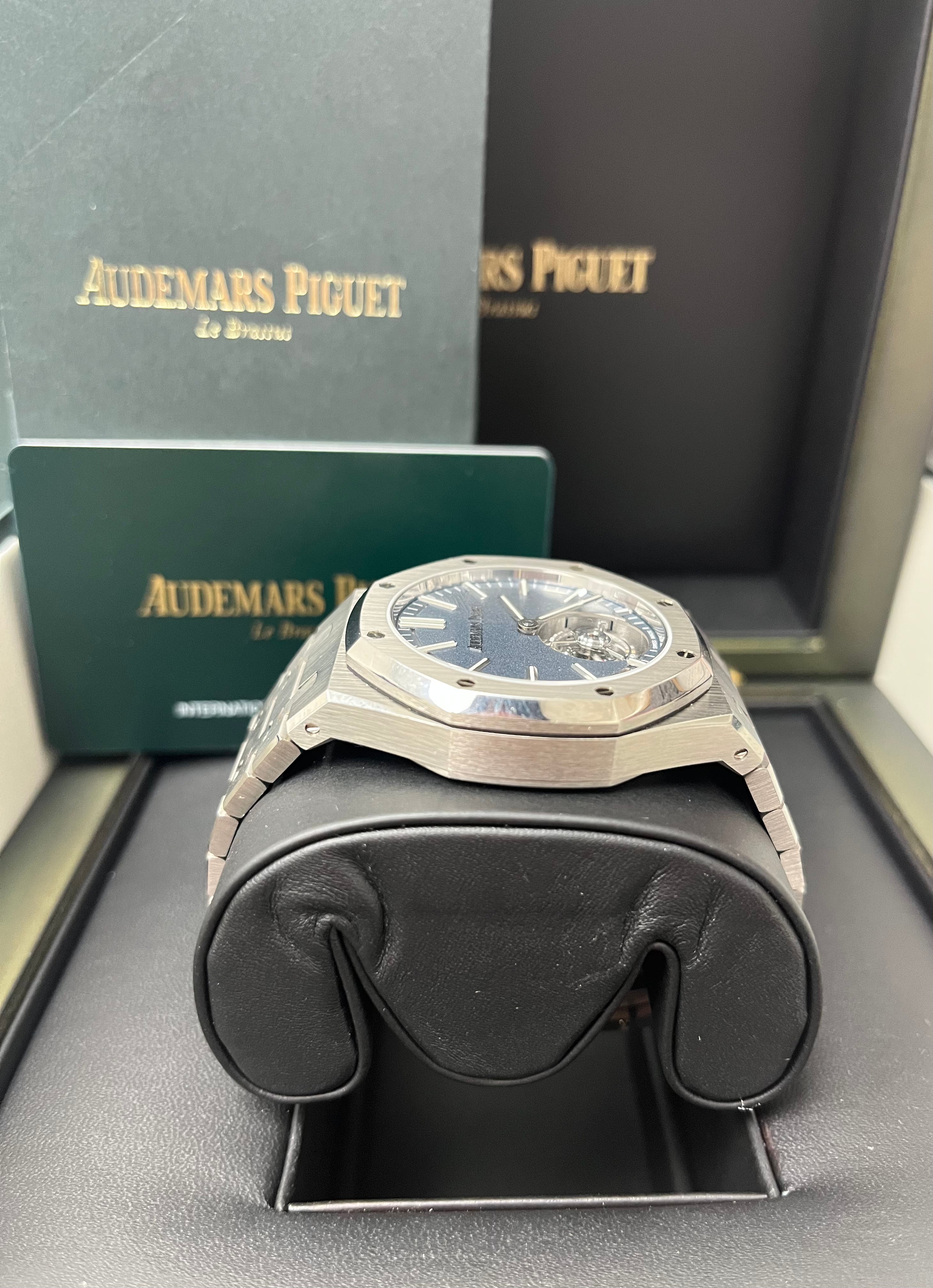 This Selfwinding Flying Tourbillon. which benefits from the new Royal Oak design evolution. combines a titanium case and bracelet with a sandblasted smoked blue dial. The sapphire caseback reveals the "50-years" oscillating weight. Titanium case. glareproofed sapphire crystal and caseback. screw-locked crown. Sandblasted smoked blue dial. white gold applied hour-markers and Royal Oak hands with luminescent coating. Titanium bracelet with AP folding clasp.