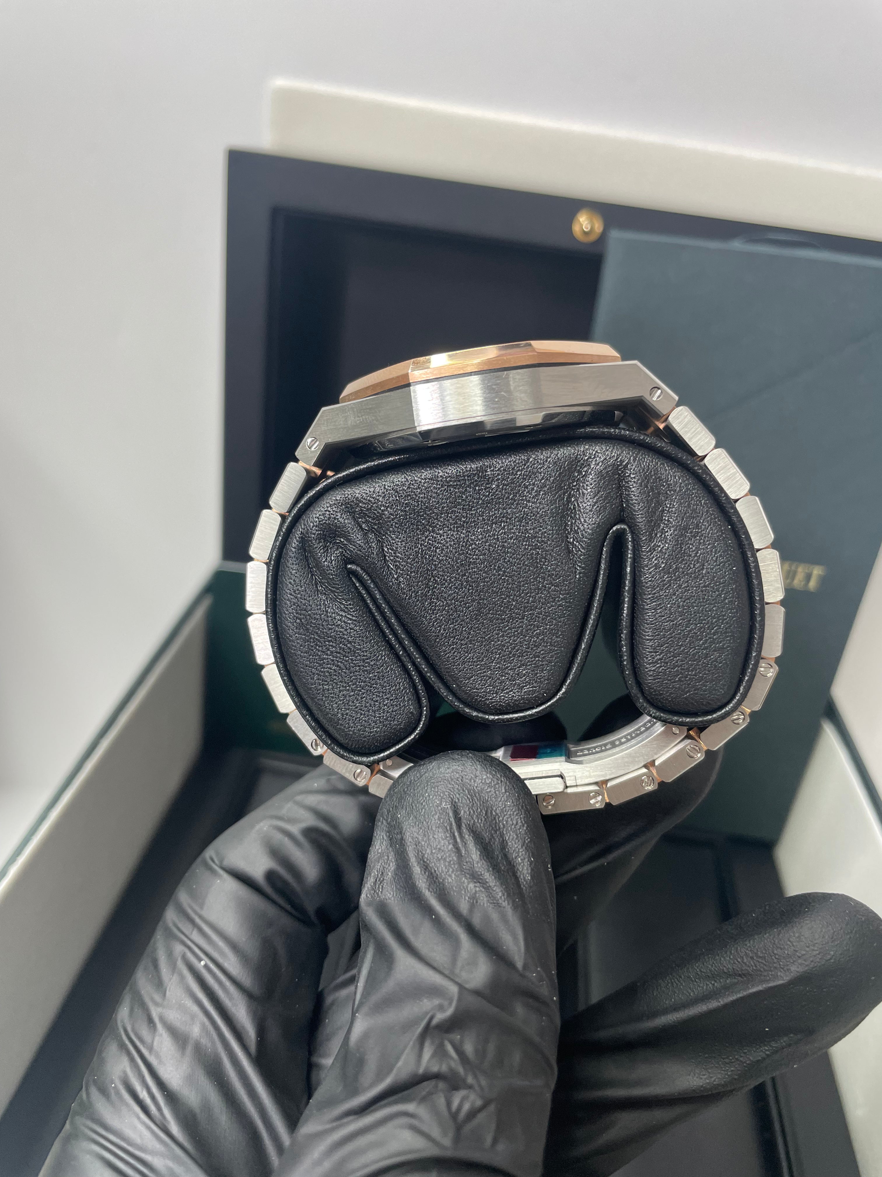 37 mm stainless steel case. 9.80mm thick. glareproof sapphire back. scre-locked 18K pink gold crown. 18K pink gold bezel. glareproofed sapphire crystal. silver-toned dial with “grande tapisserie�?pattern. pink gold applied hour-markers. Royal Oak hands with luminescent coating. Caliber 3120 self-winding movement with hours. minutes. center seconds. date. approximately 60 hours of power reserve. stainless steel and 18K pink gold bracelet. AP folding buckle. Water resistant to 50 meters.