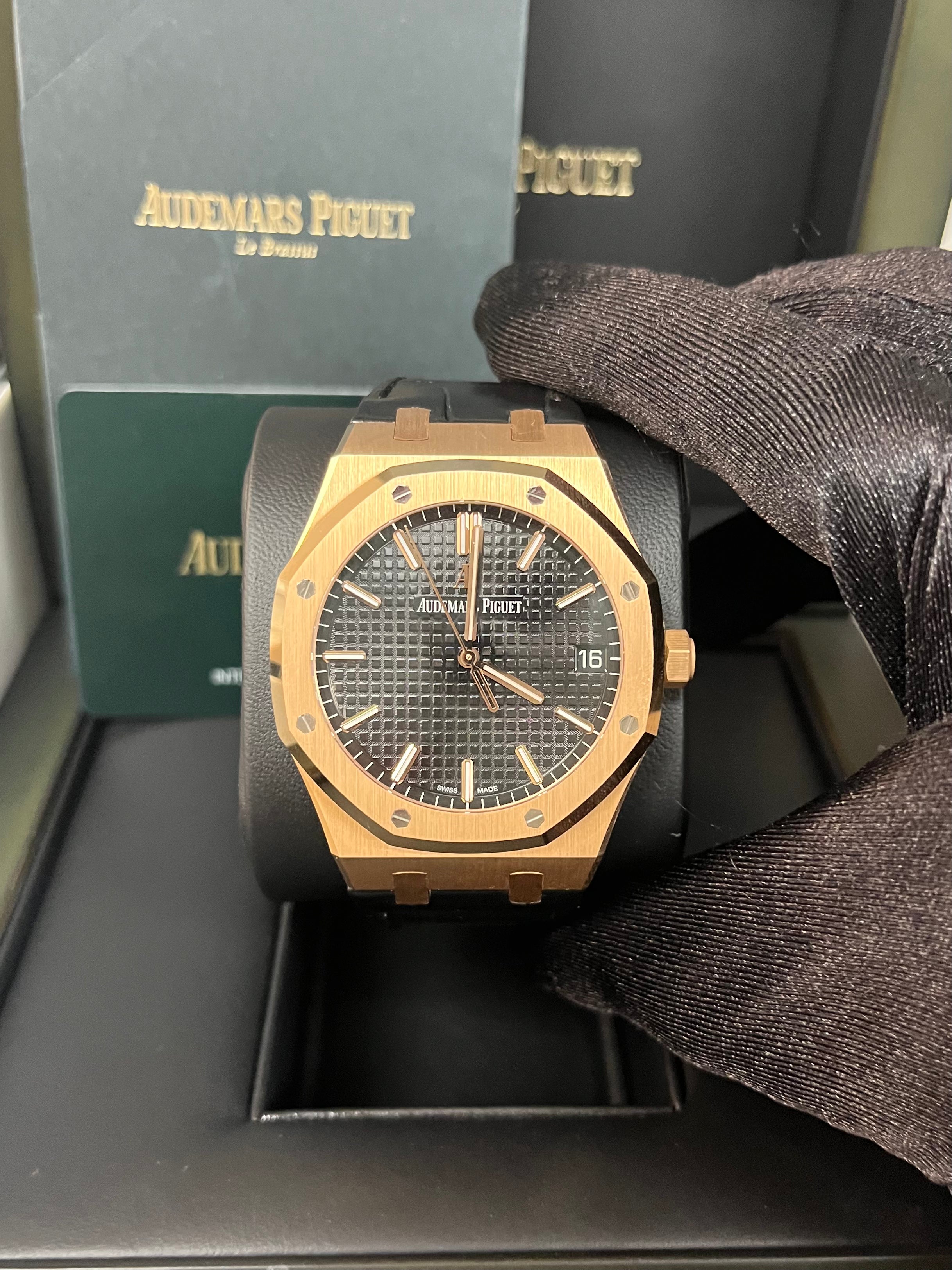 41mm 18K pink gold case. 10.4 mm thick. sapphire crystal back. screw-locked crown. black dial with Grande Tapisserie pattern. pink gold applied hour-markers and Royal Oak hands with luminescent coating. caliber 4302 self-winding movement with hours. minutes. center seconds. and date. approximately 70 hours of power reserve. black alligator strap. AP folding buckle. Water-resistant up to 50 meters.