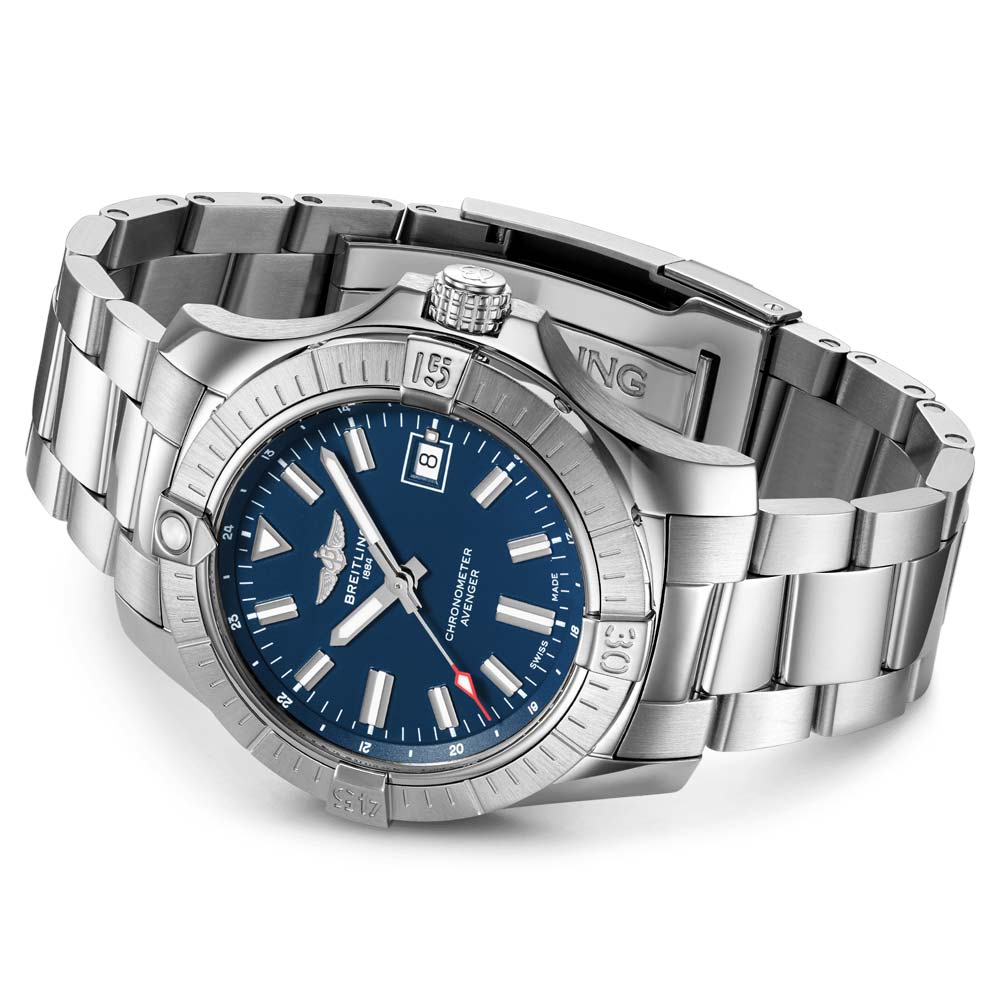 Boasting a bold and robust design. the Avenger Automatic 43 is shock-resistant and boasts a clear dial for easy legibility. Breitling's signature Avenger model is ideal for those who use gloves and provides the utmost safety and reliability. The Avenger Automatic 43 is composed of a 43mm stainless-steel case. blue or black dial and a stainless-steel bracelet. black or blue military leather strap with either a stainless-steel pin buckle or folding clasp. Additionally. the rugged bezel and its special grip-pattern on the crown make it simple to use with gloves.