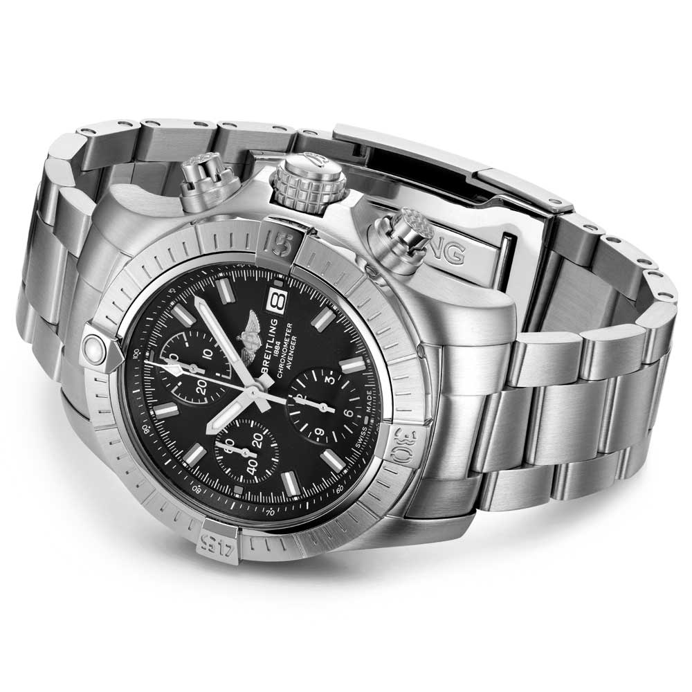 The Breitling Avenger Chronograph 43 boasts robust construction and a rugged aesthetic that make it ideal for the active traveler. The 43mm stainless-steel case can be paired with a selection of bracelets and straps. including a military-style leather band with either a pin buckle or folding clasp. Further features like the bezel. crown and pushers with distinctive grip pattern make it useable with gloves.