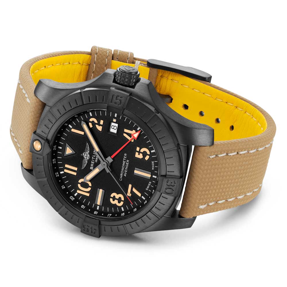 The Night Mission interpretation of the Avenger Automatic GMT 45 features a sturdy 45mm DLC-coated titanium case. black dial and a sand-coloured military leather strap that fits either a DLC-coated stainless-steel pin buckle or folding clasp. Its specific Arabic numerals �?coated with Super-LumiNova® �?recall the stencilled numbers used on the decks of aircraft carriers. Thanks to its rugged bezel and its special grip-pattern on the crown. the Avenger Automatic GMT 45 Night Mission can be easily operated wearing gloves.