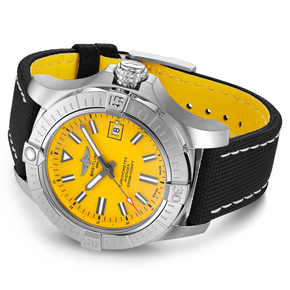 The extreme robustness and shock resistance of the Breitling Avenger Automatic 45 Seawolf make it an optimal choice for pilots and adventurers alike. Its 45mm stainless-steel case boasts a powerful yellow dial. accompanied by either a stainless-steel bracelet or black military leather strap with either a stainless-steel pin buckle or folding clasp. Enjoy a maximum diving depth of 3.000 meters (300 bars of water pressure) and experience the watch's unparalleled safety and reliability. Its rugged bezel and special grip-pattern crown ensure ease of operation even with gloves.