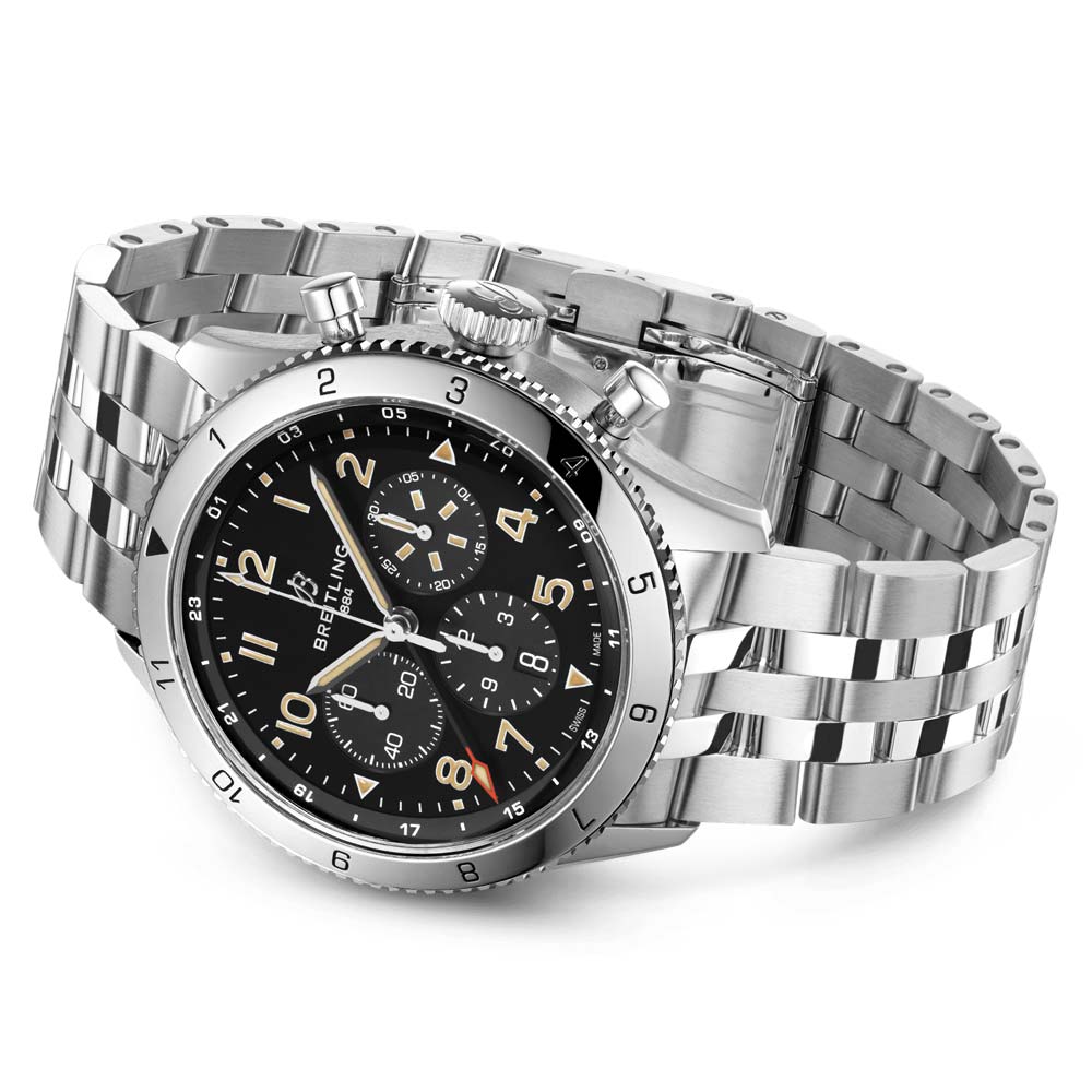 Pilots and other globetrotters will benefit from the 24-hour bezel and red-tipped GMT hand. for easily monitoring a second time zone. The reliable Breitling Caliber B04 movement. certified by the COSC. offers an impressive 70-hour power reserve.