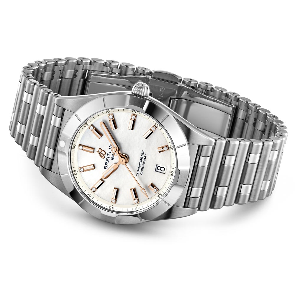 The Breitling Chronomat 32 is a modern-retro inspired watch that makes a stylish yet elegant statement. perfect for any occasion. The timepiece comes in a variety of metal cases. from stainless steel to bicolor and even 18k red gold. Additionally. glitter-lovers can opt for diamond-set bezels. indices. and colorful dials. With the iconic and comfortable “Rouleaux�?bracelet and a butterfly clasp. the Chronomat 32 is powered by the Breitling Caliber 77. a COSC-certified SuperQuartz�?chronometer.