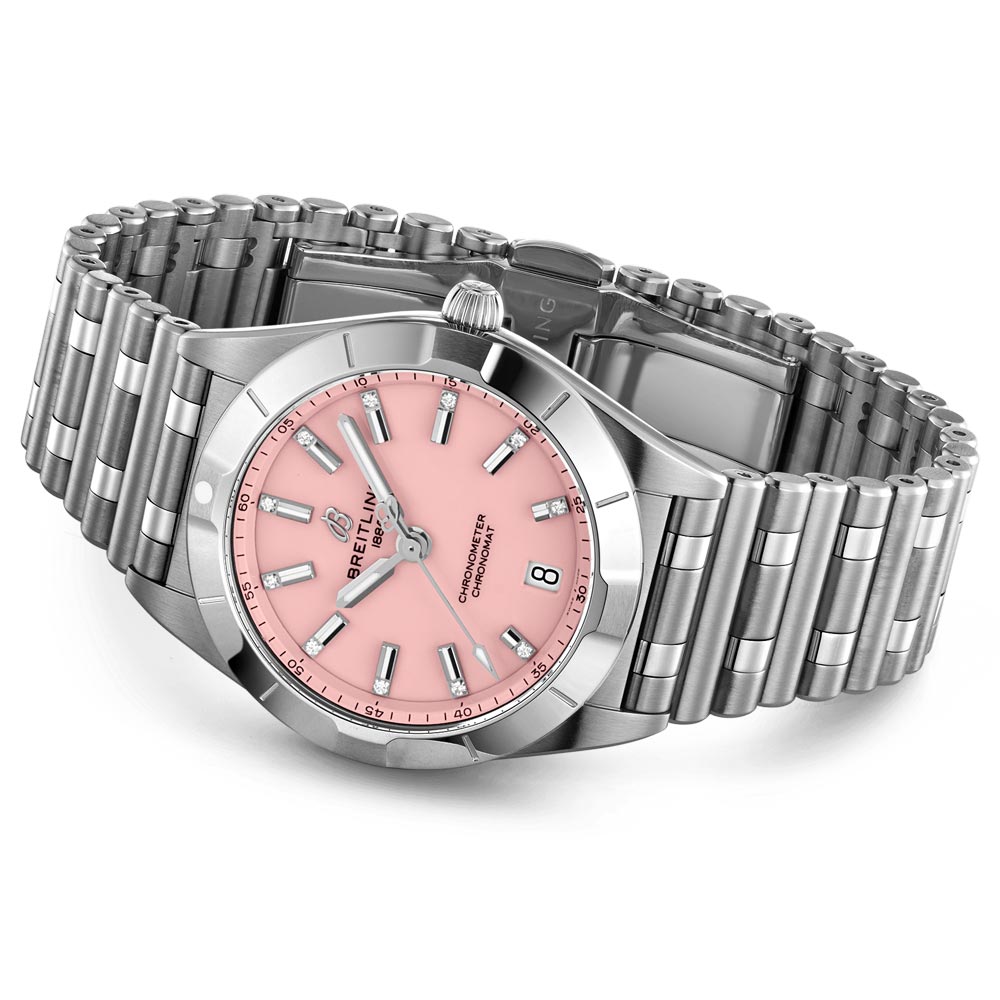 The Chronomat 32 flaunts a resurgent appeal that is aesthetically stunning and fit for various events. It comes with a selection of metal cases. such as stainless steel. bicolour. and 18ct red gold and sprinkled with diamonds on its bezel. indices. and dial. It is powered by the acclaimed Breitling Calibre 77. an official COSC-certified SuperQuartz�?chronometer. and sported by Breitling's renowned Rouleaux bracelet with butterfly clasp.