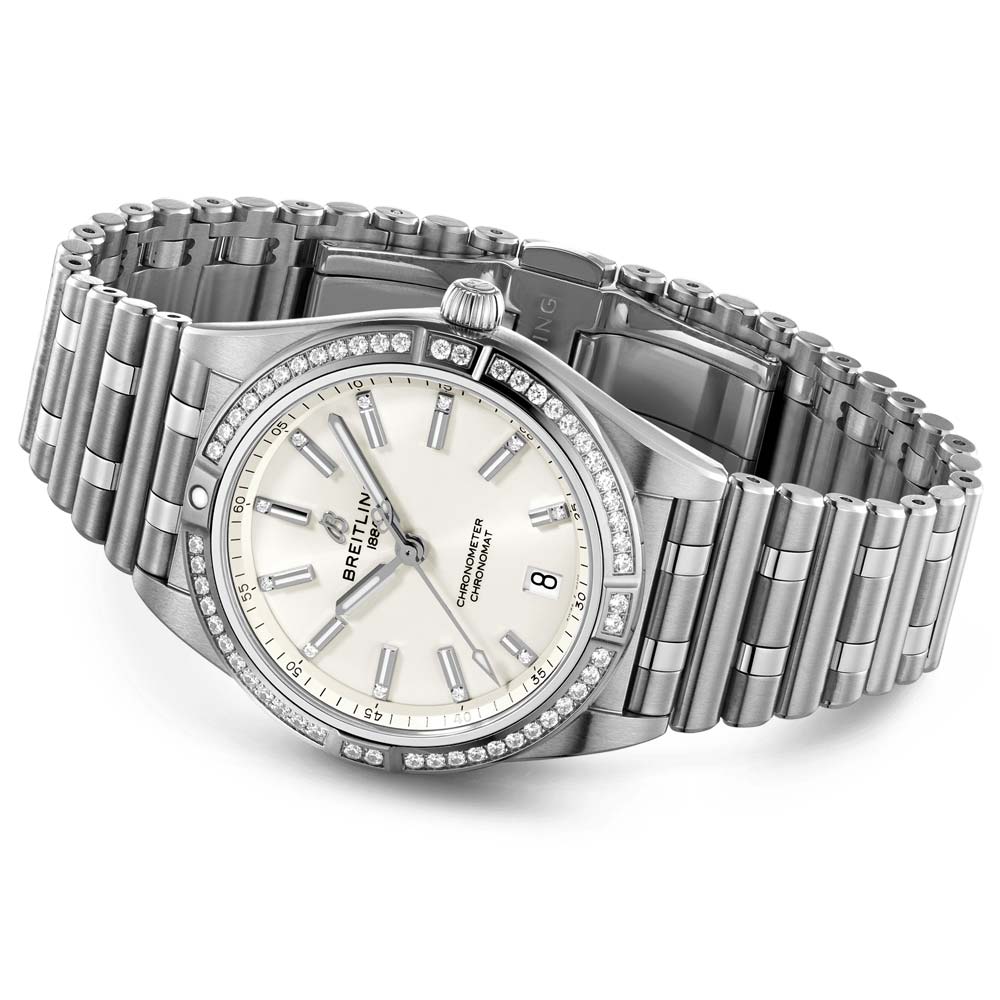 This modern-retro inspired Chronomat Automatic 36 is the perfect combination of style and elegance. Different metal options like stainless steel. bicolour. and luxurious 18ct red gold are available to choose from. while diamond-set bezels. indices. and vibrant dials add a touch of sparkle. Breitling's signature "Rouleaux" bracelet with a butterfly clasp offers comfort. and the watch is powered by the COSC-certified Breitling Calibre 10 chronometer.