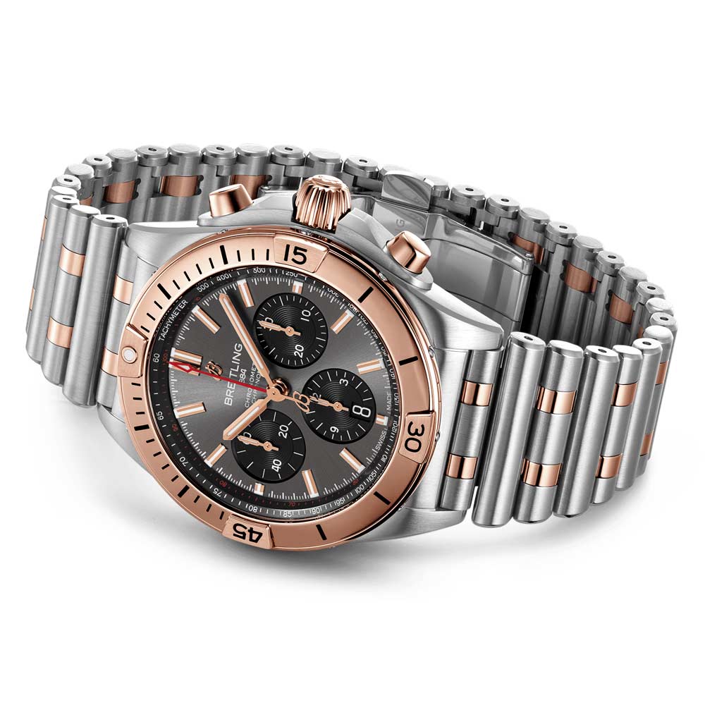 Crafted from intricate materials like stainless steel and 18ct rose gold. the Chronomat boasts a 42mm case and the now-iconic bezel with four rider tabs. Finishing touches include a selection of black. blue. silver and copper dials. the renowned "Rouleaux" bracelet and the Breitling Calibre 01. a COSC-certified chronometer.
