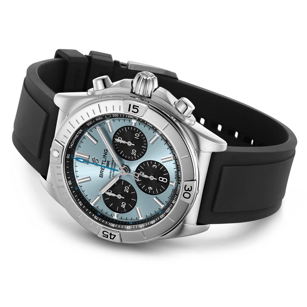 Breitling's Chronomat holds a special place in the brand's history. Originally released in 1984. it was designed as an alternative to thin quartz watches. It was based on the Frecce Tricolori chronograph. which was created in partnership with an Italian aerial squadron and celebrated Breitling's centenary. This version is 42mm with a stainless steel case and platinum bezel. and a striking Ice Blue dial. Powered by the COSC-certified Breitling Manufacture Calibre 01. it is only available with a rubber strap.