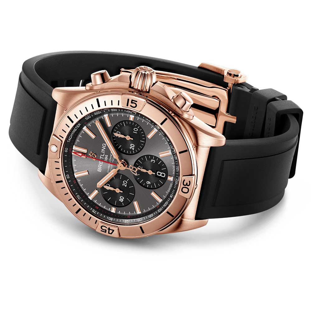 The Chronomat showcases a 42mm case with the traditional four rider tabs on its bezel. Combining 18ct rose gold and an anthracite dial. the watch is appointed with a black rubber strap and driven by the Breitling Manufacture Calibre 01 -- a COSC-certified chronometer.