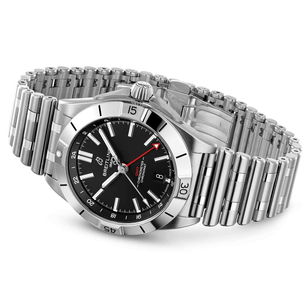 The Chronomat Automatic GMT 40 is Breitling's classic homage to globetrotting. An understated dial. stainless-steel case/bracelet. and tone-on-tone 24-hour scale create an ideal backdrop for the bright red GMT hand. making this watch an ideal addition to any ensemble.