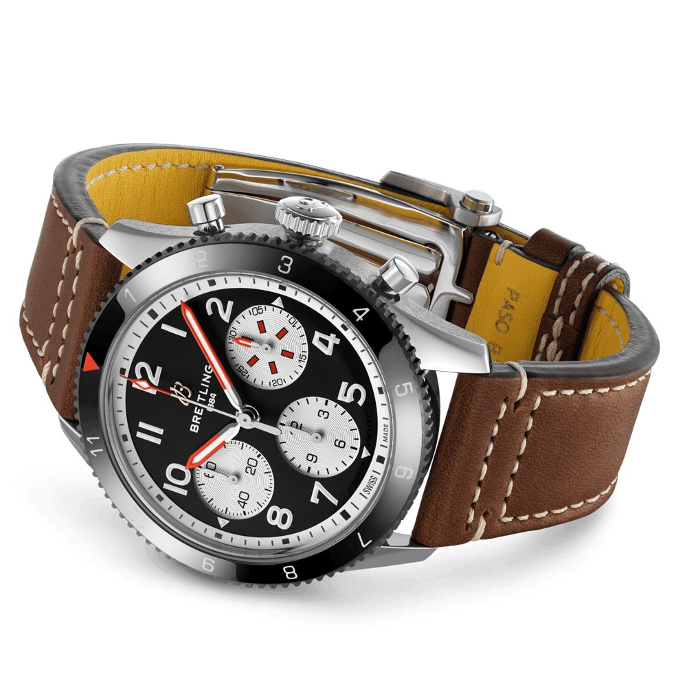 Designed with the rigors of a vintage cockpit in mind. the 42mm Classic AVI Mosquito boasts large and easy-to-read Arabic numerals on the dial and bezel. An ergonomic knurled bezel ensures maximum grip. even when wearing gloves. Timeless details like its top-stitched calfskin straps and stylish stainless-steel bracelet pay homage to aviation history. Accurate Breitling Caliber 23 movement provides a 48-hour power reserve. making it an ideal choice for pilots and other travelers.