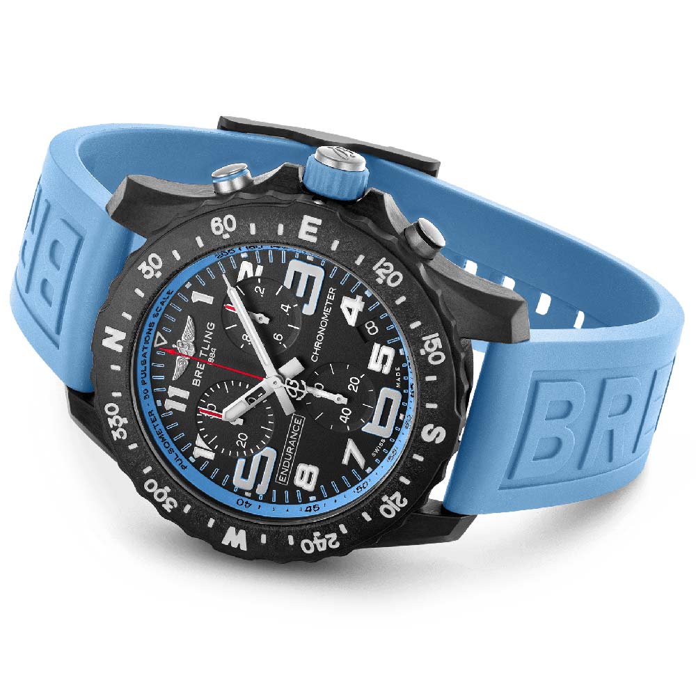 The Endurance Pro boasts a Breitlight® case that weighs in at just 3.3x lighter than titanium and 5.8x lighter than stainless steel �?all while remaining non-magnetic. hypoallergenic. and virtually scratchproof. It offers a unique feel. warmer than metal plus a subtle textured finish. Plus. it's wholly Swiss-made with colorful dial and rubber straps; plus the option to pair with a colorful ECONYL® yarn single-piece strap. The Endurance Pro is powered by Breitling's Calibre 82 �?a COSC-certified SuperQuartz�?chronograph that grants outstanding accuracy.