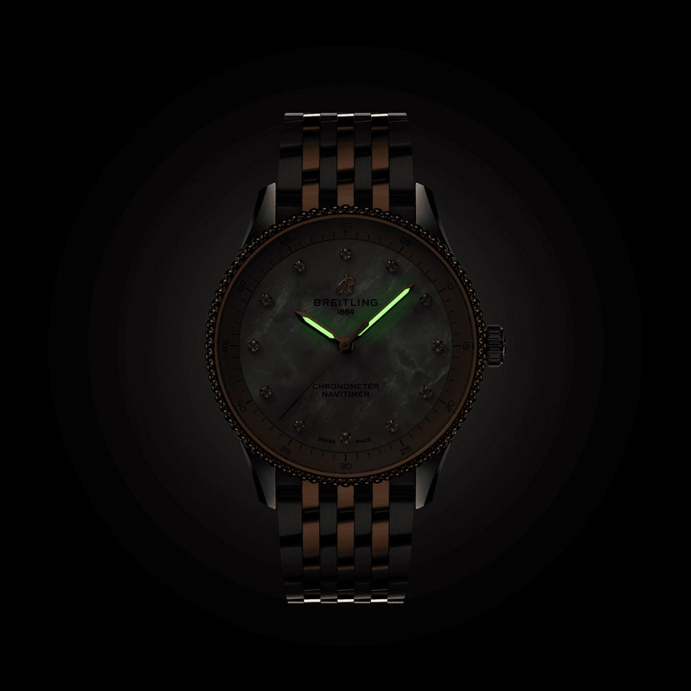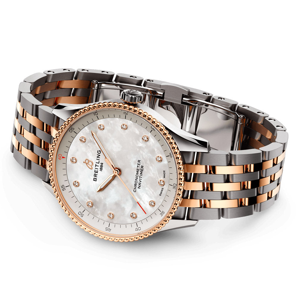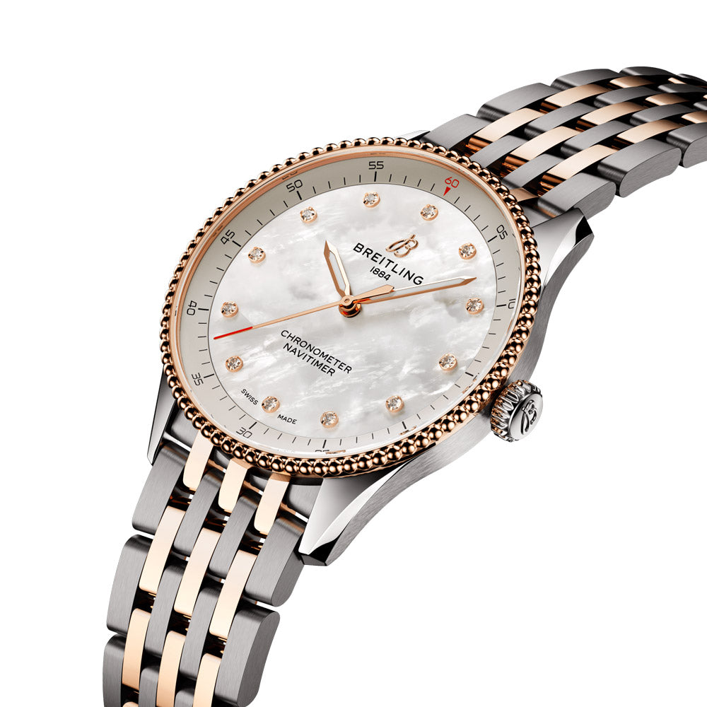 The Navitimer. a timeless masterpiece by Breitling. is renowned for its connection to the infinite voyage of life. Since its beginnings in 1952 as an essential tool for pilots. it has become an embodiment of significance for all those who have experienced its presence on their personal journeys. Now available in 36 and 32 mm sizes. this iconic timepiece caters to both men and women who prefer a smaller diameter watch. While the 36-mm version preserves its unmistakable beaded bezel and circular slide rule. the sleeker 32 mm model boasts a simpler dial design. specifically designed for its slim frame. But beyond their resized proportions. these prominent watches exude their own unique charm with accents of delicate colors. lustrous mother of pearl. and authentic materials. all wrapped in refined elegance that elevates their legendary navigational purpose. Whenever and wherever your voyage may take you. this Breitling icon is always ready to accompany you in style.