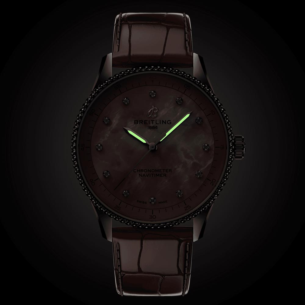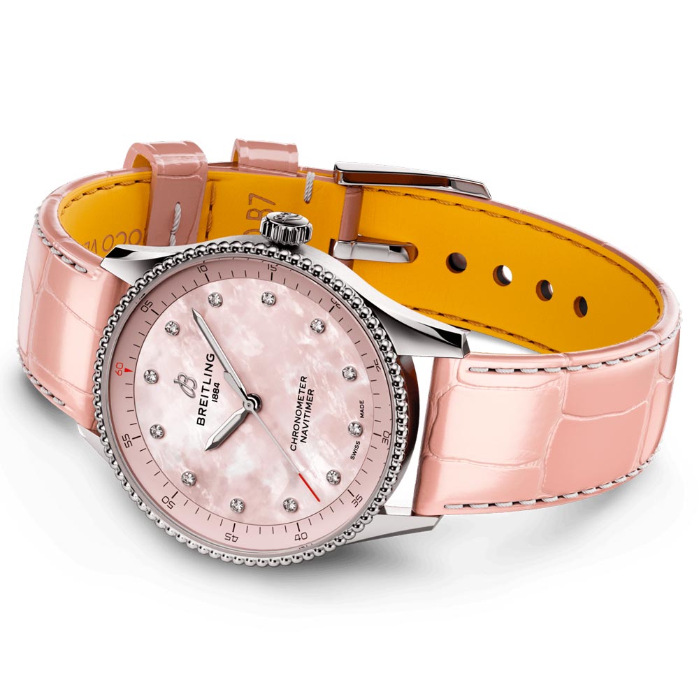 The iconic Navitimer from Breitling has been heralded by watch collectors as one of the greatest creations of all time. Circling back to its beginning in 1952 as an instrument of convenience for pilots. the Navitimer now comes in 36 and 32 mm sizes ideal for those who desire the timeless look of a smaller watch. The 36 mm version displays the classic beaded bezel surrounding the celebrated slide rule. Meanwhile. the slender 32 mm style features a cleaner dial sans slide rule. But these striking watches have even more to savor. with a mix of soft hues. mother-of-pearl accents. and luxurious materials upping the jewelry-like aesthetics of the legendary navigational timepiece. It's the perfect piece for wherever your journey takes you.