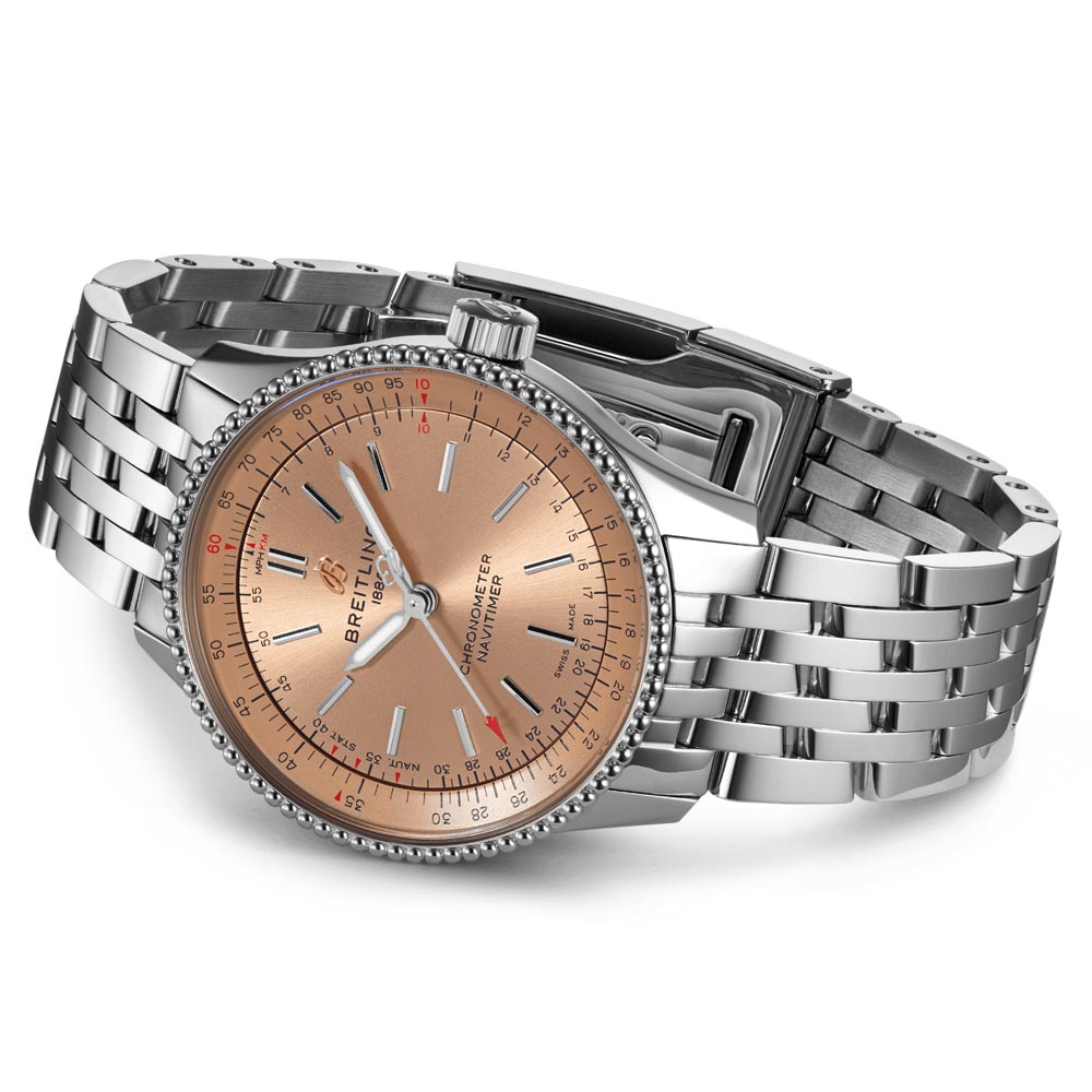 The Navitimer Automatic 35 offers the iconic charm of a vintage timepiece. updated with a sophisticated. refined style. Crafted with materials such as stainless steel and 18ct red gold. the 35mm case is beaded and adorned with a selection of silver. blue. copper. or diamond-set white mother-of-pearl dials. This piece can be accessorized with a matching bracelet or a luxe leather strap in blue. brown. or burgundy. and is held in place with either a stainless-steel pin or folding buckle. The model is powered by the certifiably precise Breitling Calibre 17.