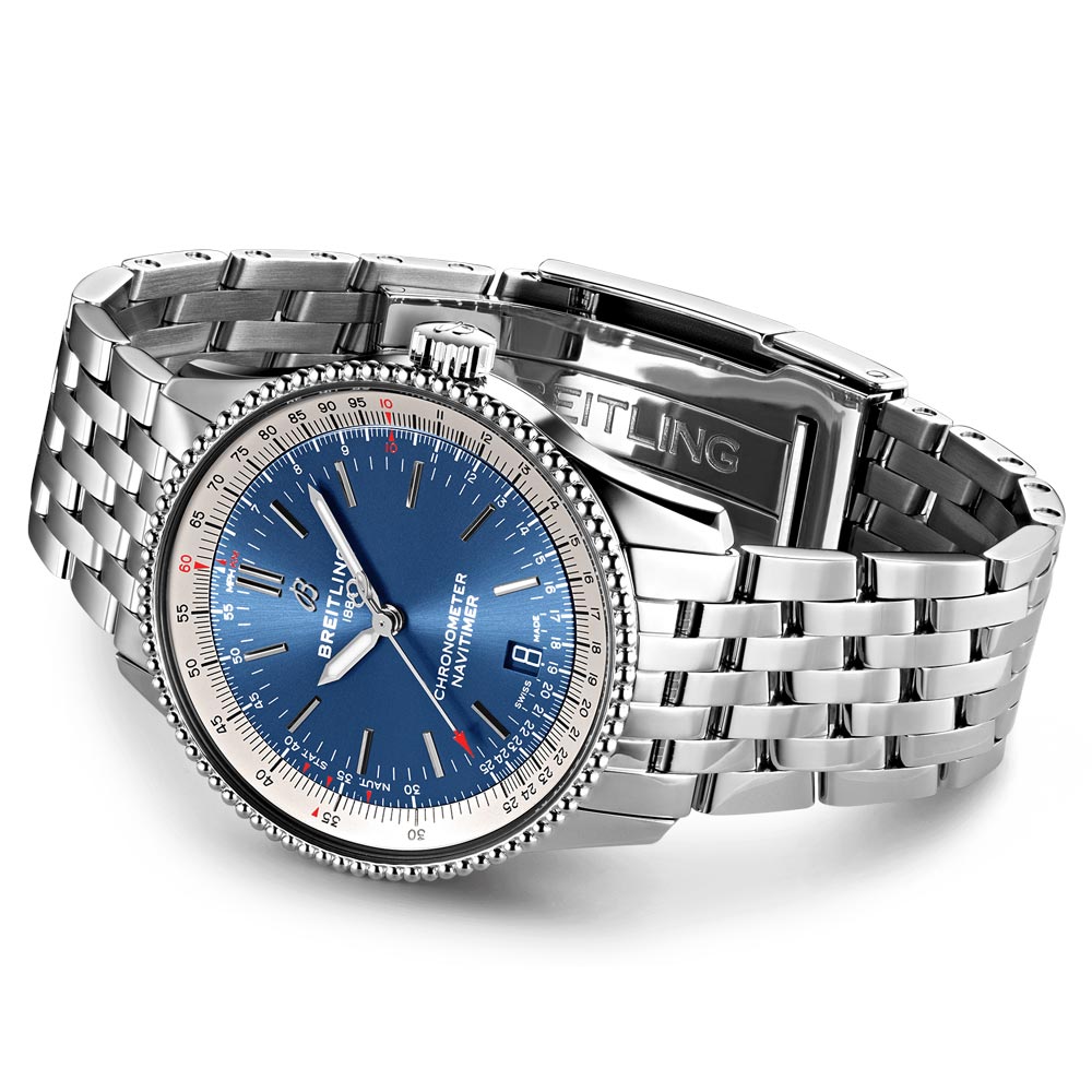 The Navitimer Automatic 38 is a sophisticated mixture of traditional style and modern design. The 38 mm case is available in either stainless steel or 18ct red gold with a beaded bezel. and the dial comes in black. blue. or silver. This watch also has the option of a matching bracelet or a strap of black. blue. or gold alligator skin secured with either a stainless-steel pin or folding buckle. The precise movements of this timepiece are powered by Breitling Calibre 17. an officially certified chronometer.