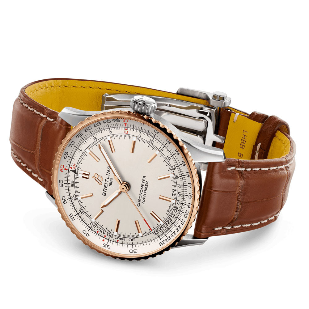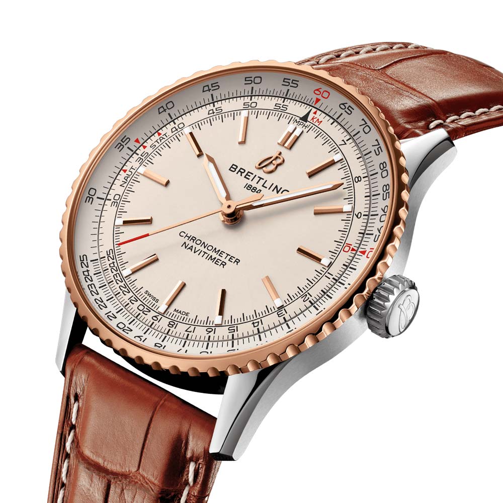 The inclusion of a notched bezel in the design adds a modern touch to the refined collection. while the combination of polished and brushed finishes creates an eye-catching play of light. Comfort and convenience are prioritized with the option of alligator leather straps and seamless butterfly clasps on bracelets. Choose from a selection of stainless steel or 18 k red gold cases. each featuring vibrant dials. This updated version of the Navitimer combines classic and contemporary elements. appealing to both enthusiasts and fashion-conscious individuals. showcasing Breitling's dedication to tradition and ingenuity in every timepiece.