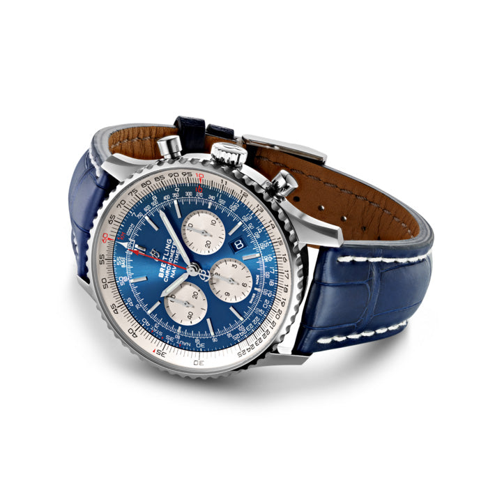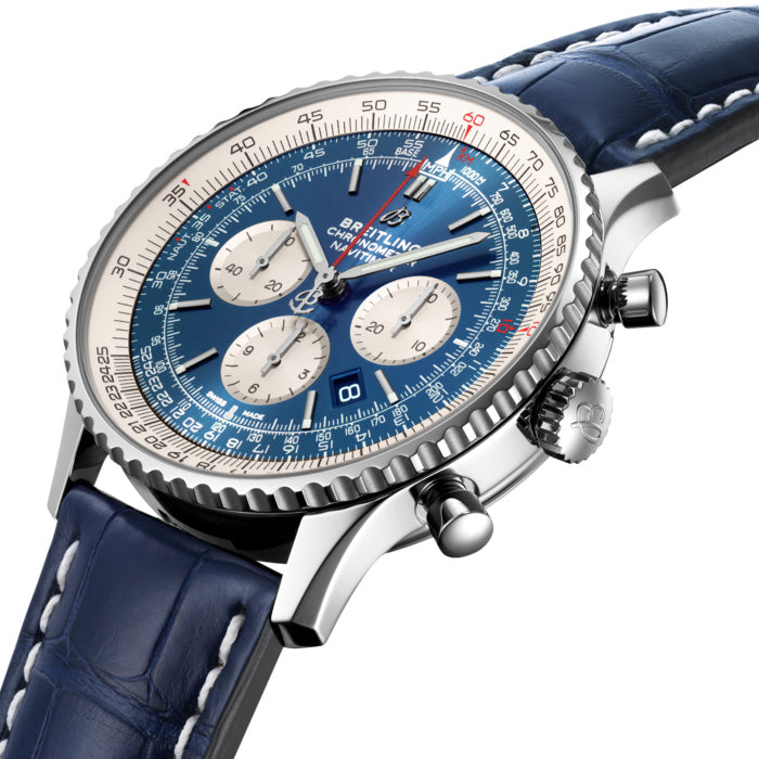 The prestigious Navitimer 1 has a 46mm diameter that emphasizes style and optimizes the readability of its dial and slide rule. Through a transparent back. the Breitling Calibre 01--a high-performance. chronometer-certified self-winding chronograph caliber--is showcased. Available in stainless steel. steel & gold. and red gold. this model is the ideal embodiment of the Navitimer legend.