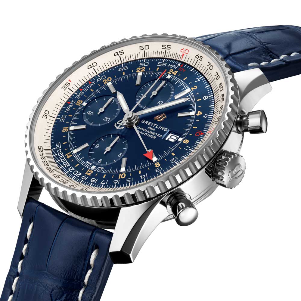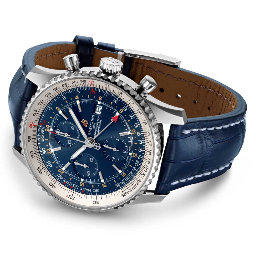 With its blue dial and easily legible dual timezone system. the Navitimer Chronograph GMT 46 is designed for the modern traveller. A red-tipped additional central hand can display the time (on a 24-hour scale) at any destination and the caseback is engraved with the time zones of the world's major cities. Its 46 mm stainless steel case is complete with a bidirectional rotating bezel and Breitling's iconic circular slide rule for onboard calculations. Powered by a self-winding Breitling 24 calibre. this sophisticated tool watch is presented on a black alligator or leather strap. or Navitimer stainless steel bracelet.