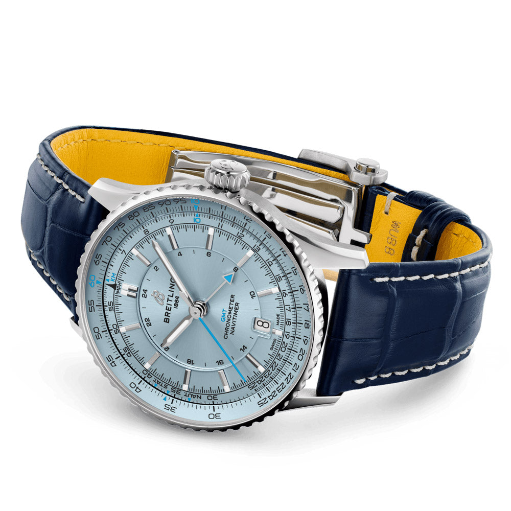 The Breitling Navitimer GMT 41mm Ice Blue Dial Automatic Gents Watch A32310171C1P1 is a versatile timepiece. cherished by collectors as one of the most iconic watches ever created since its debut in 1952 as a tool for pilots. Its central 24-hour scale on the GMT and clean face on the Automatic versions perfectly balance the intricate slide rule. while the notched bezel adds a modern touch and the polished and brushed finishes create a striking contrast. Available with colorful dials in stainless steel or 18k red gold. this reinvention of the Navitimer seamlessly merges the classic with the contemporary. catering to both enthusiasts and those with a keen sense of style. while upholding Breitling's dedication to tradition and innovation in every watch.