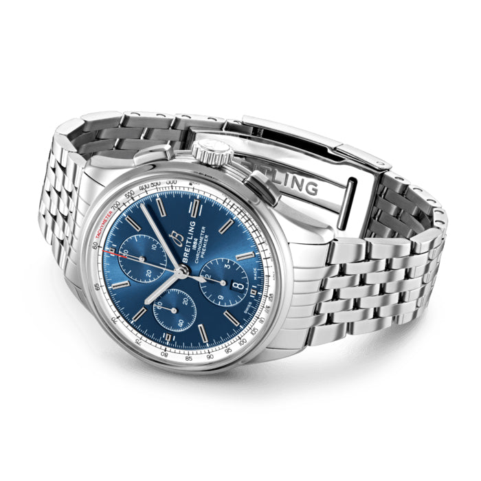 This Premier chronograph showcases an eye-catching blue dial and 42mm stainless steel case. presented upon a timeless seven-row stainless steel bracelet. Further adorned with blue sub-dials for 30-minute and 12-hour chronograph readings. and a quarter-second hand situated at 12 o'clock. 6 o'clock and 9 o'clock. the watch is powered by Breitling Calibre 13. a self-winding. chronometer-certified chronograph movement. This model also comes with a brown leather strap alternative. perfectly encapsulating the Breitling Premier's timeless elegance.
