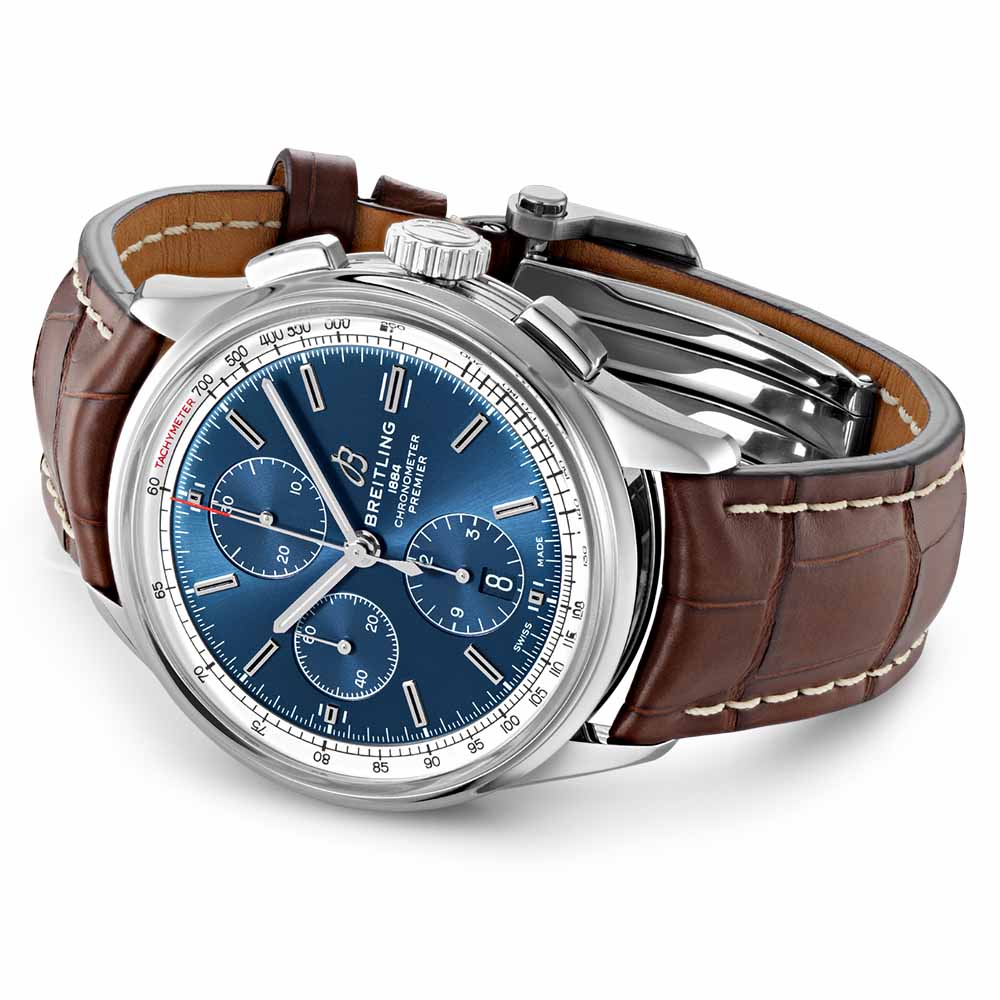 The Premier Chronograph 42mm by Breitling is a modern iteration of the first watch dedicated to style created by Willy Breitling in the 1940s. Crafted with grooves on the side of the case and rectangular pushers. this elegant timepiece is "a watch of impeccable taste". It is COSC-certified and powered by the Breitling Calibre 13. The classic design is available with a stainless steel case and a black or blue dial. With a choice of bracelet. alligator. or nubuck calfskin leather strap. this Premier is perfect for any occasion.
