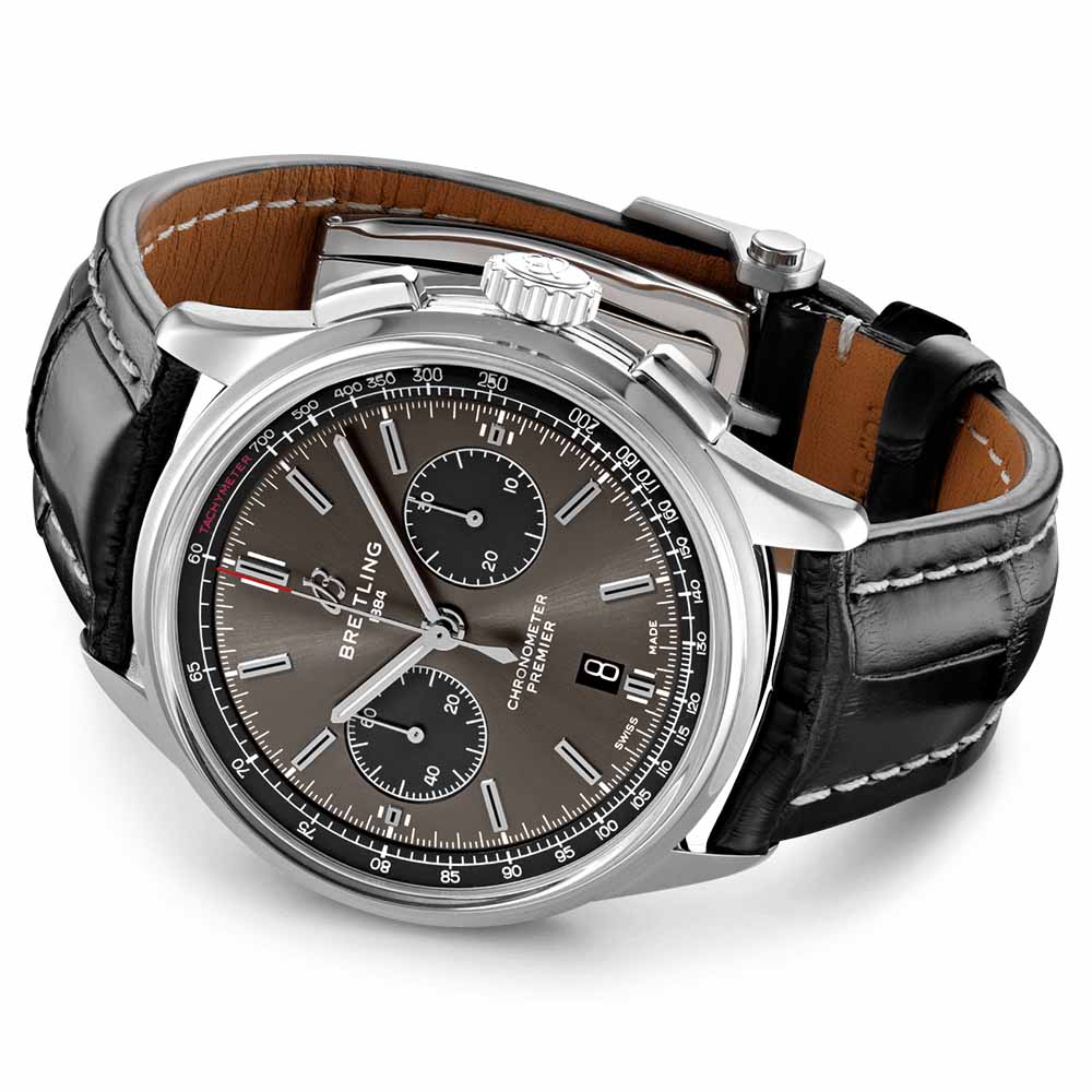 The Premier. designed by Willy Breitling in the 1940s. is the brand's first timepiece dedicated solely to style. This reinterpretation retains details such as rectangular chronograph pushers. bi-compax chronograph panda look. grooves on case-side. and sapphire caseback. The 42mm watch is offered in a selection of dial colours and with steel or 18ct gold cases. It comes with a matching bracelet. leather strap. and is powered by the in-house COSC-certified Calibre 01 chronometer. A watch of impeccable taste. the Premier has enjoyed lasting popularity.