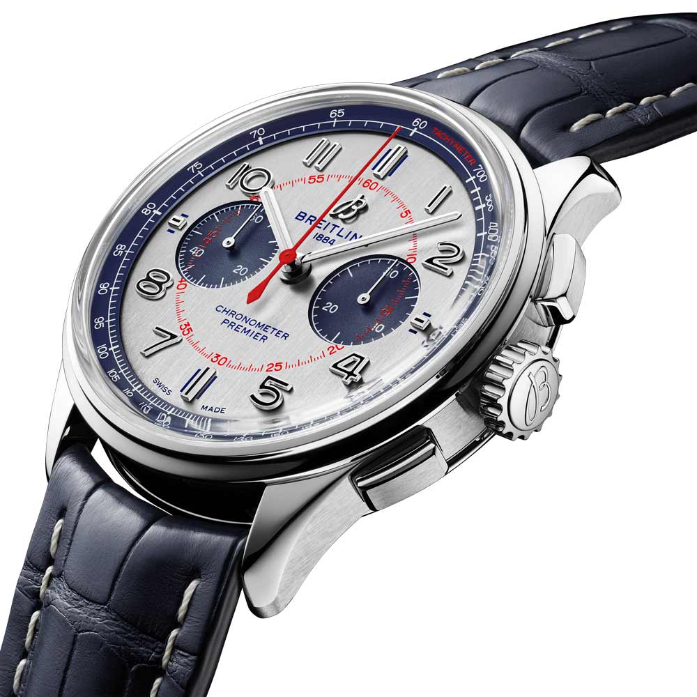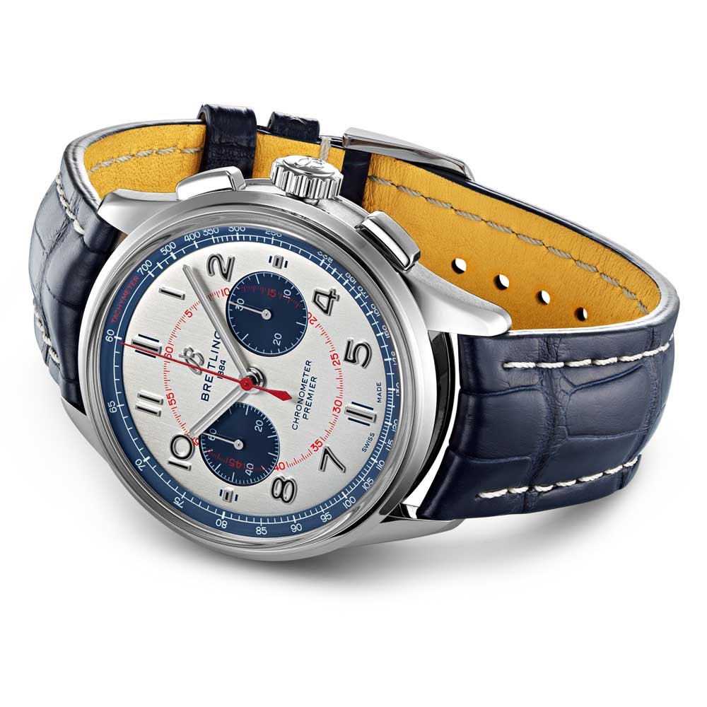 The Breitling Premier B01 Chronograph 42mm Bentley Mulliner Limited Edition Automatic Gents Watch AB0118A71G1P1 shares its numerals with the interior Breitling clock of the luxury GT. and its brushed silver dial mirrors the dashboard clock. The blue leather strap and blue & red accents create a unified design that pays homage to the car's interior. On the left side of the case. an engraved “Bentley�?inscription replicates an engine spin dashboard found in vintage Bentleys.