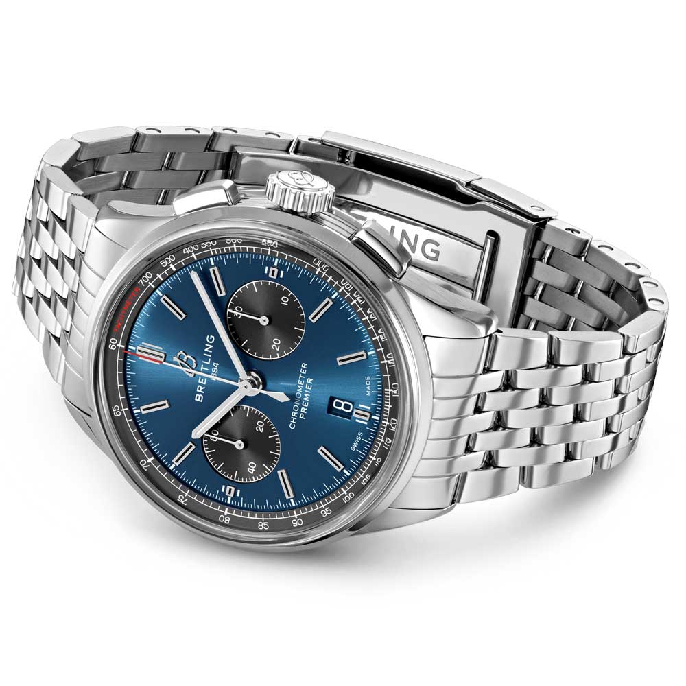 This Premier B01 Chronograph boasts a 42mm stainless steel case with a blue dial and black chronograph counters. showcasing the Manufacture mechanical movement. Behind its transparent sapphire caseback lies the Breitling Calibre 01 self-winding. high-performance chronometer-certified chronograph. complete with a five-year warranty. Representing the Breitling Premier name with elegance and performance. the watch features a seven-row stainless steel bracelet and leather strap.