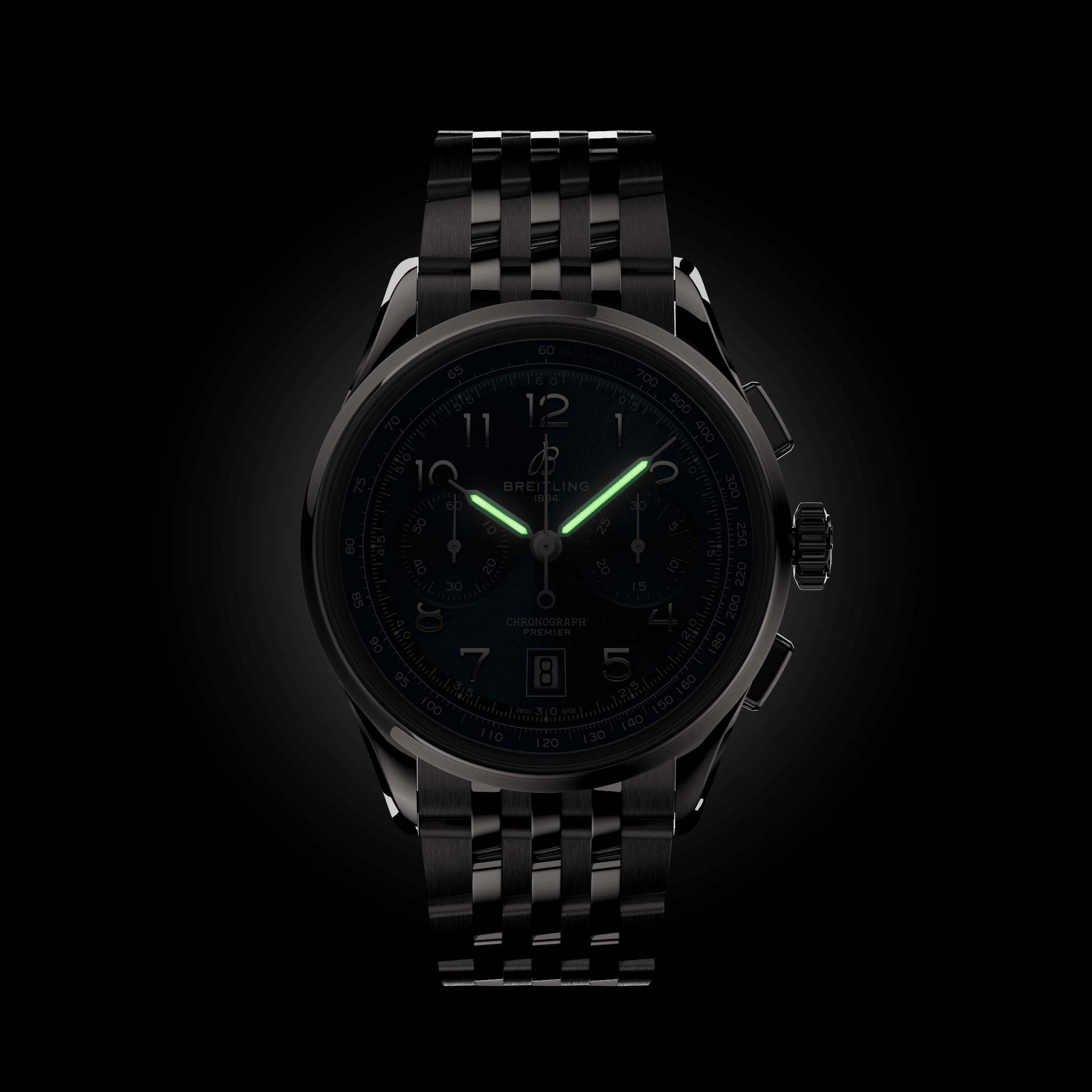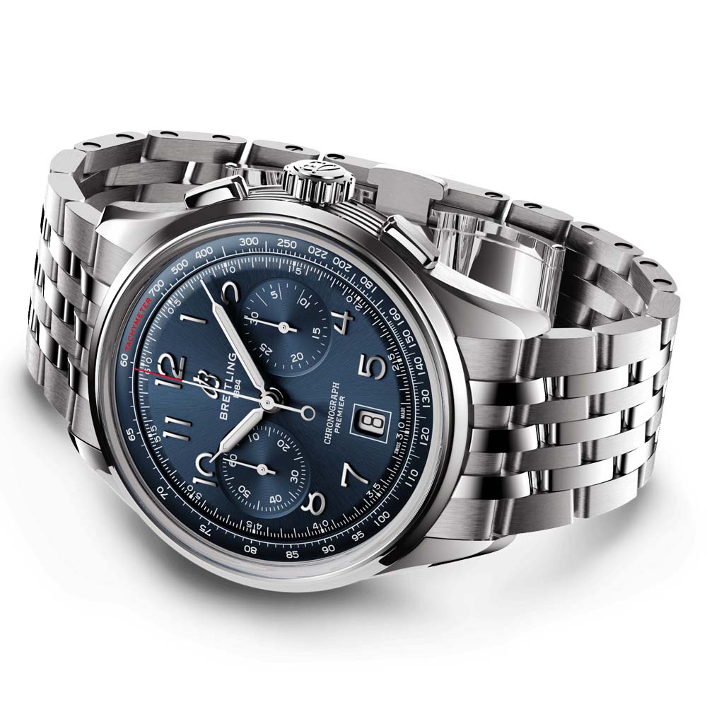 In the early 1940s. Willy Breitling envisioned a chronograph that combined maximum function and sophisticated style. He dubbed the result the Premier line. which still features today the smooth fixed bezel. twin-register dial. and applied Arabic numerals of its vintage iterations. Pushers are streamlined rectangular in shape to bring a modern touch.