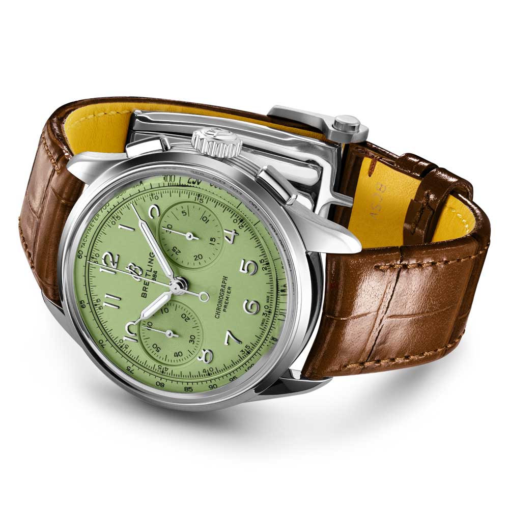 The Breitling Premier Heritage B09 Chronograph 40mm boasts a sophisticated style with rectangular chronograph pushers. bi-compax chronograph look and Arabic numerals. Its grooves on the case-sides. open sapphire casebacks and vintage-inspired hands are a testament to its classic design. This timepiece is available in two variations: stainless steel with a pistachio green dial and a gold brown alligator strap. or 18ct red gold with a silver dial and a brown leather strap. Its COSC-certified Breitling Manufacture Calibre B09 provides reliable and accurate timekeeping.
